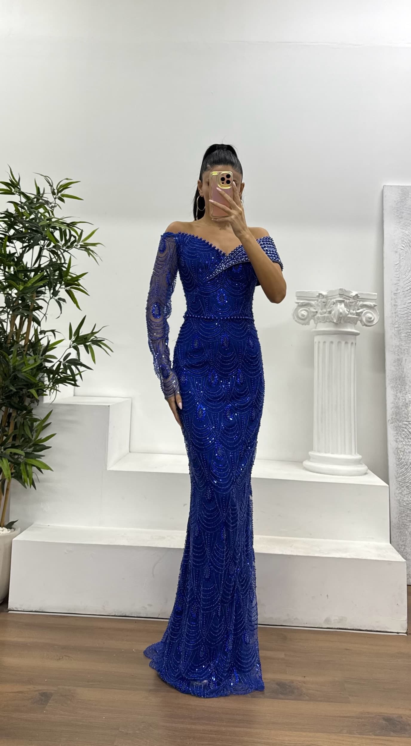 Saks Asimetrik Yaka İşlemeli Abiye Elbise