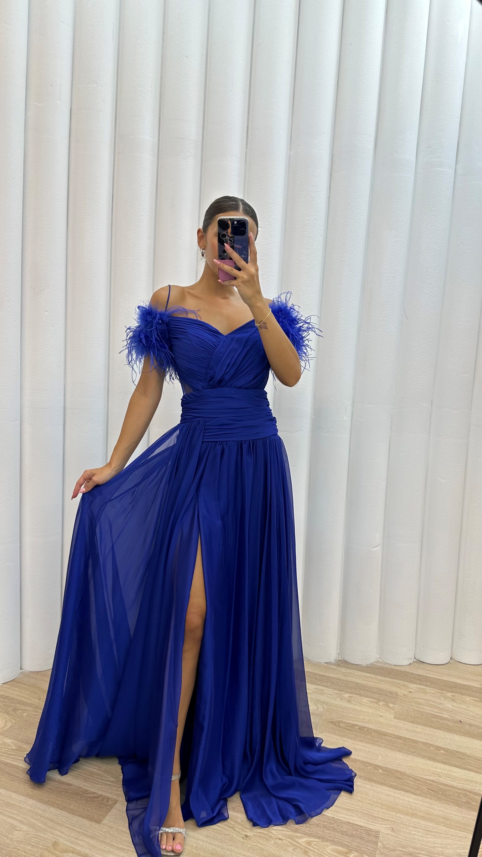 Saks İp Askılı Omuzları Tüylü Tül Abiye Elbise