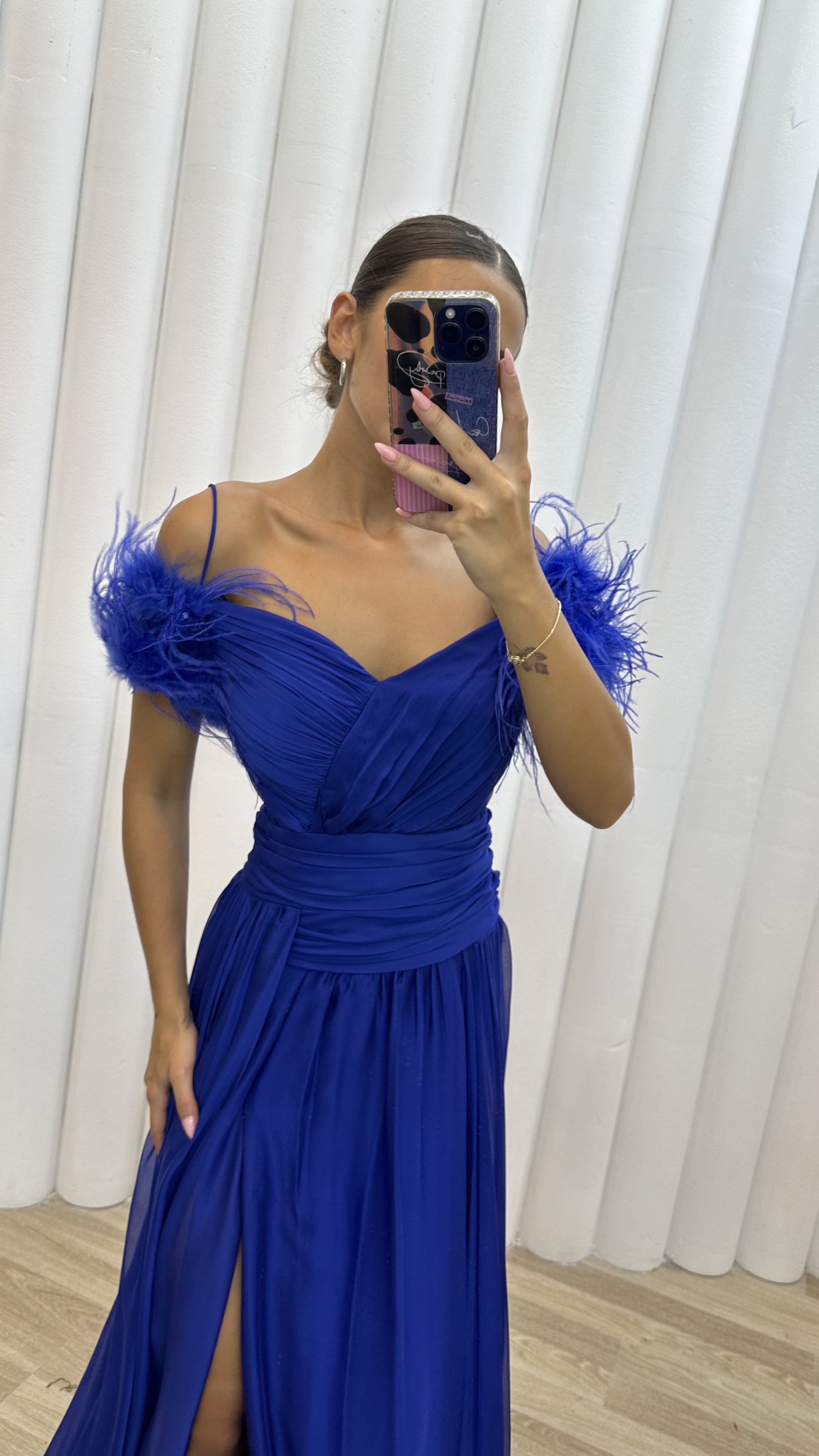 • Mavi İp Askılı Omuzları Tüylü Tül Abiye Elbise