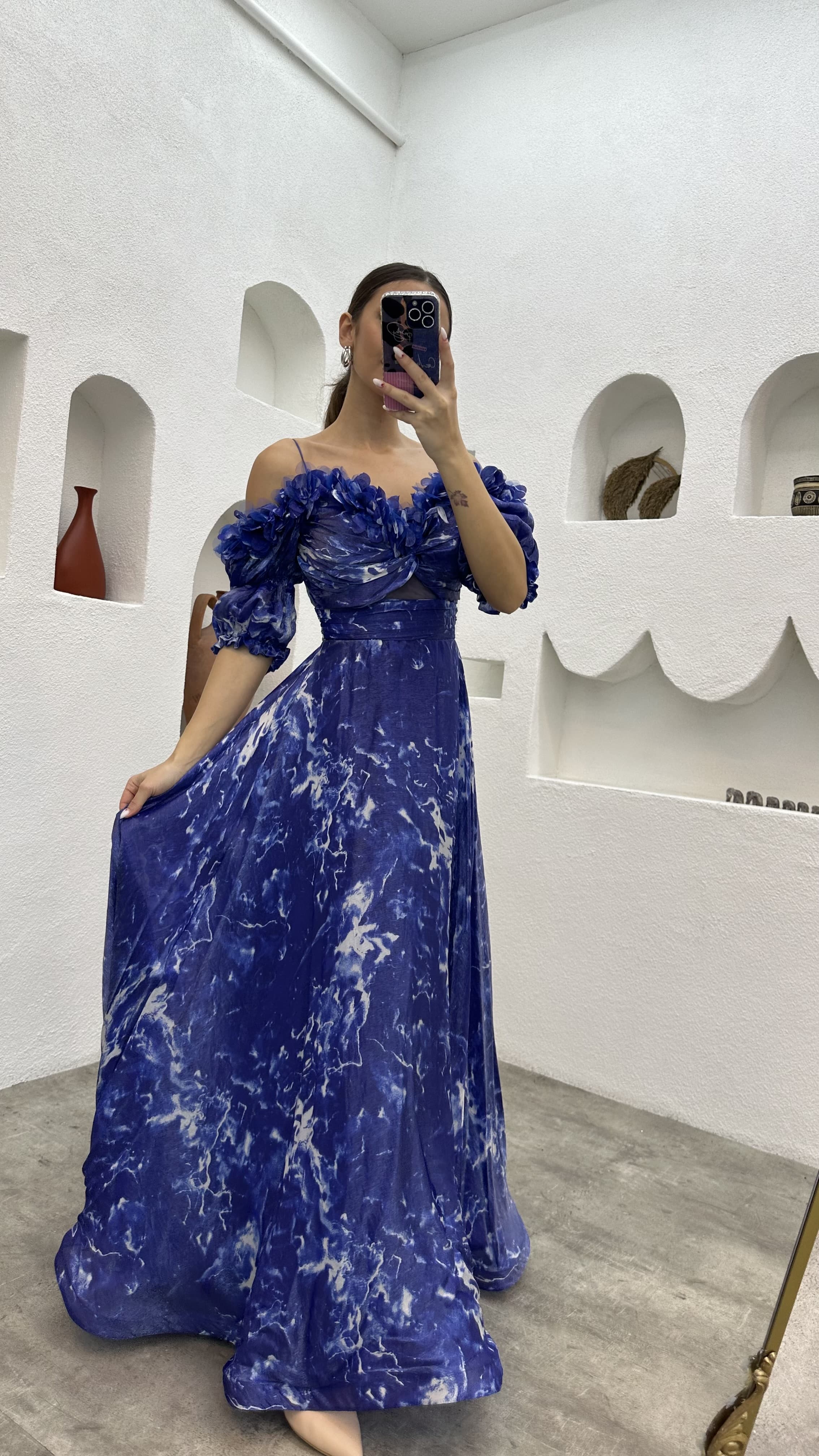 • Saks İp Askılı Volanlı Desenli Abiye Elbise