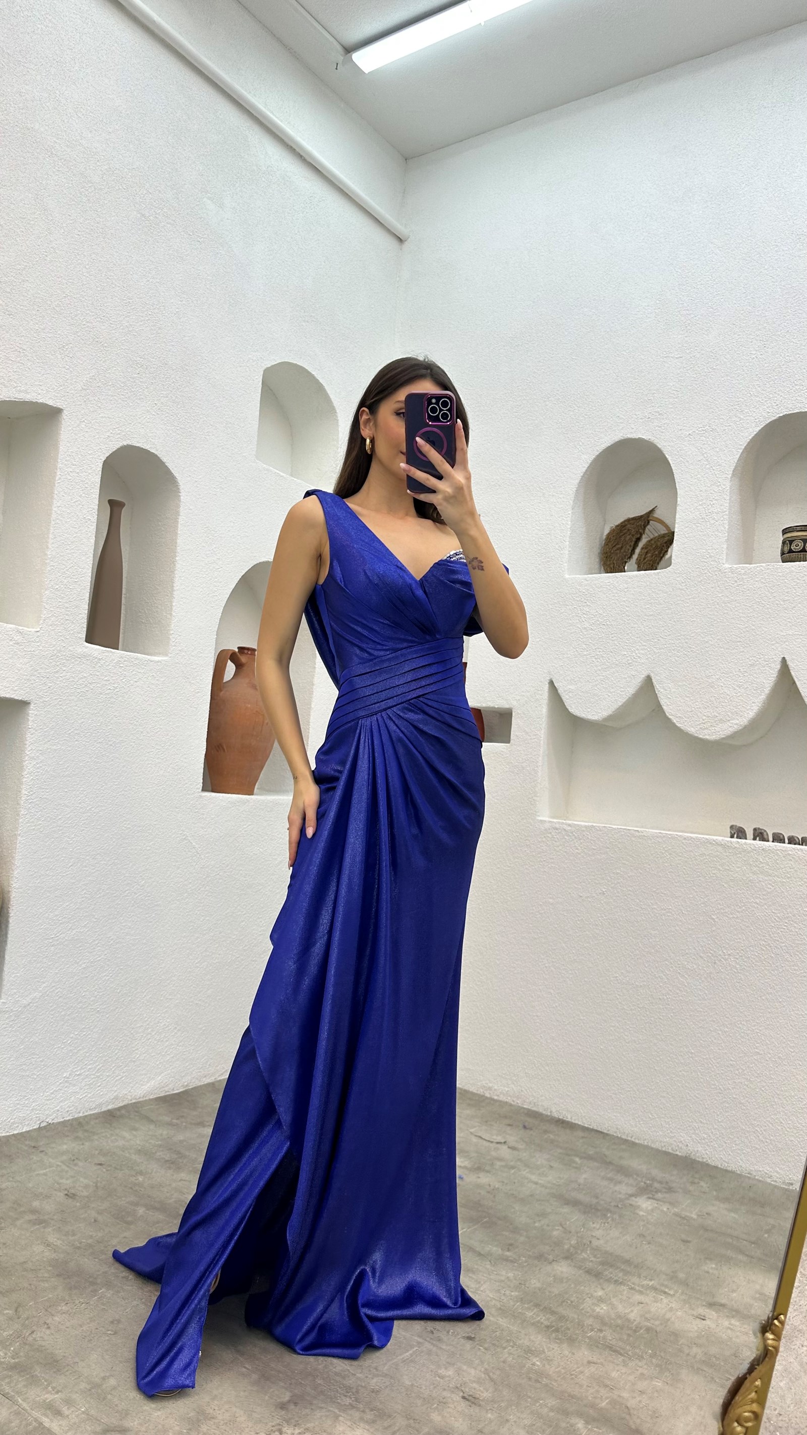 • Saks İşlemeli Drapeli Saten Abiye Elbise