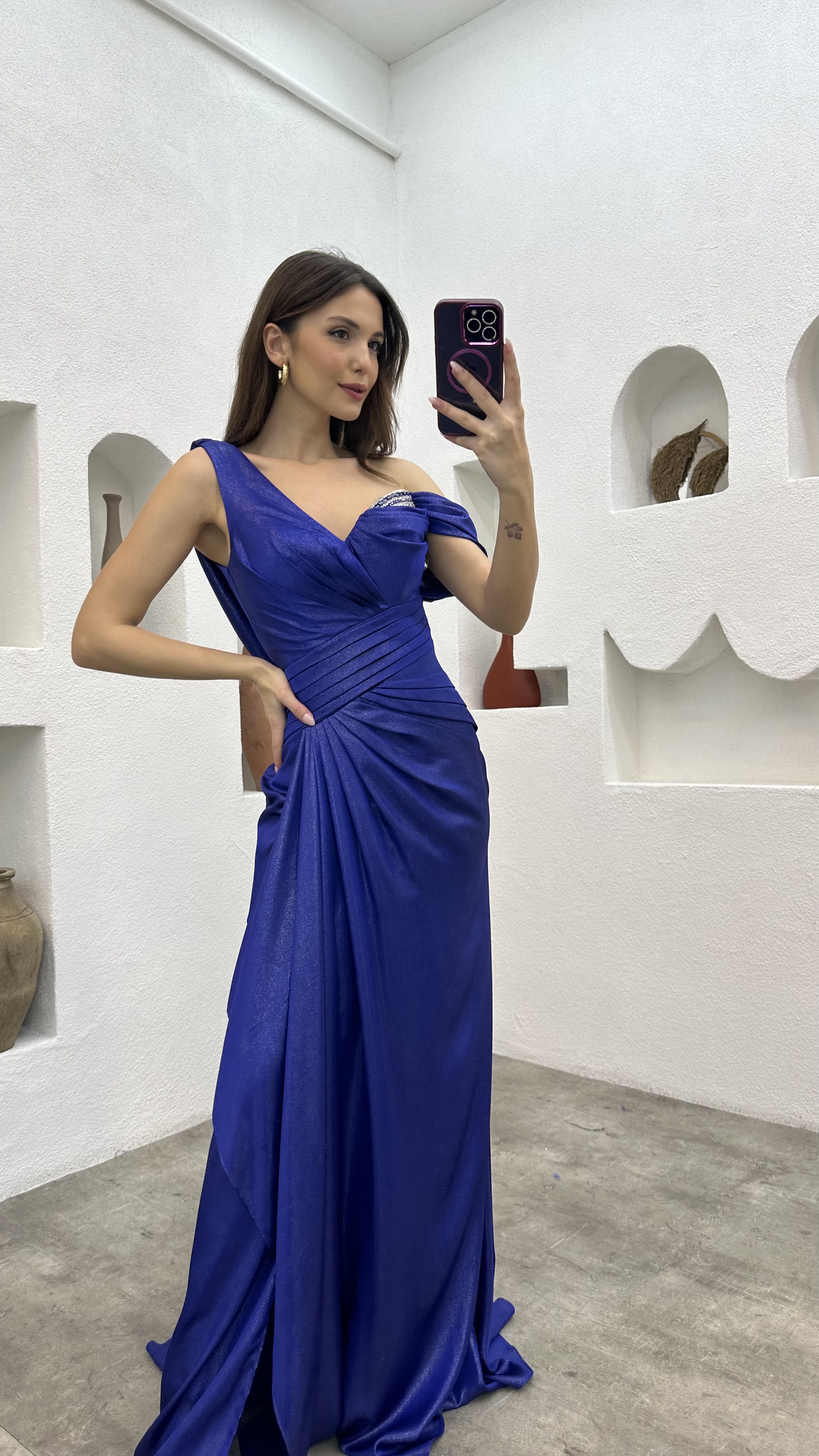 Saks İşlemeli Drapeli Saten Abiye Elbise