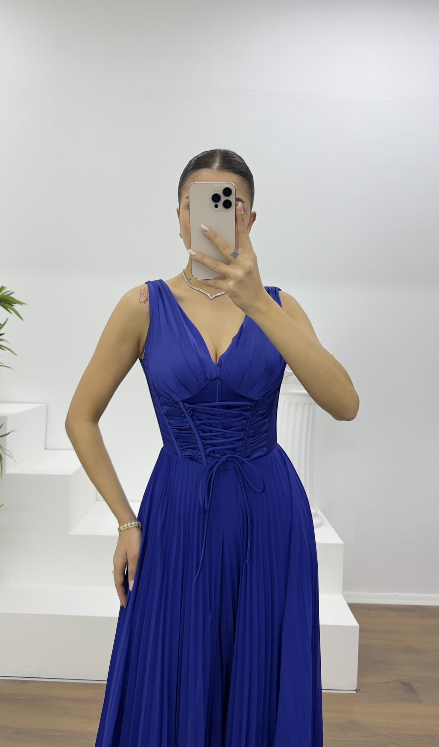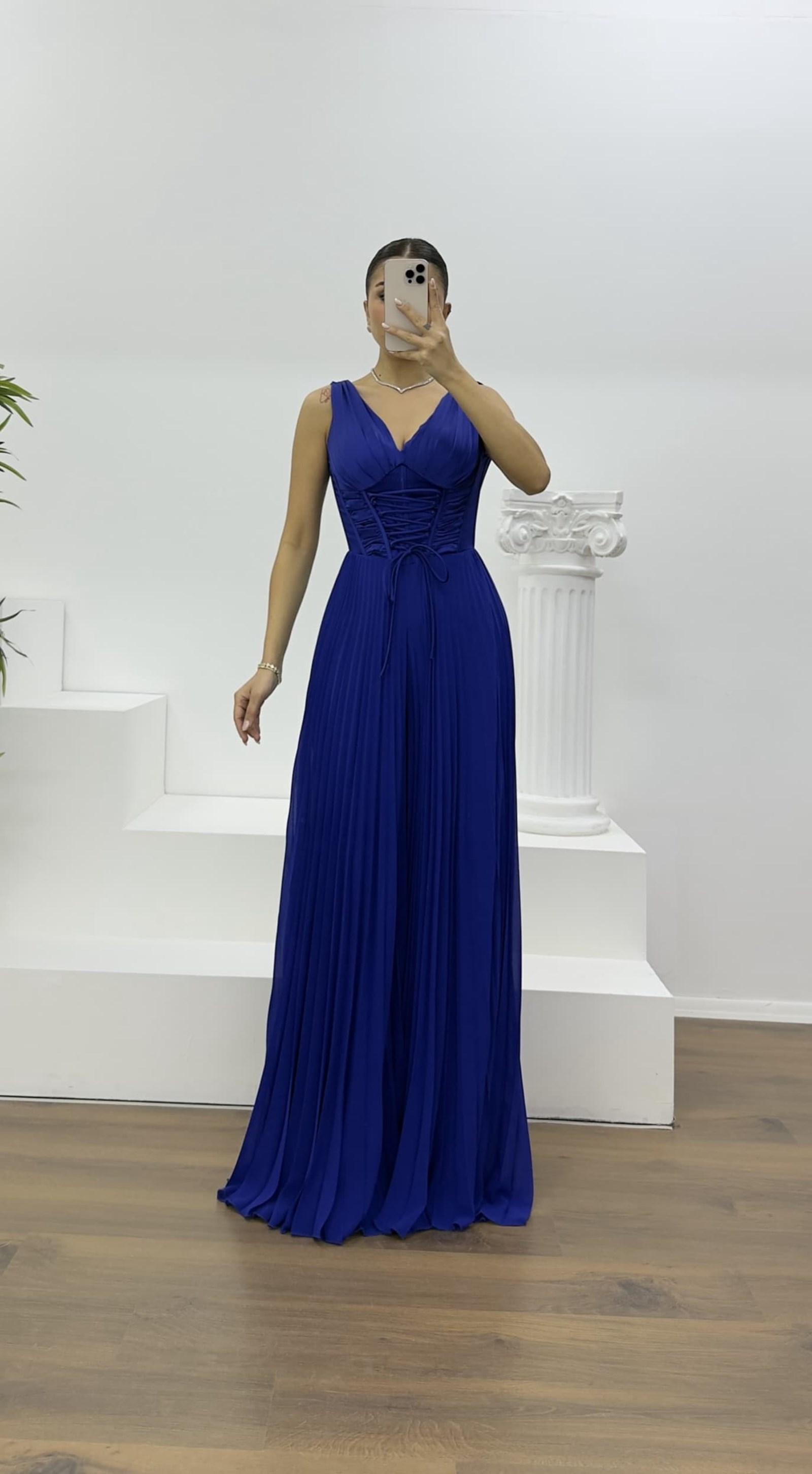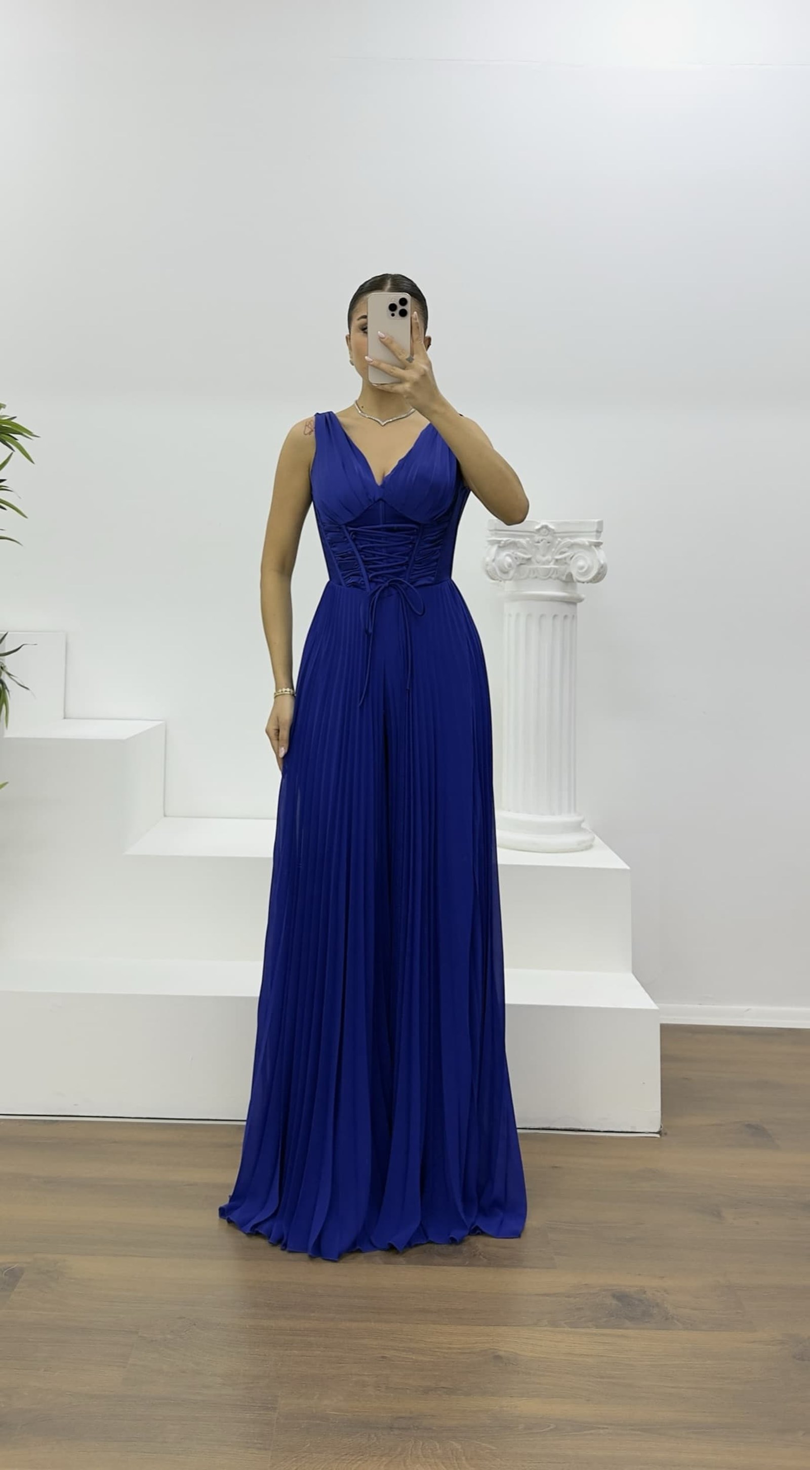 Saks Korse Detay Pliseli Abiye Tulum