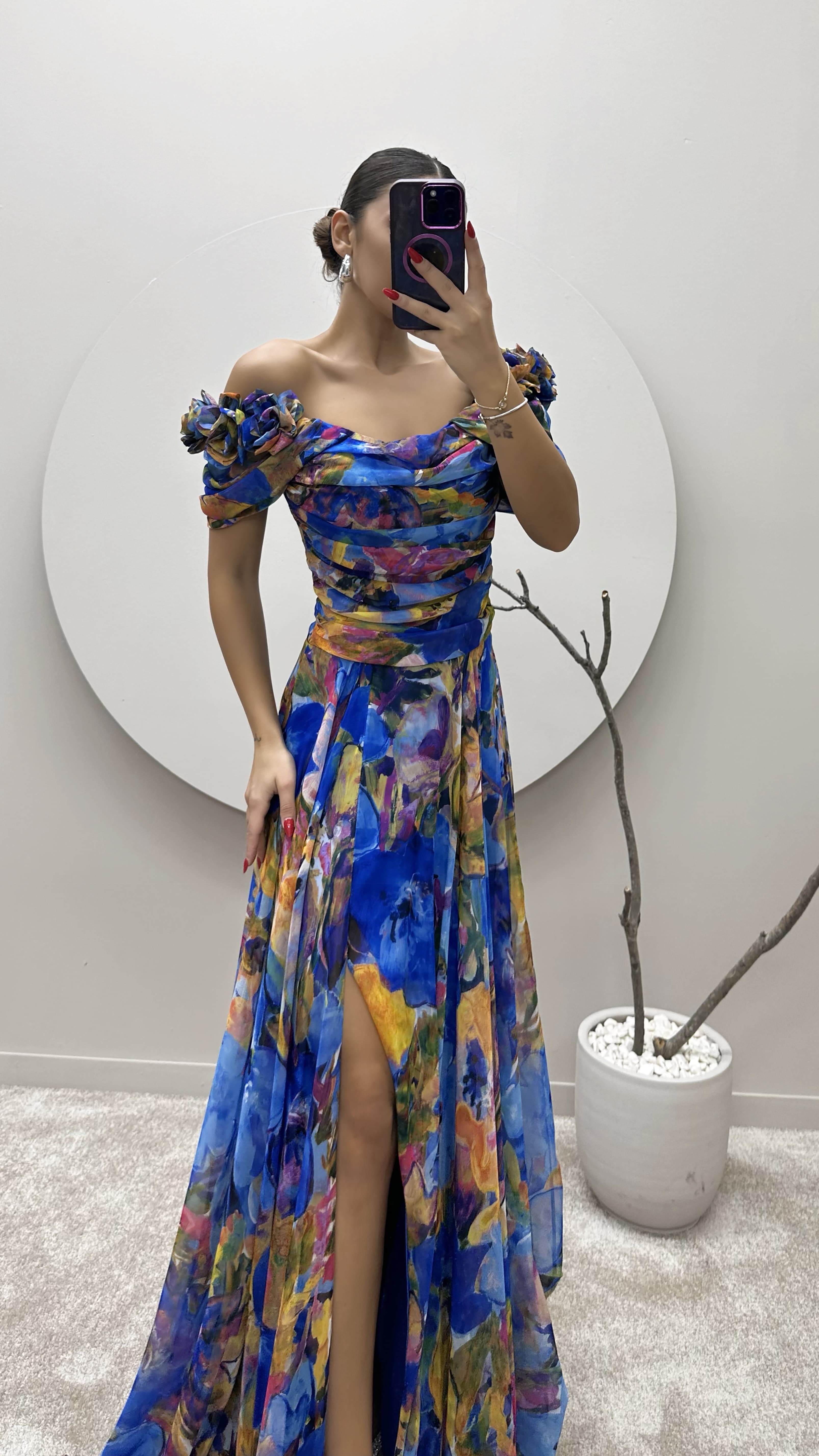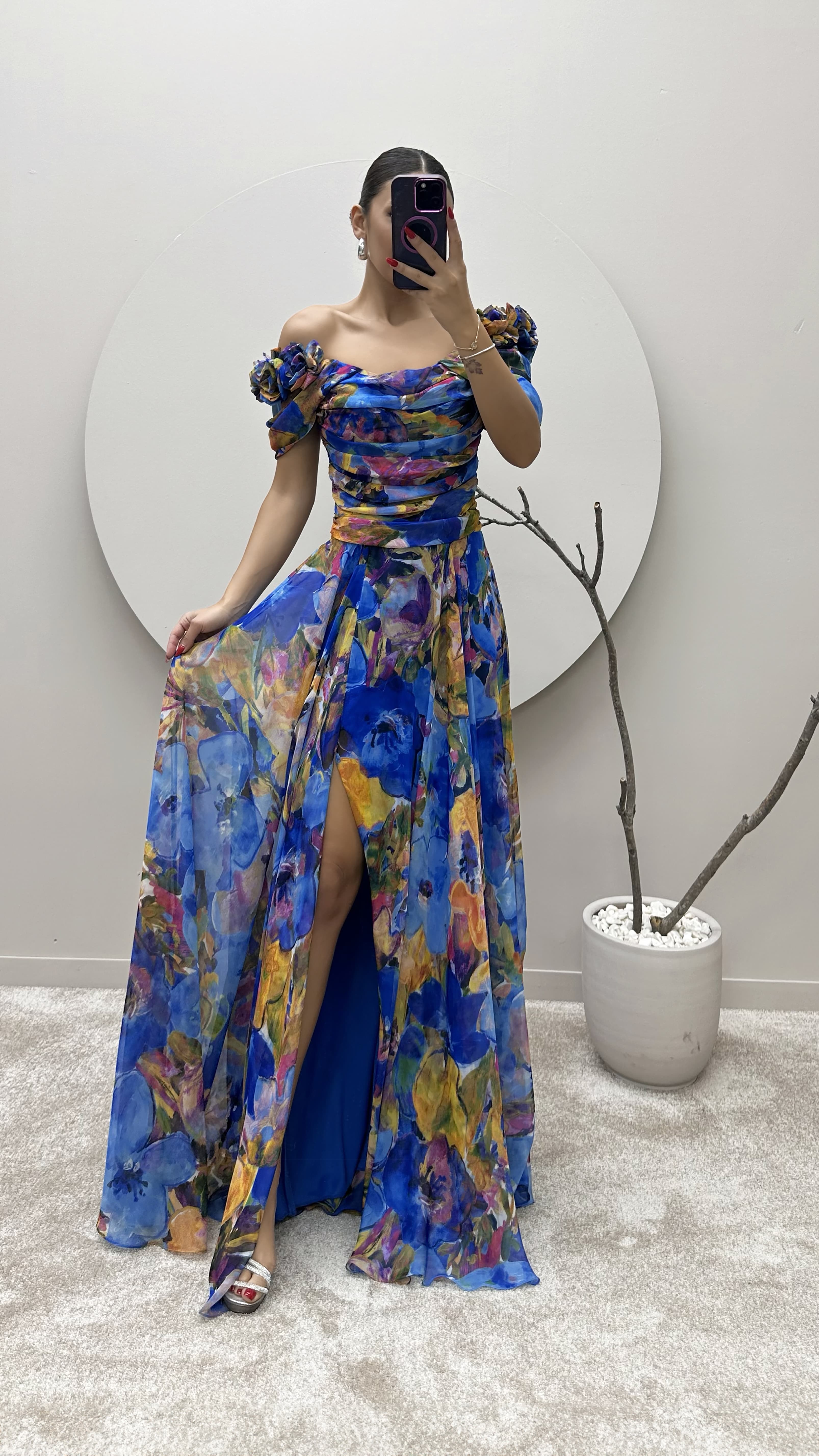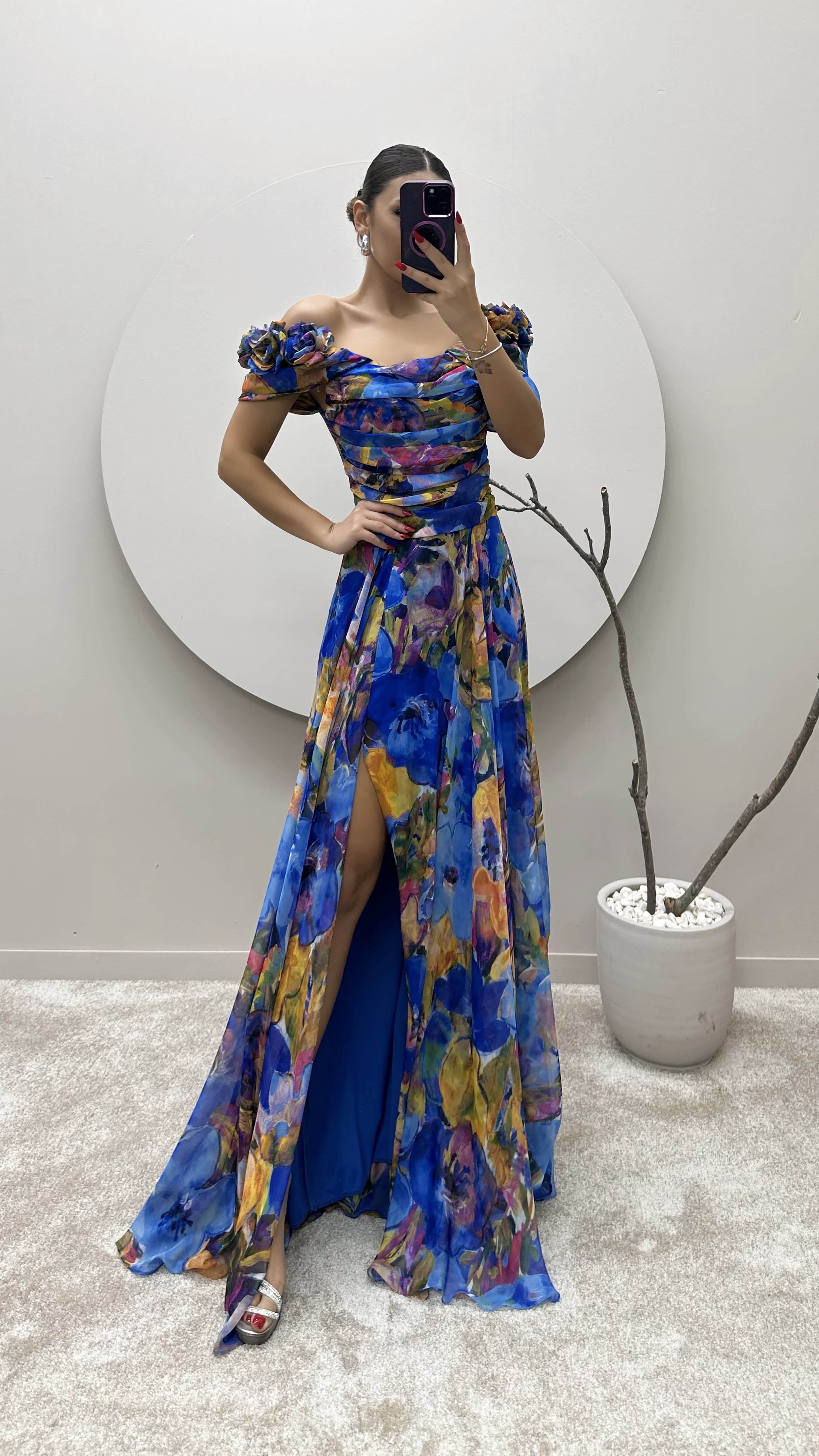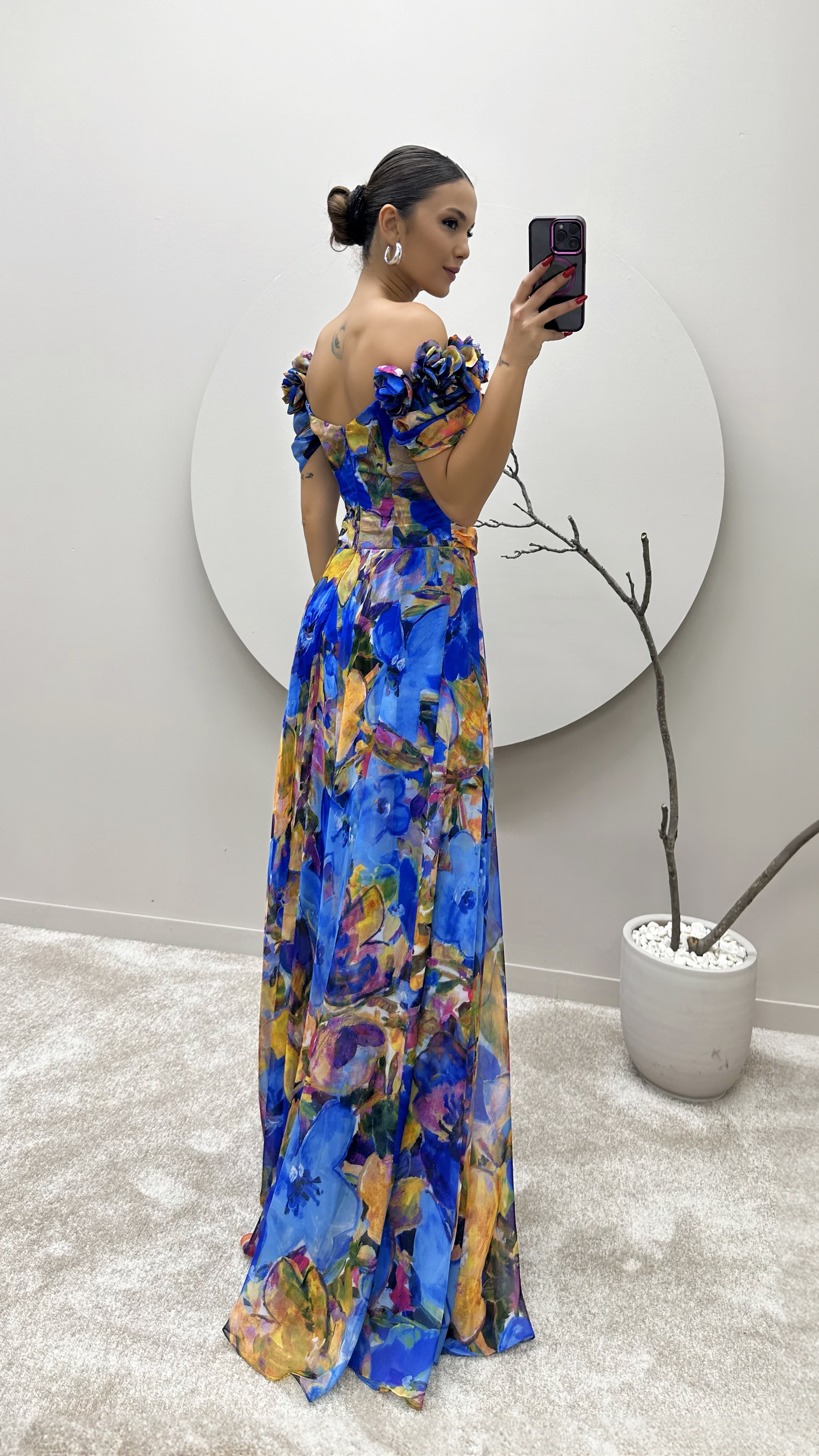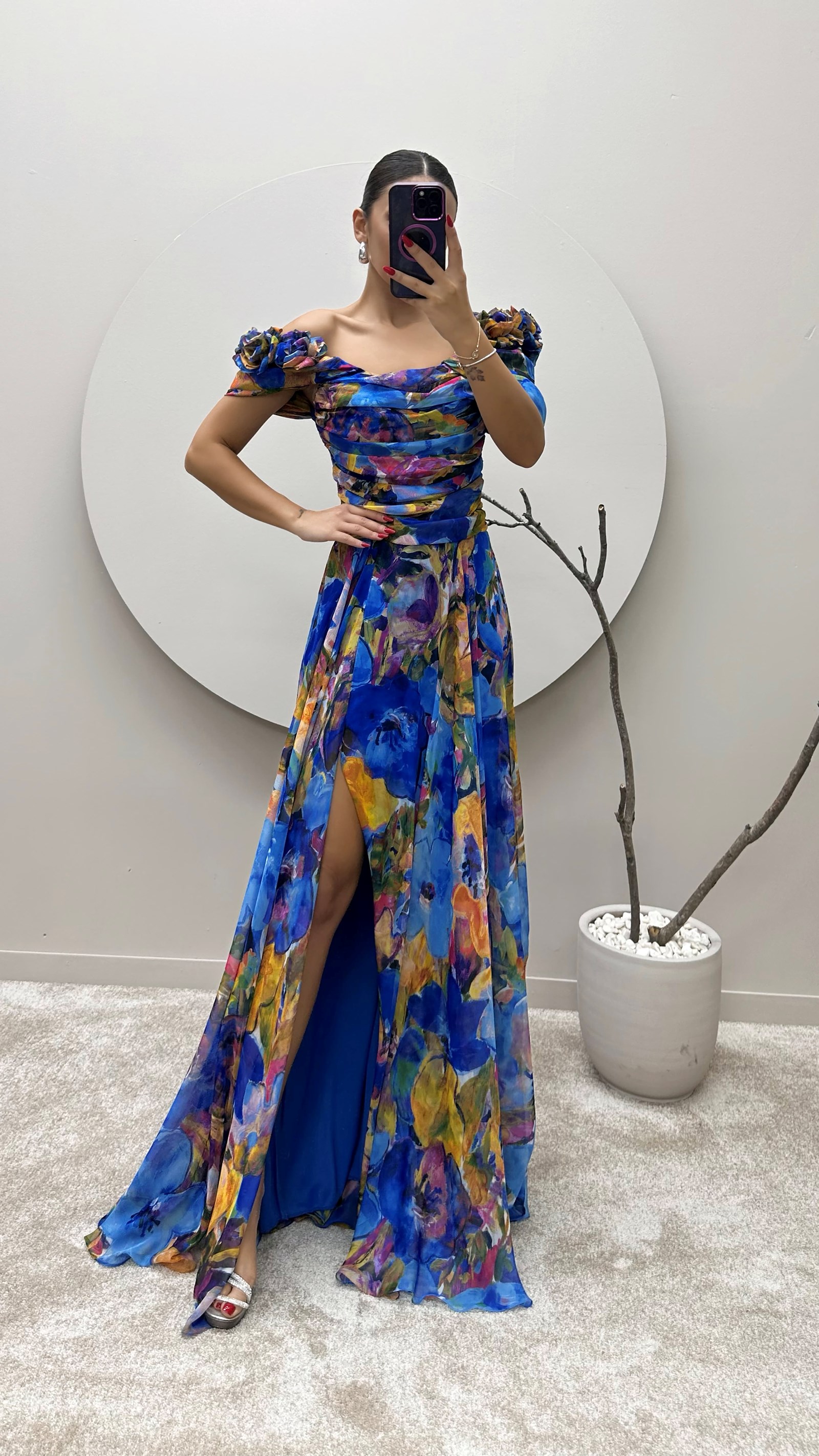 Saks Omuz Detay Desenli Tasarım Şifon Elbise