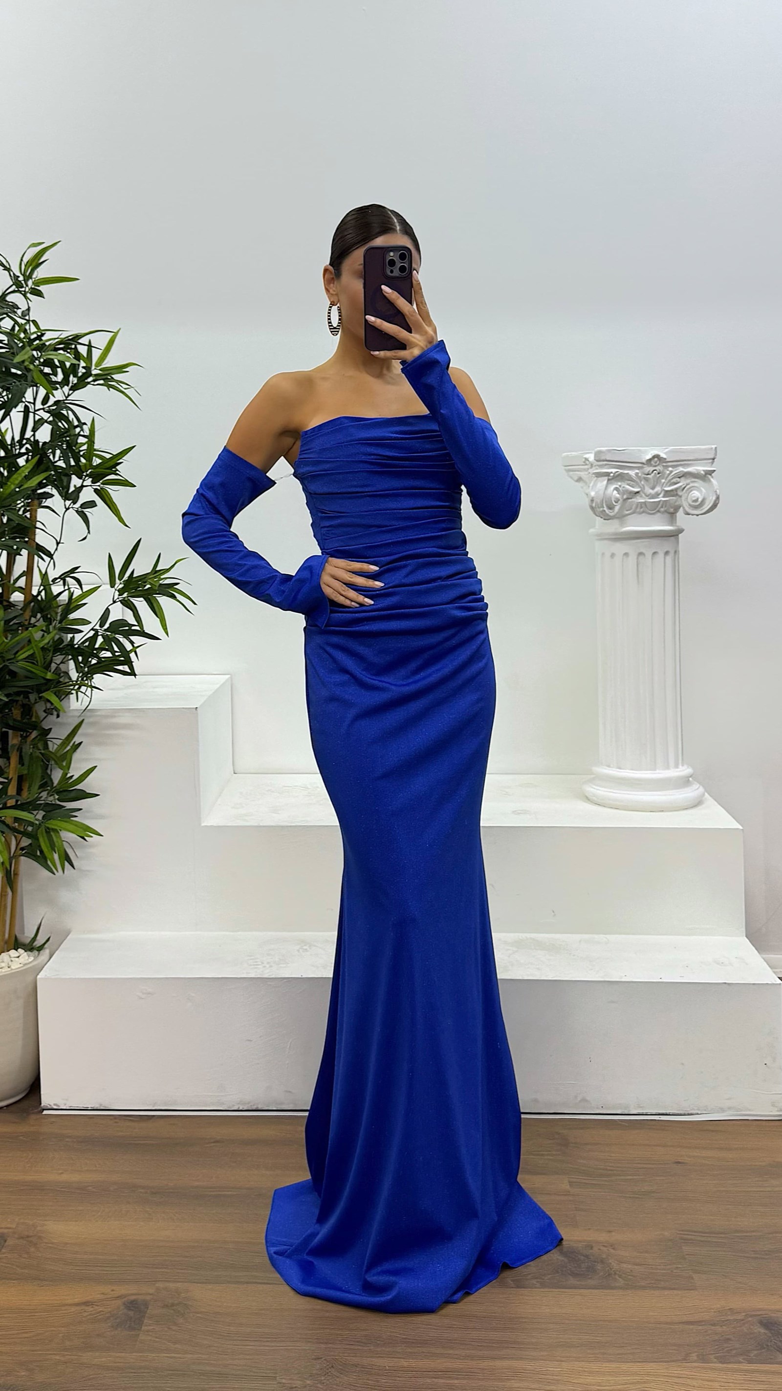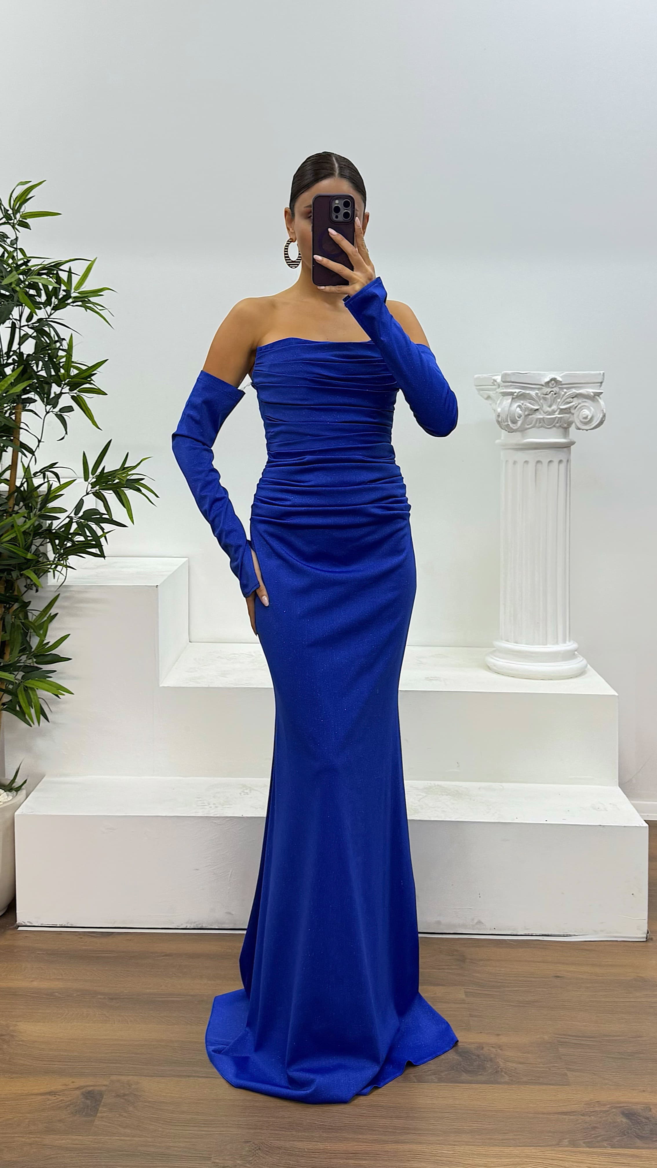 Ürün 36-44 bedene kadar uyumlu, göğüs pedli, astarlı, sırt capraz ip ve fermuar kapamalı, straplez, drapeli, eldivenli abiye olarak tasarlanmıştır.