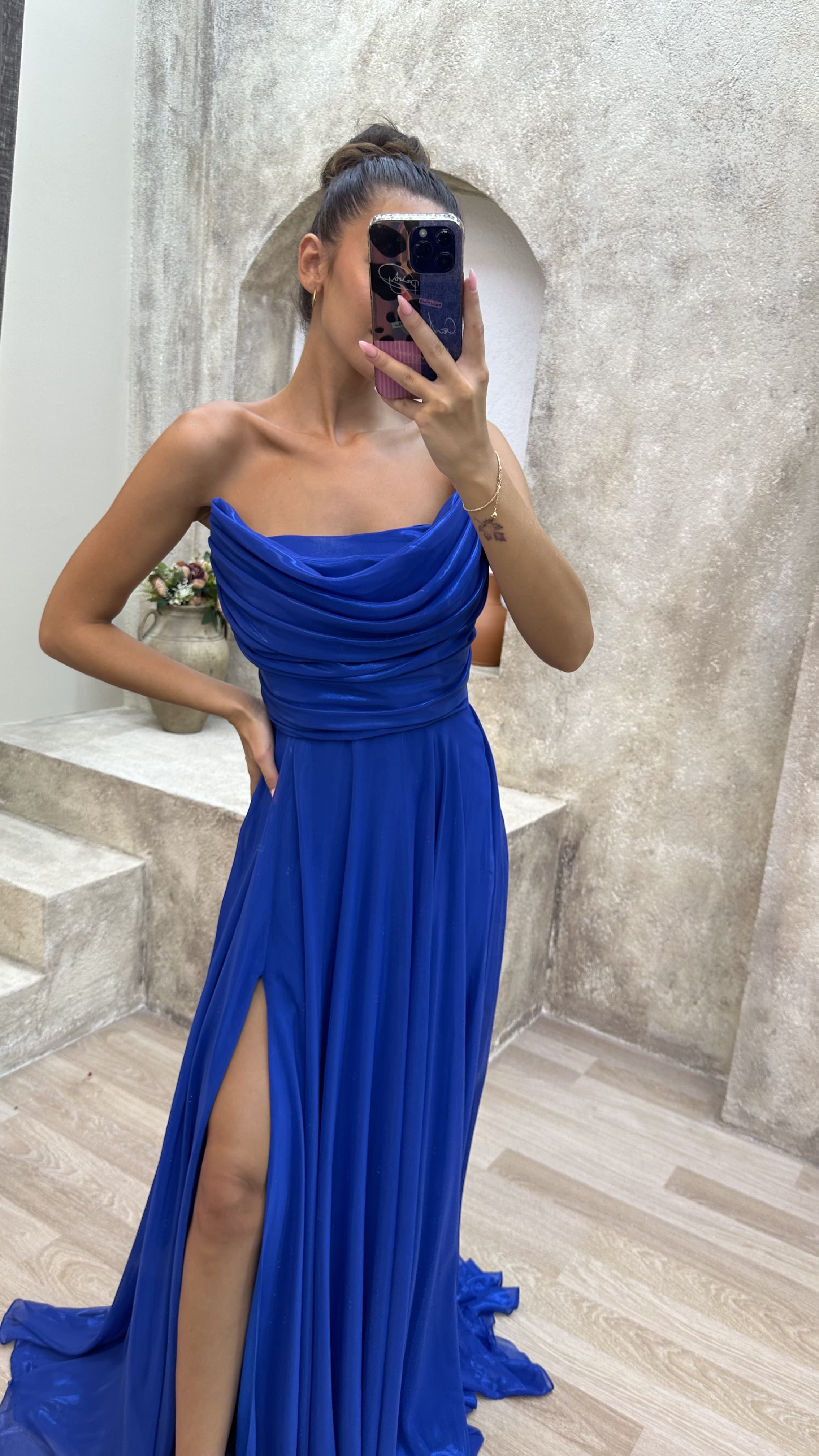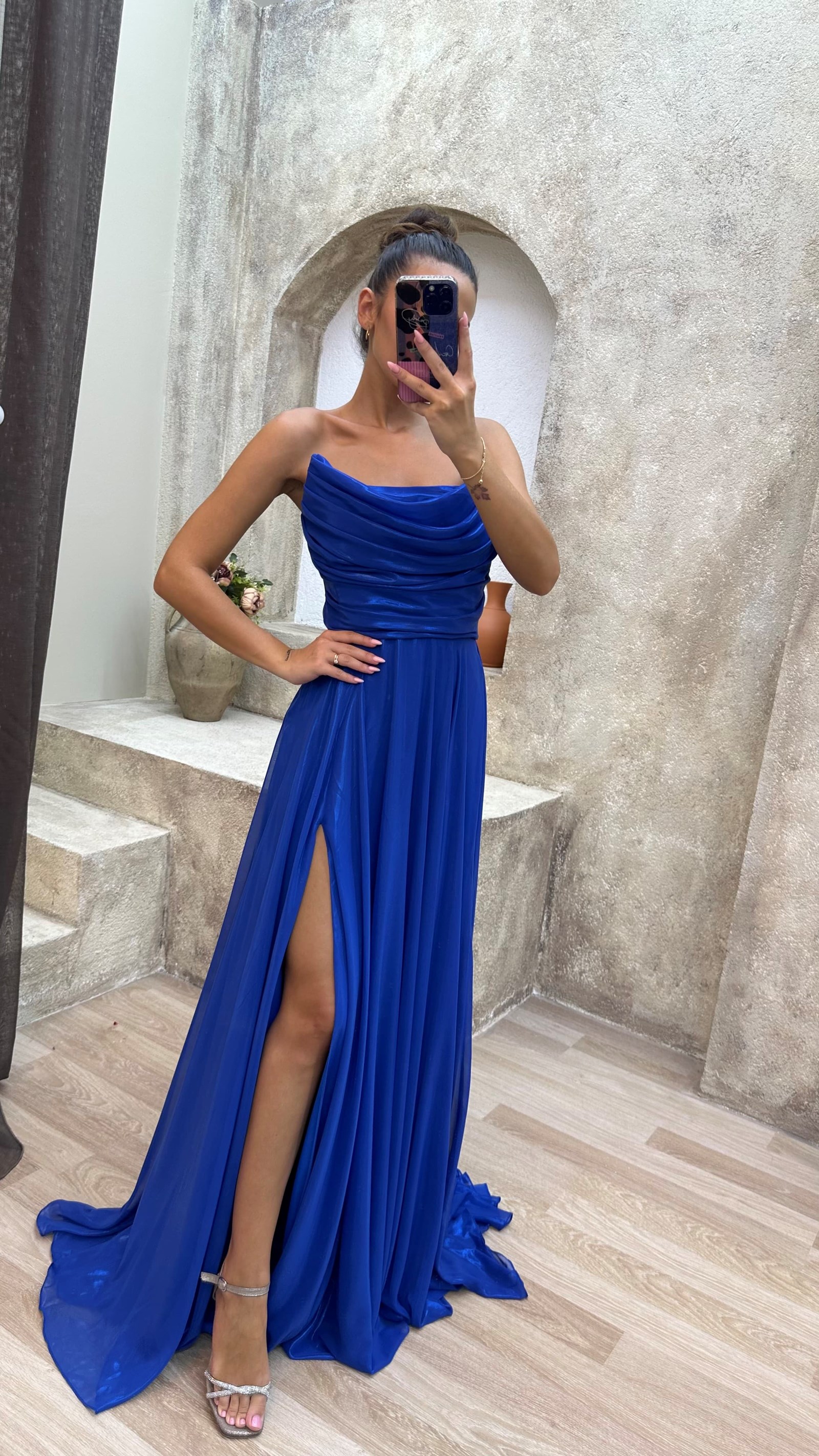 Saks Straplez Büzgülü Yırtmaçlı Abiye Elbise