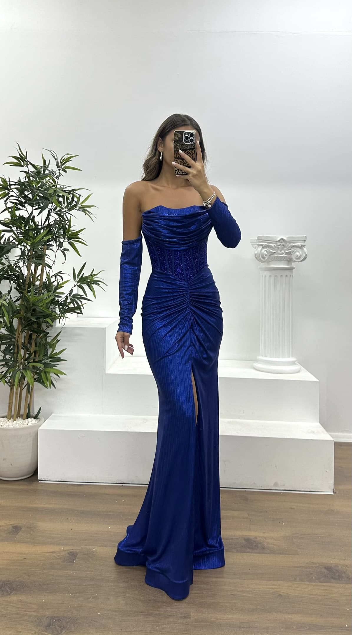 Ürün 36-42 bedene kadar uyumlu, göğüs pedli, astarlı, arka kapama fermuar, yırtmaçlı, eldivenli, bel detay abiye olarak tasarlanmıştır.