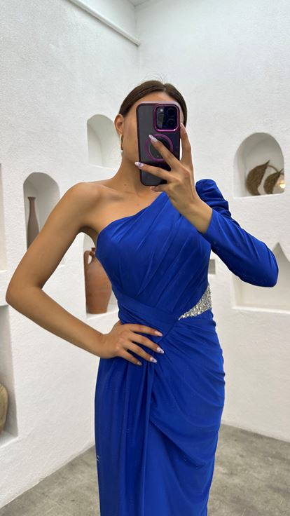 Saks Tek Kol Beli İşlemeli Drapeli Abiye Elbise
