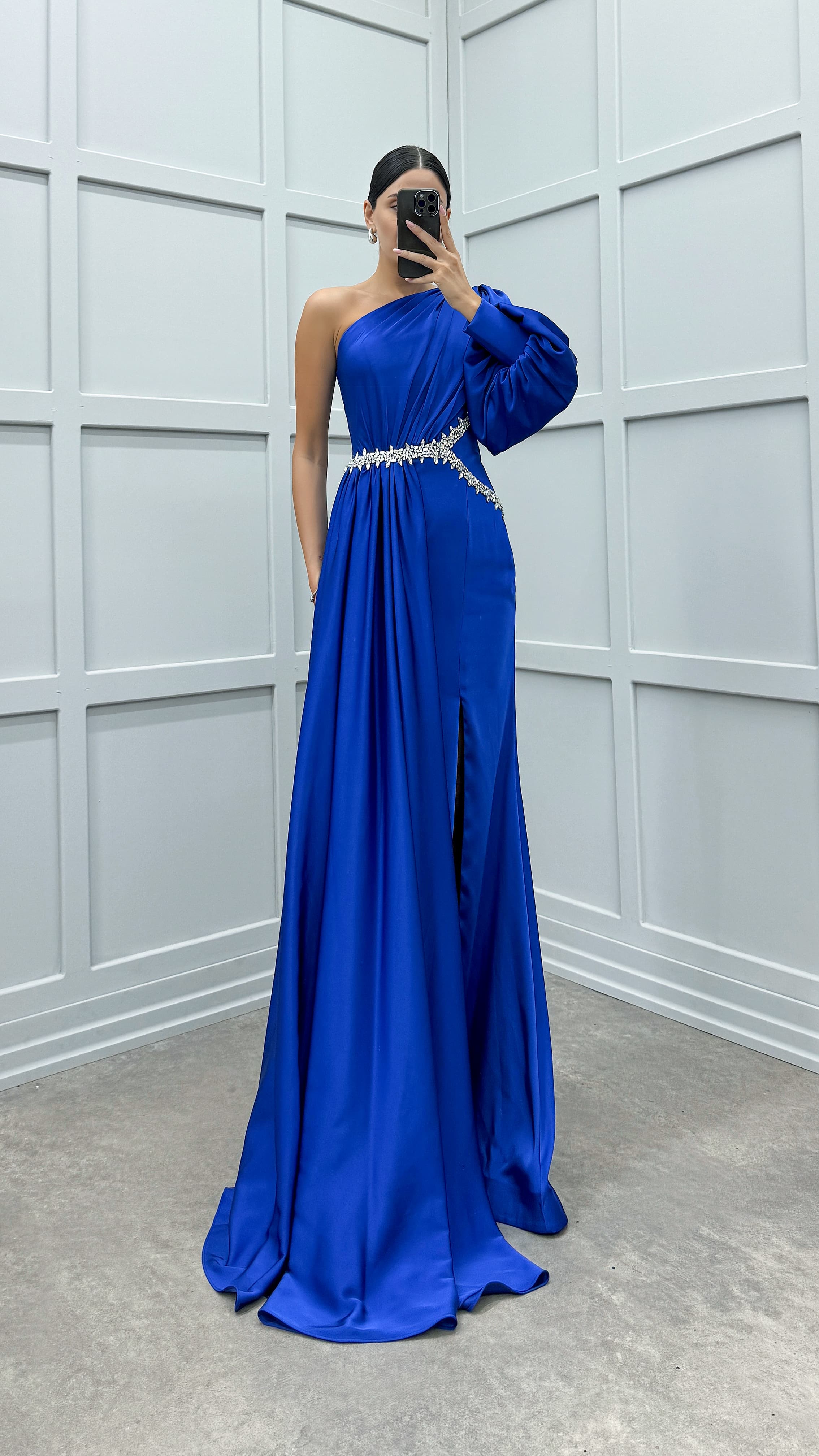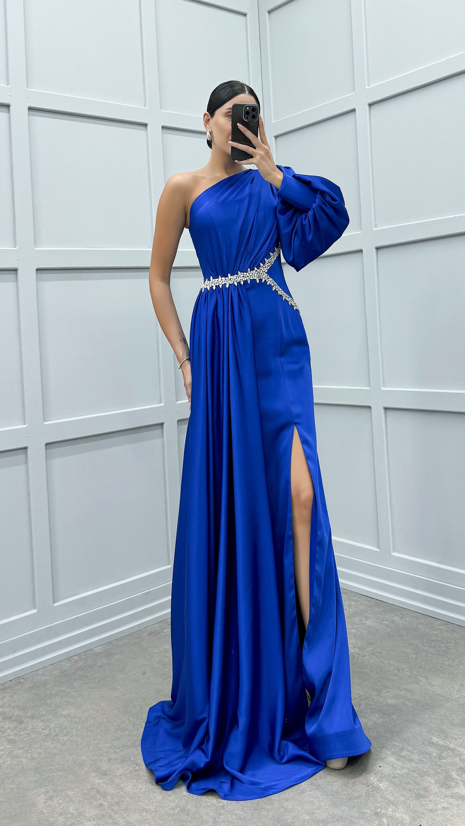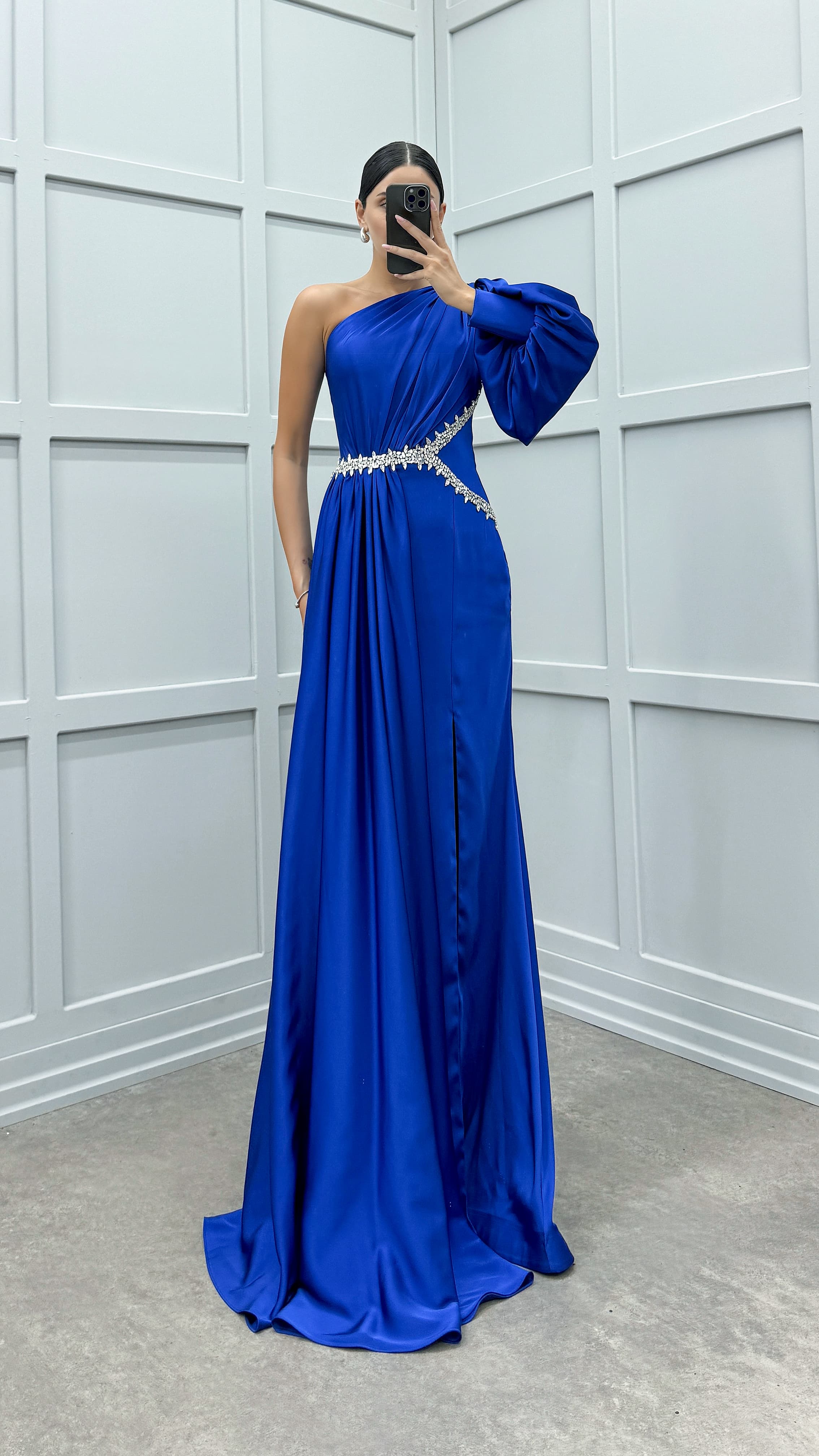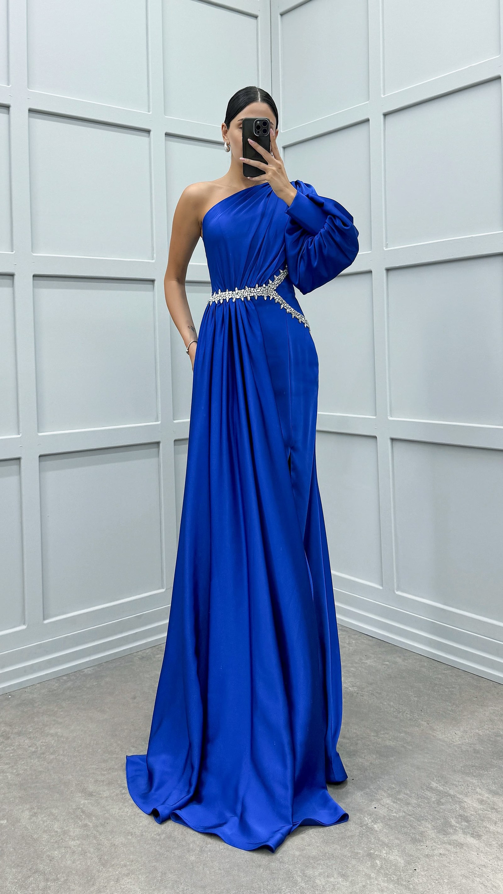 • Saks Tek Omuz Beli Taşlı Tasarım Elbise