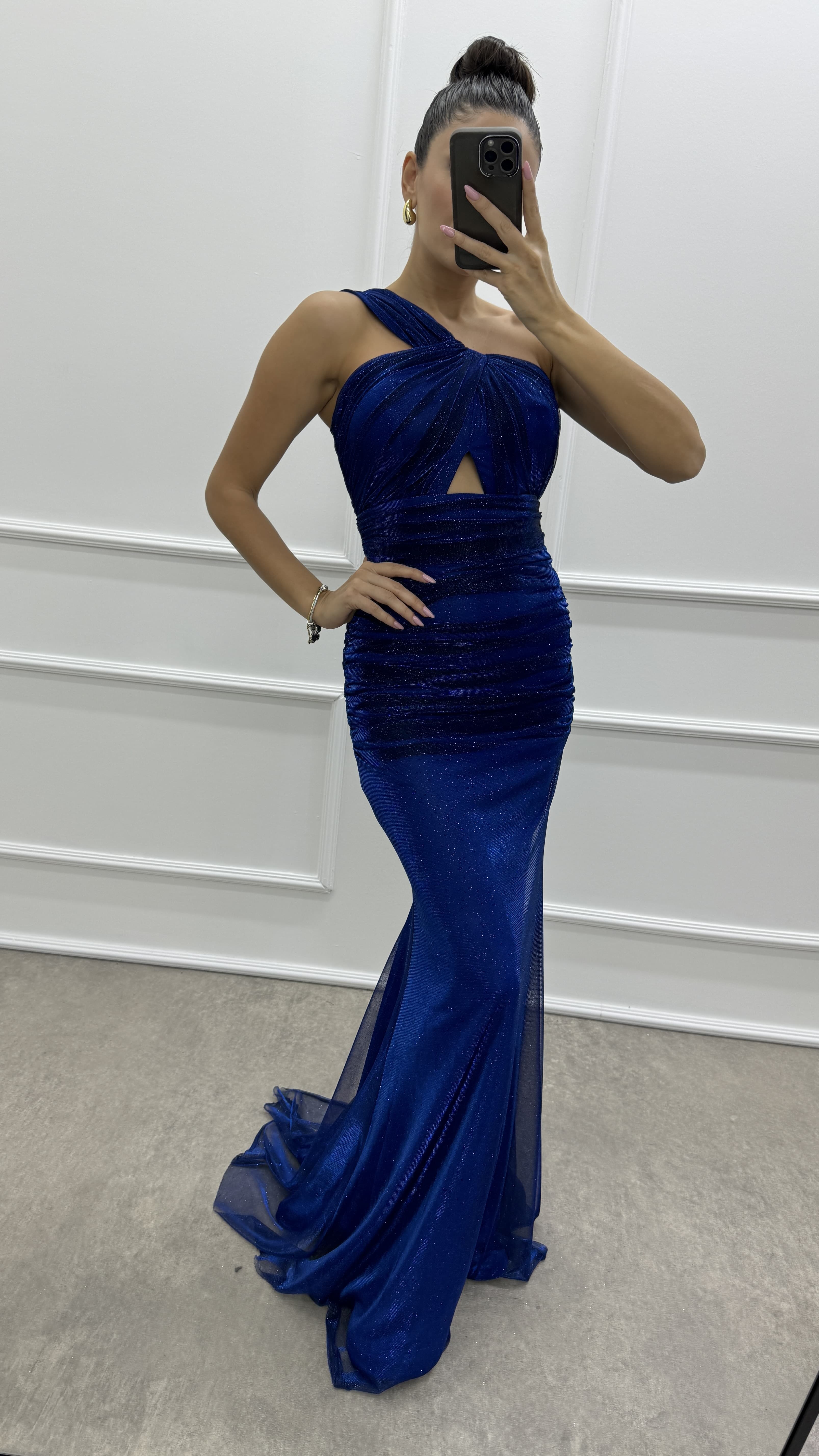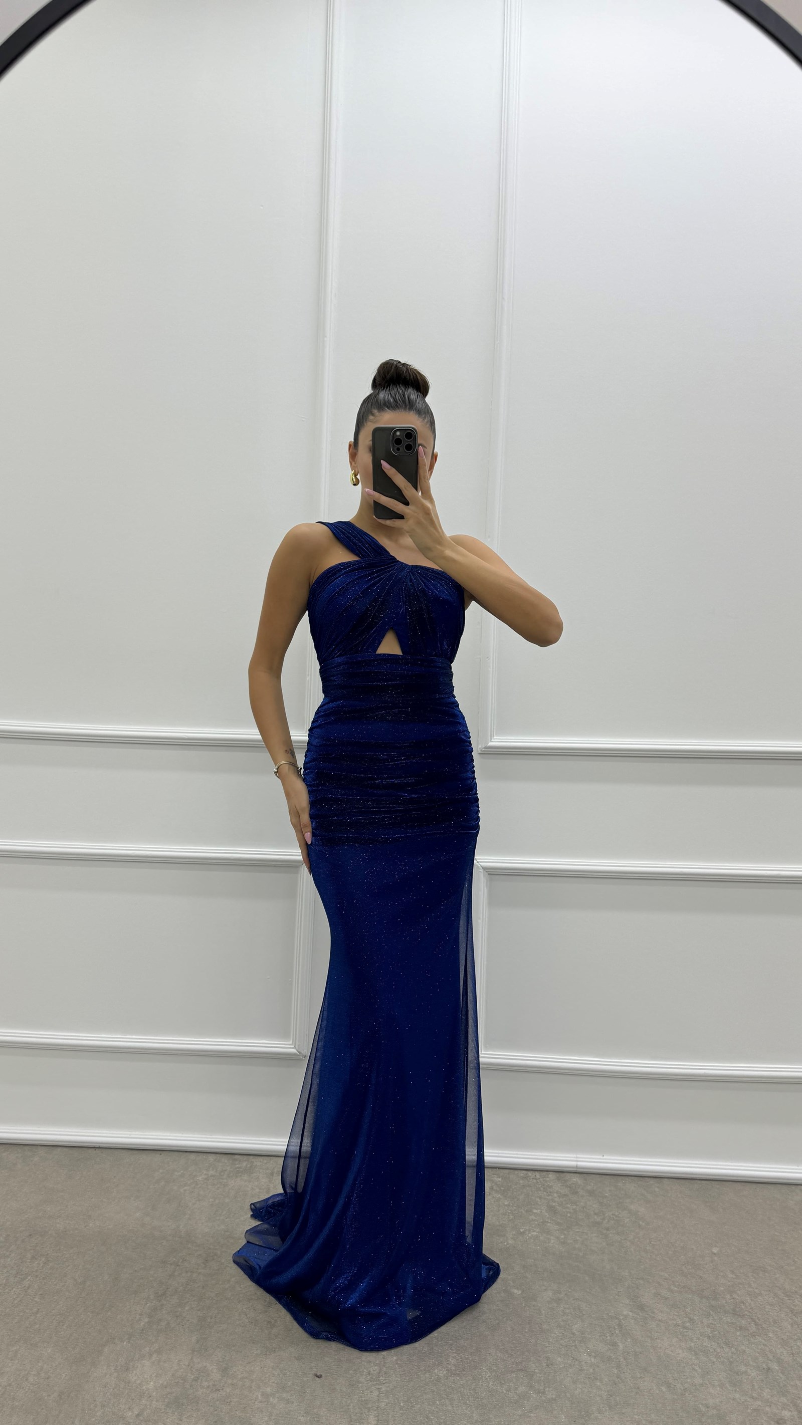 Saks Tek Omuz Göğsü Drapeli Büzgülü Tasarım Abiye Elbise