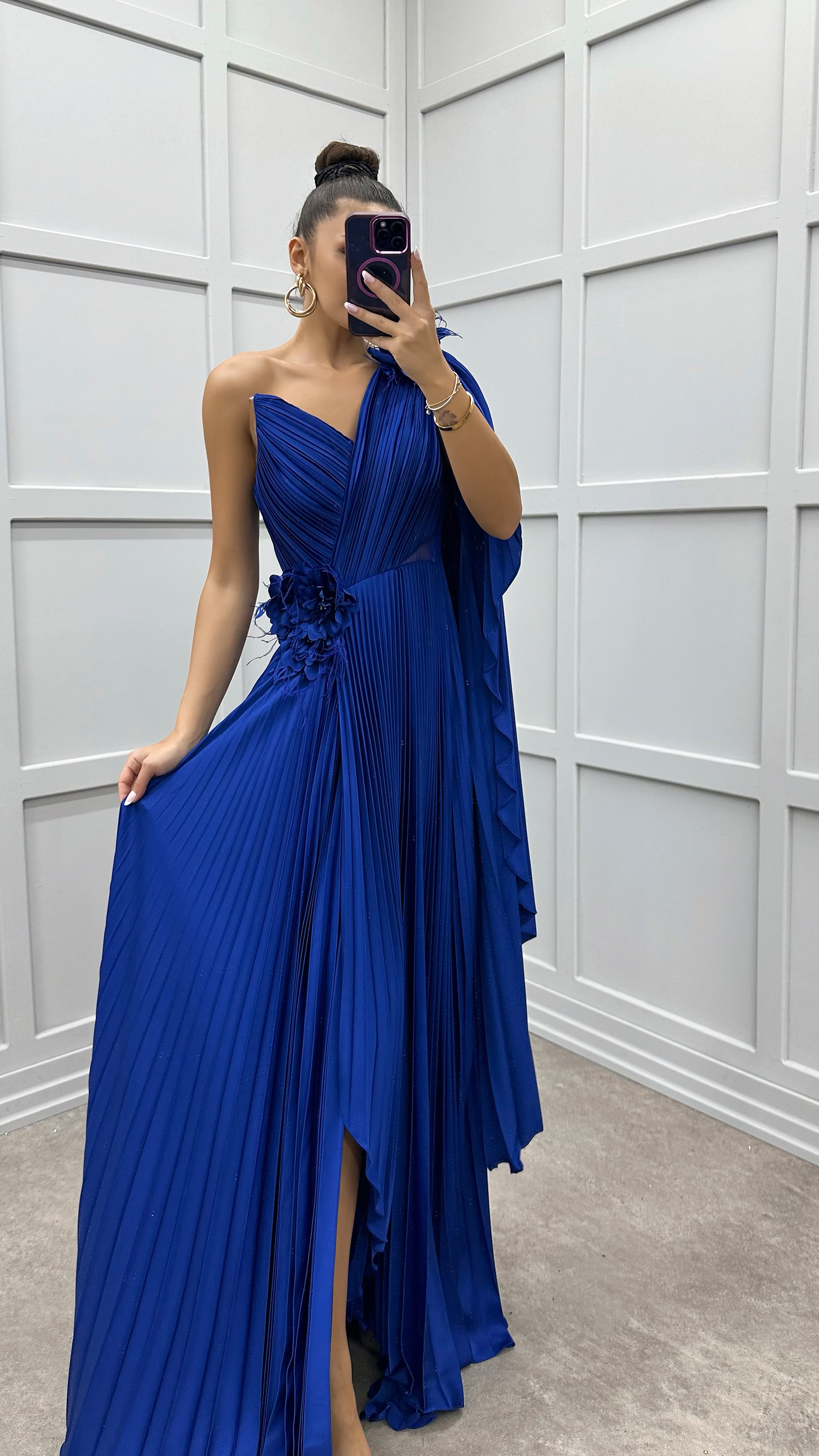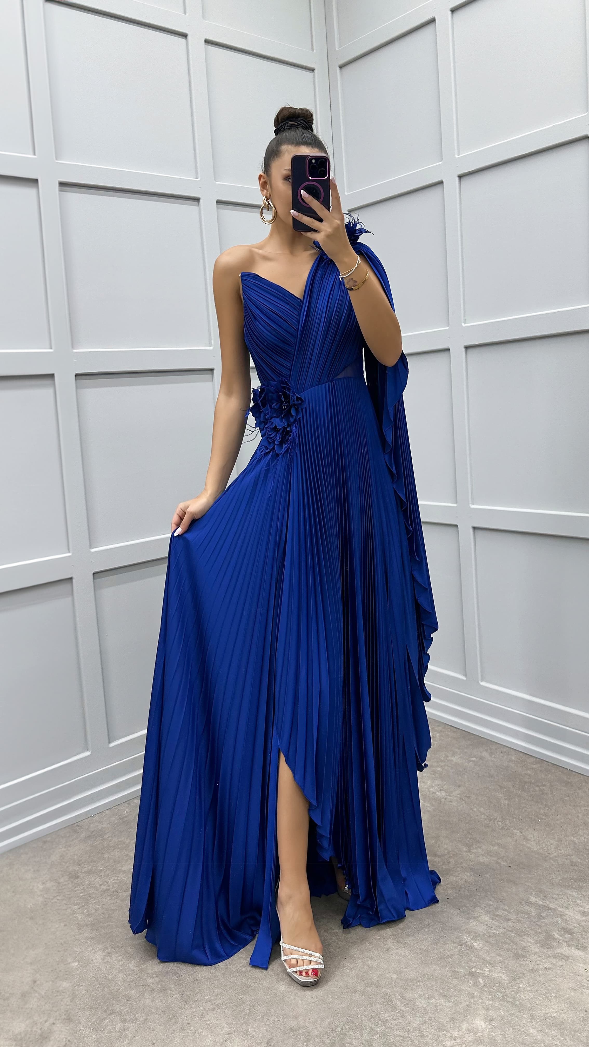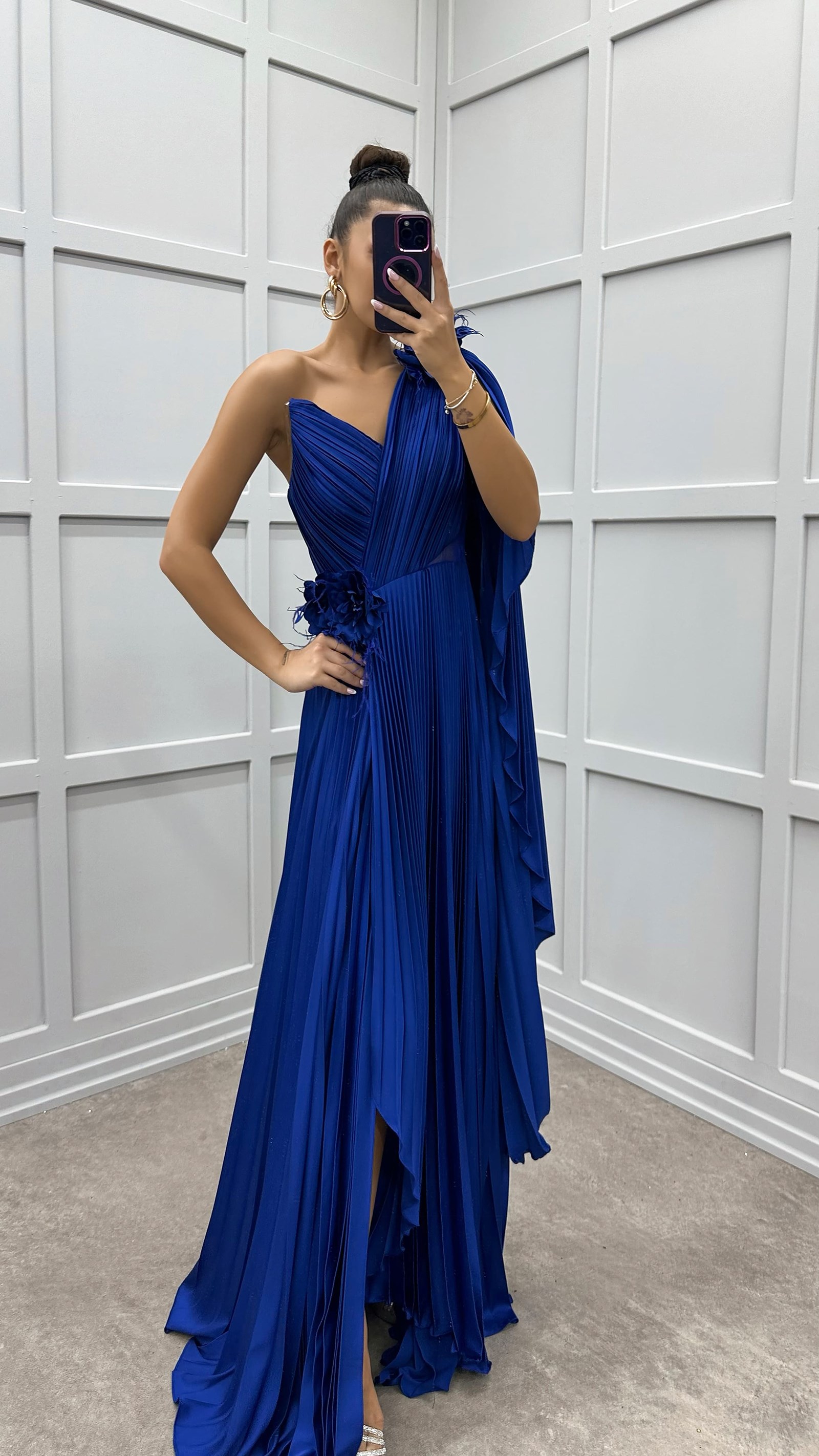 • Saks Tek Omuz Transparan Detay Pliseli Elbise