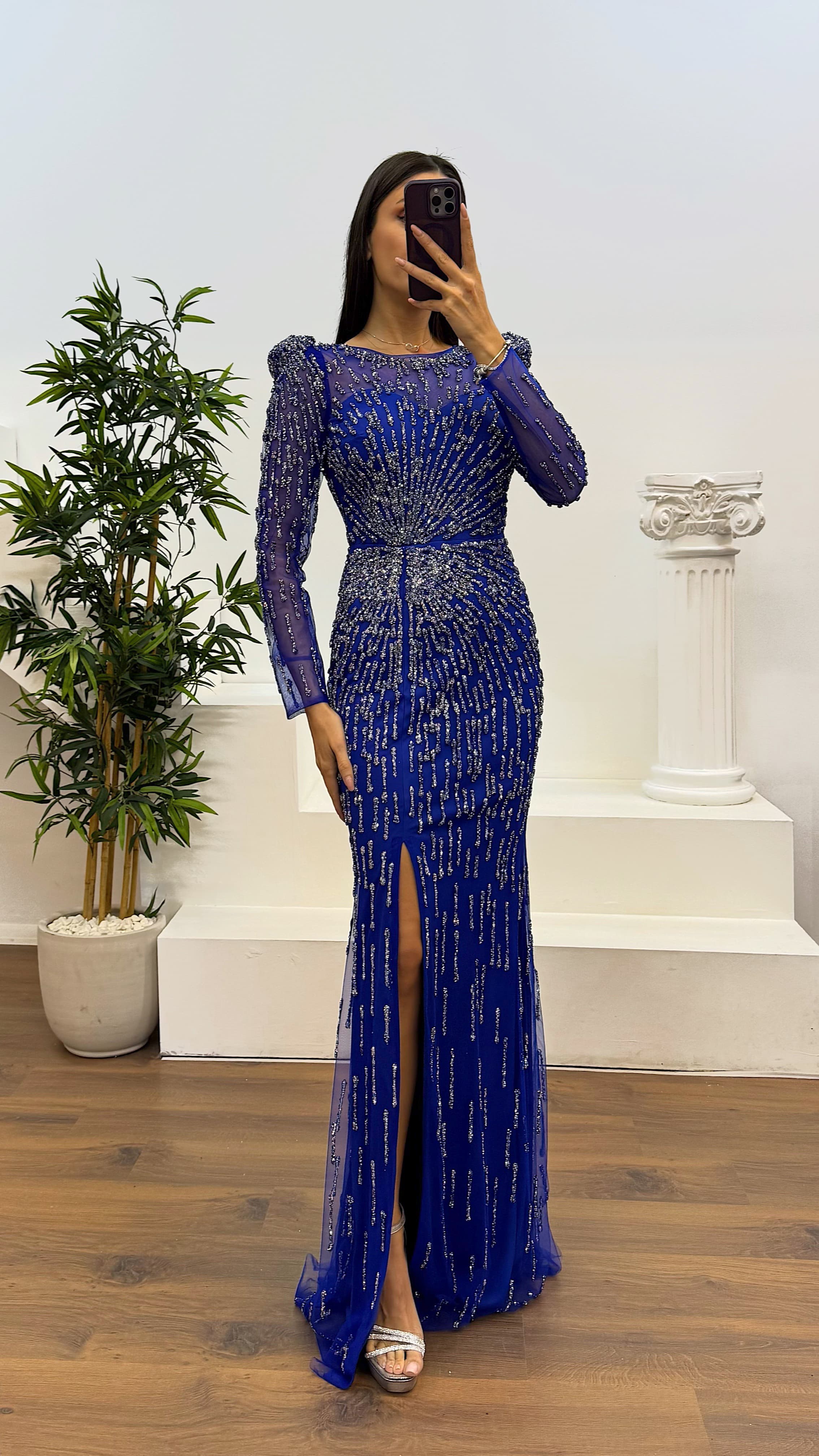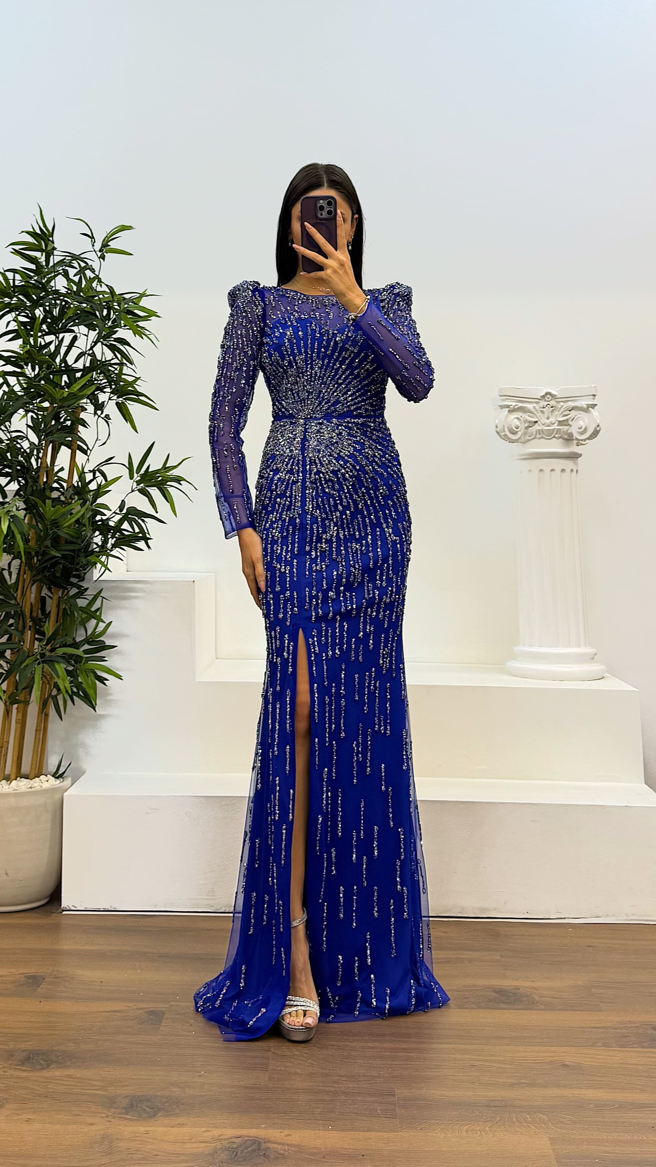 • İndigo Transparan Detay İşleme Detay Abiye Elbise