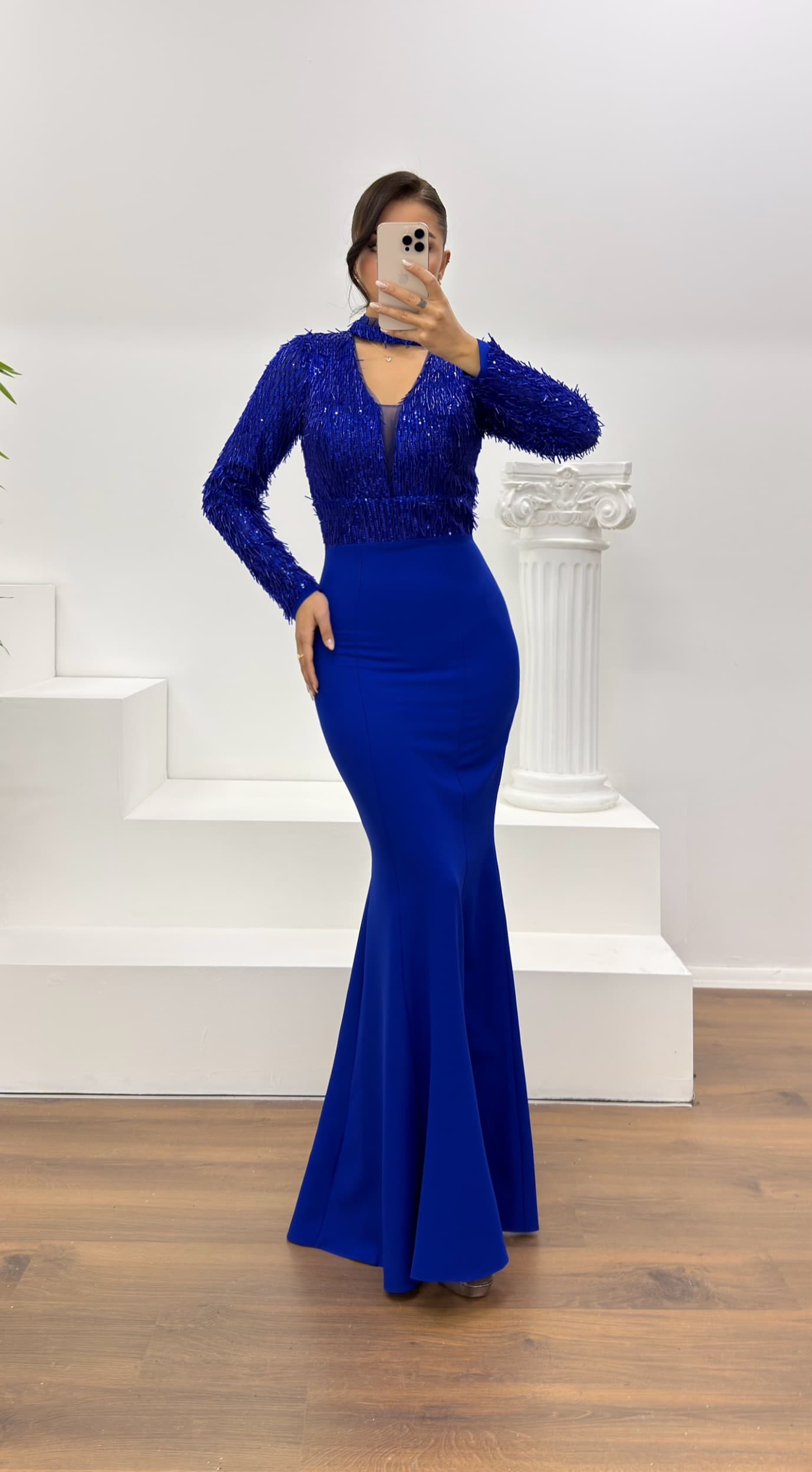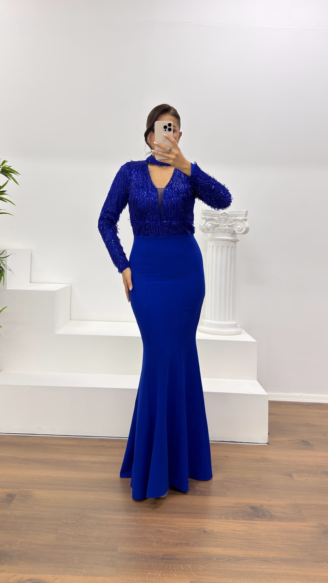 • Saks Uzun Kollu İşleme Detaylı Abiye Elbise