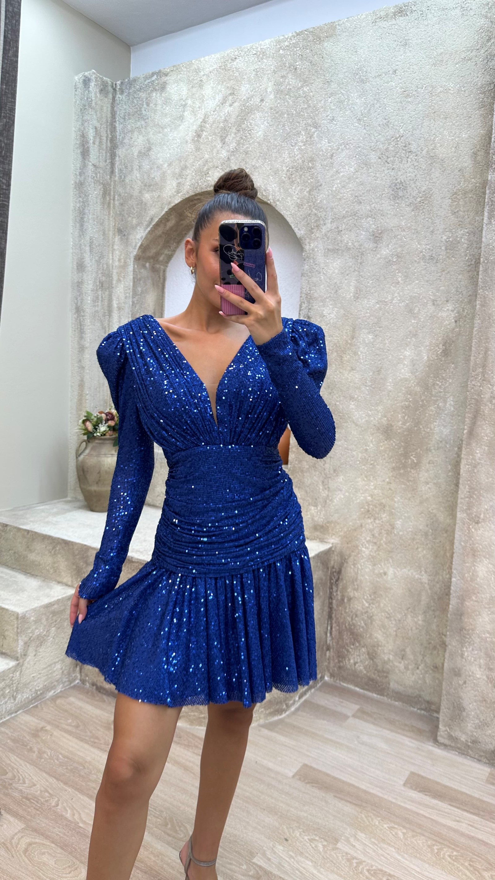 Saks V Yaka Omuzlar Balon Pul Payet Mini Elbise