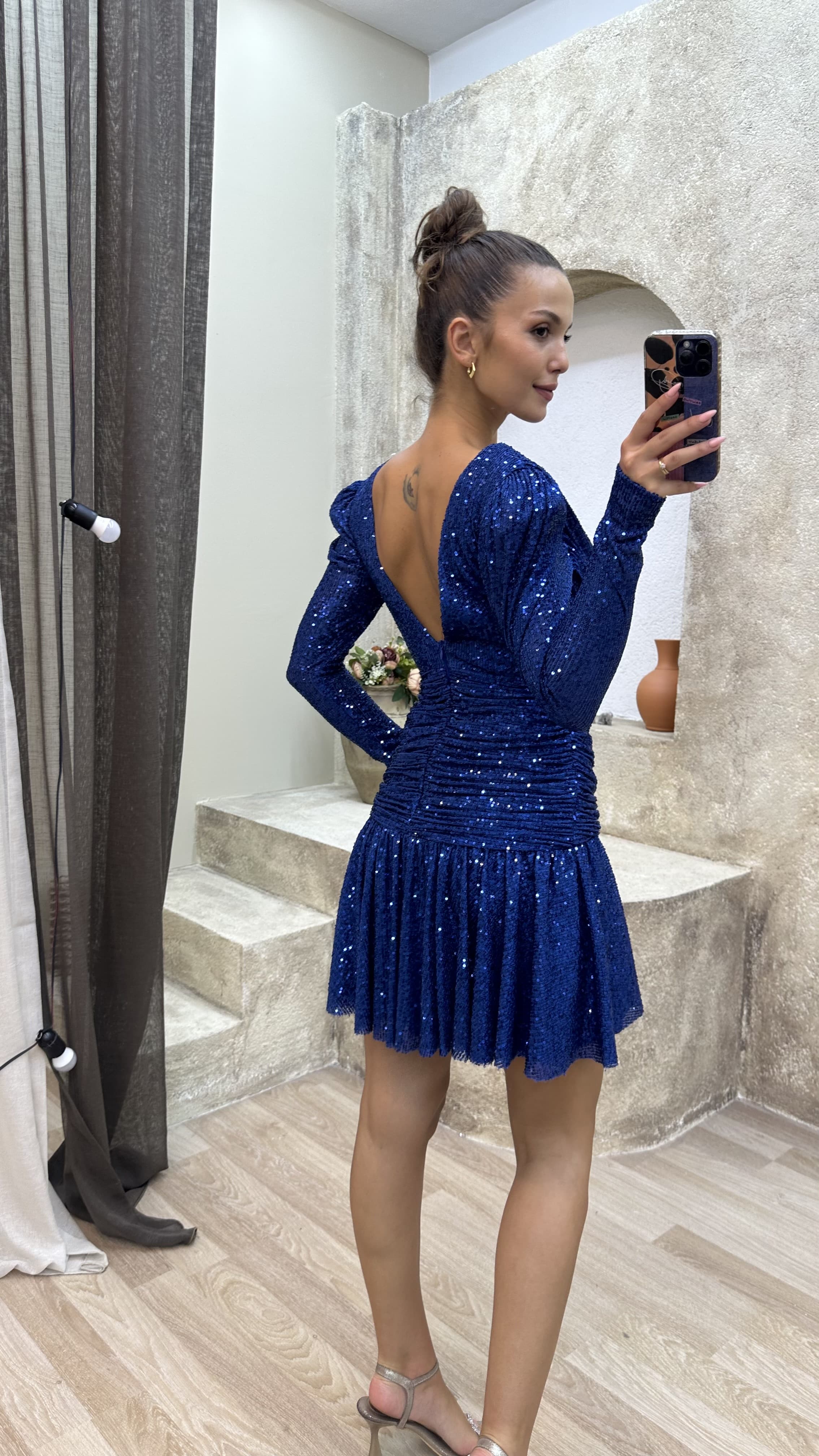 • Saks V Yaka Omuzlar Balon Pul Payet Mini Elbise