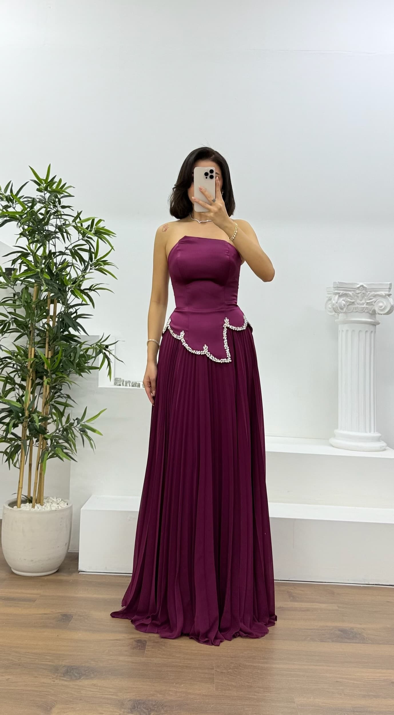 • Şarabi Pliseli Taş Detaylı Staplez Abiye Elbise