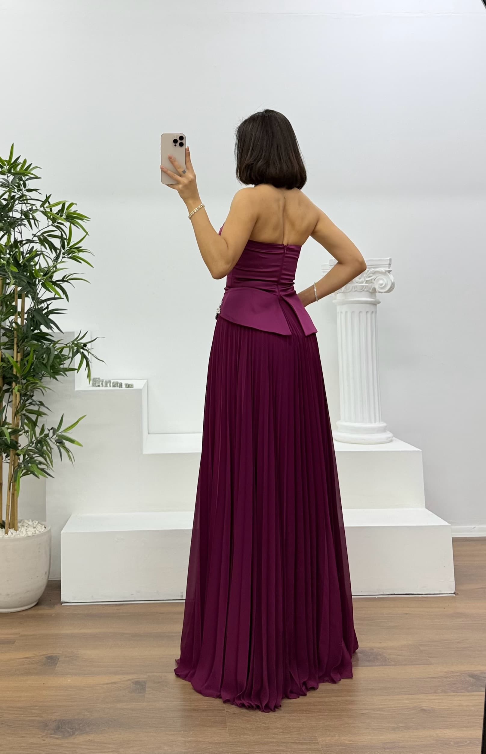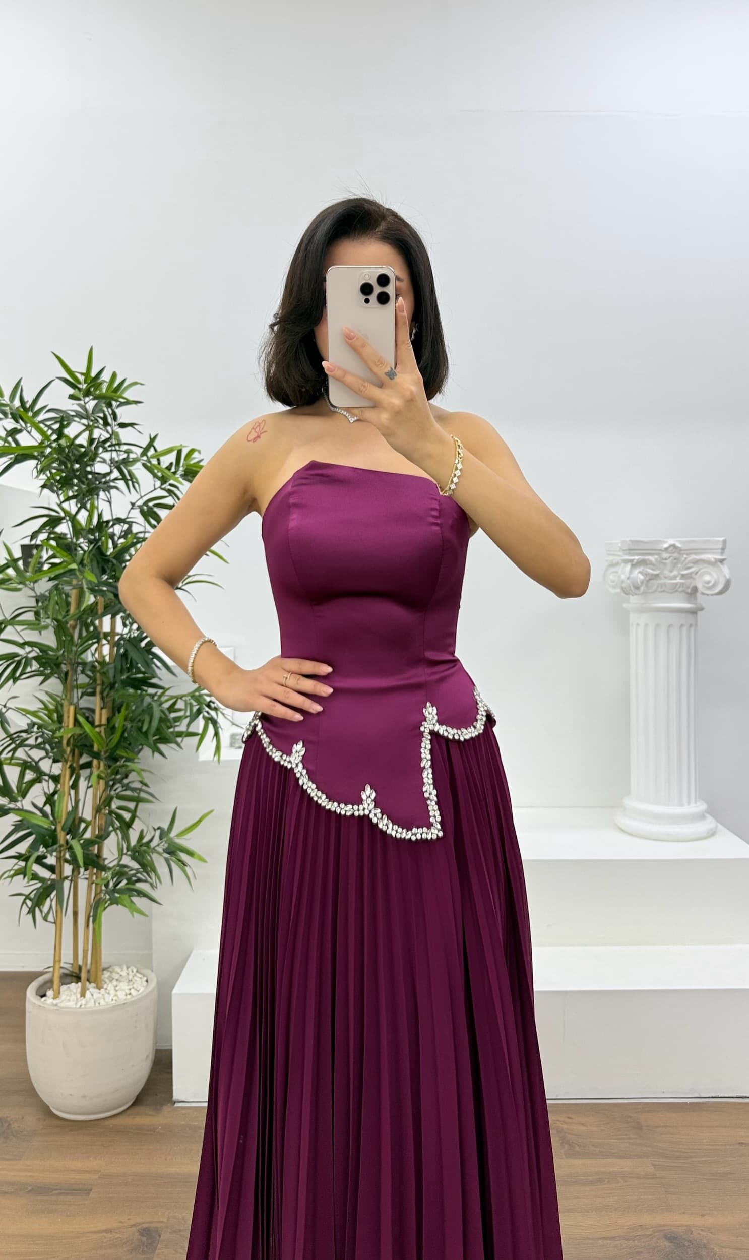 Şarabi Pliseli Taş Detaylı Staplez Abiye Elbise