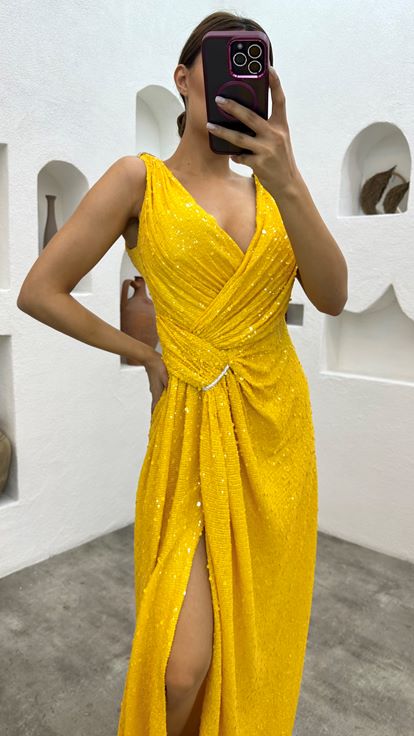• Sarı Beli Büzgülü Kemerli Pul Payet Abiye Elbise