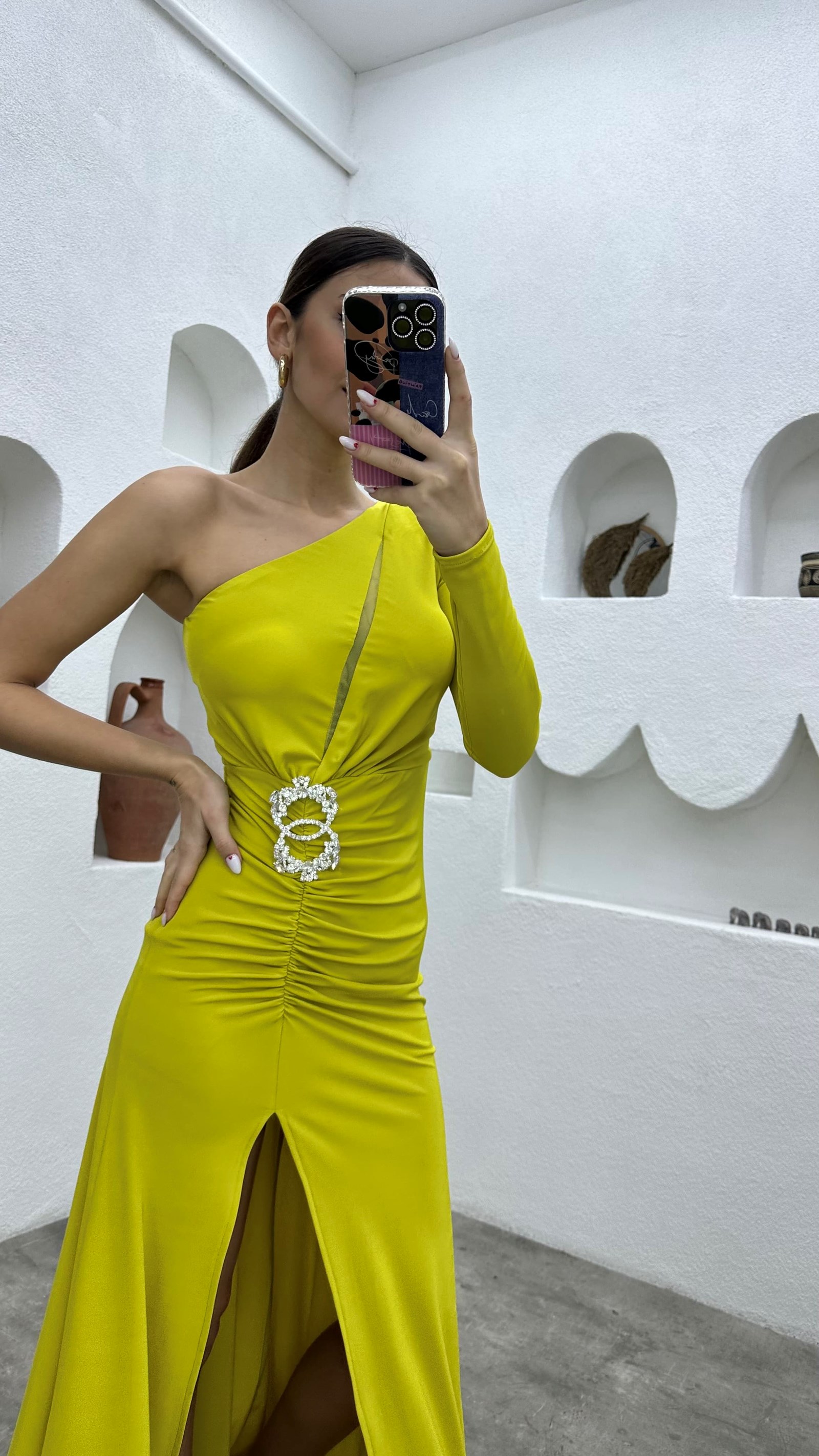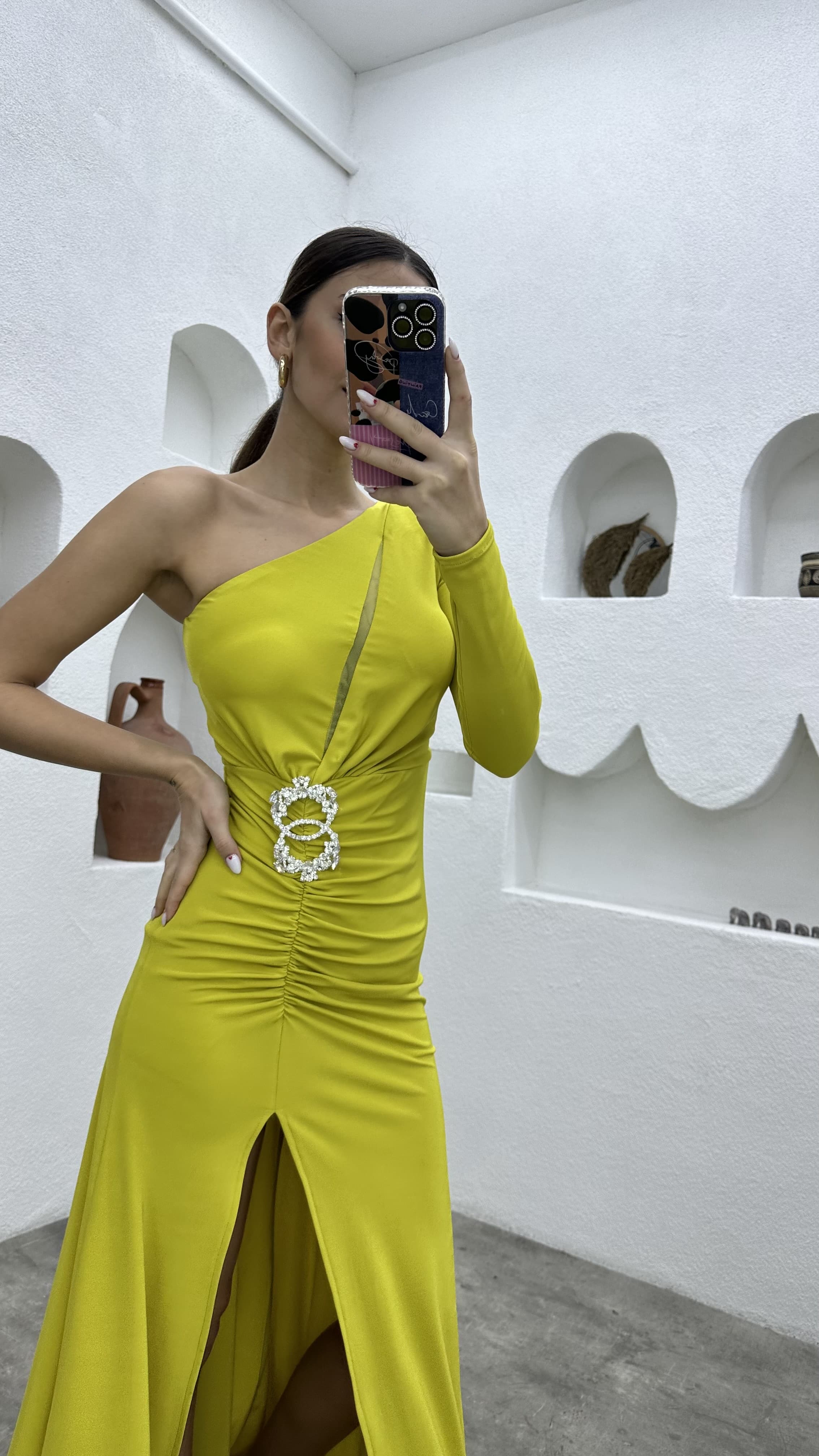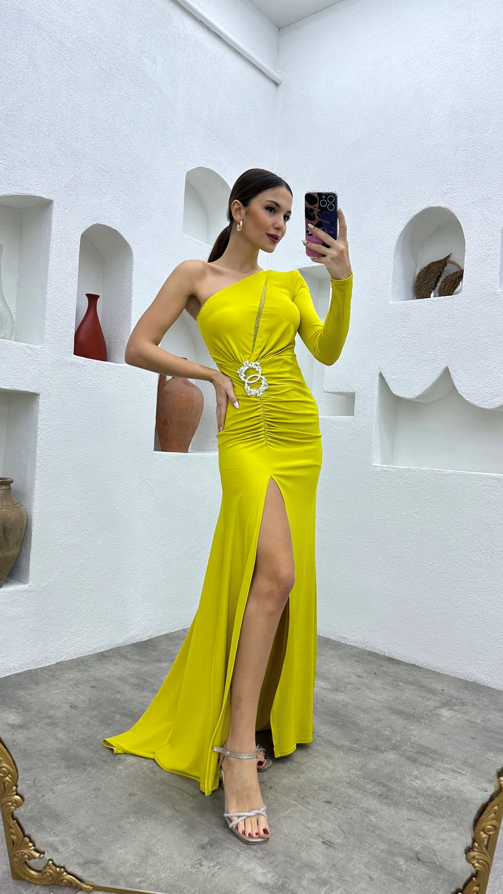 • Sarı Broş Detay Tek Omuz Abiye Elbise