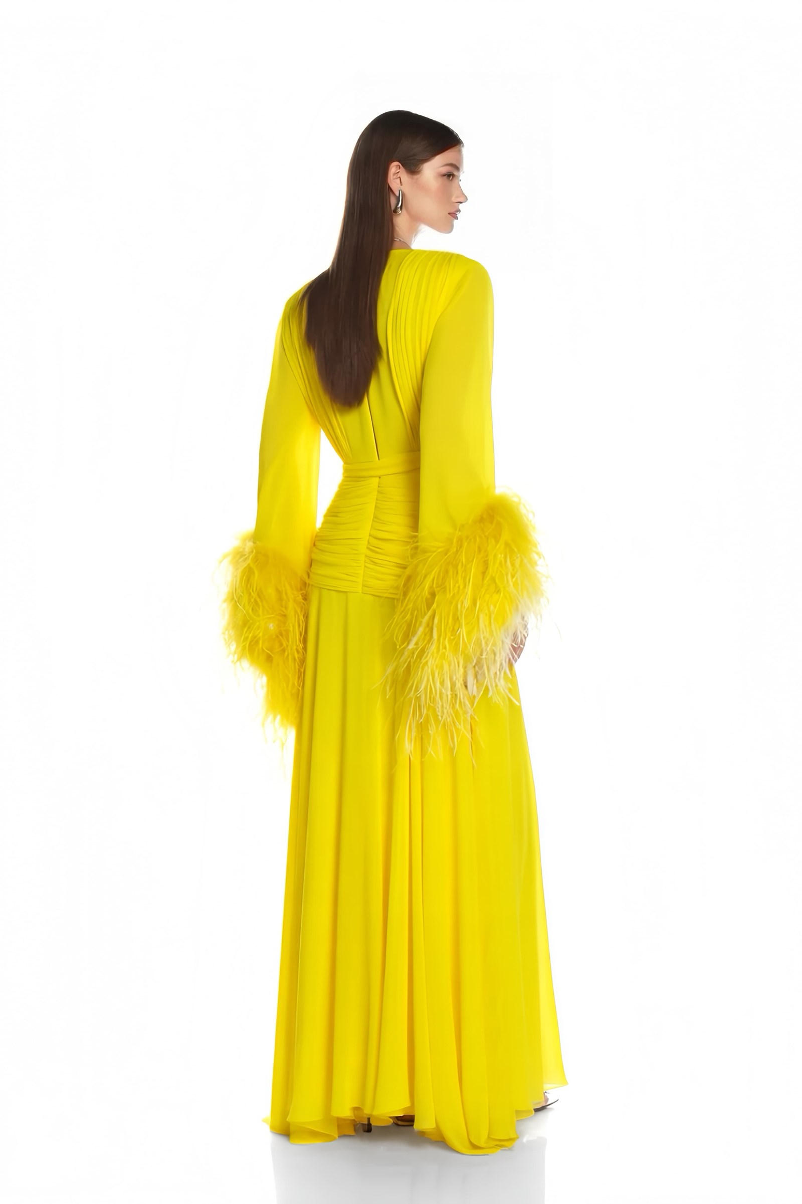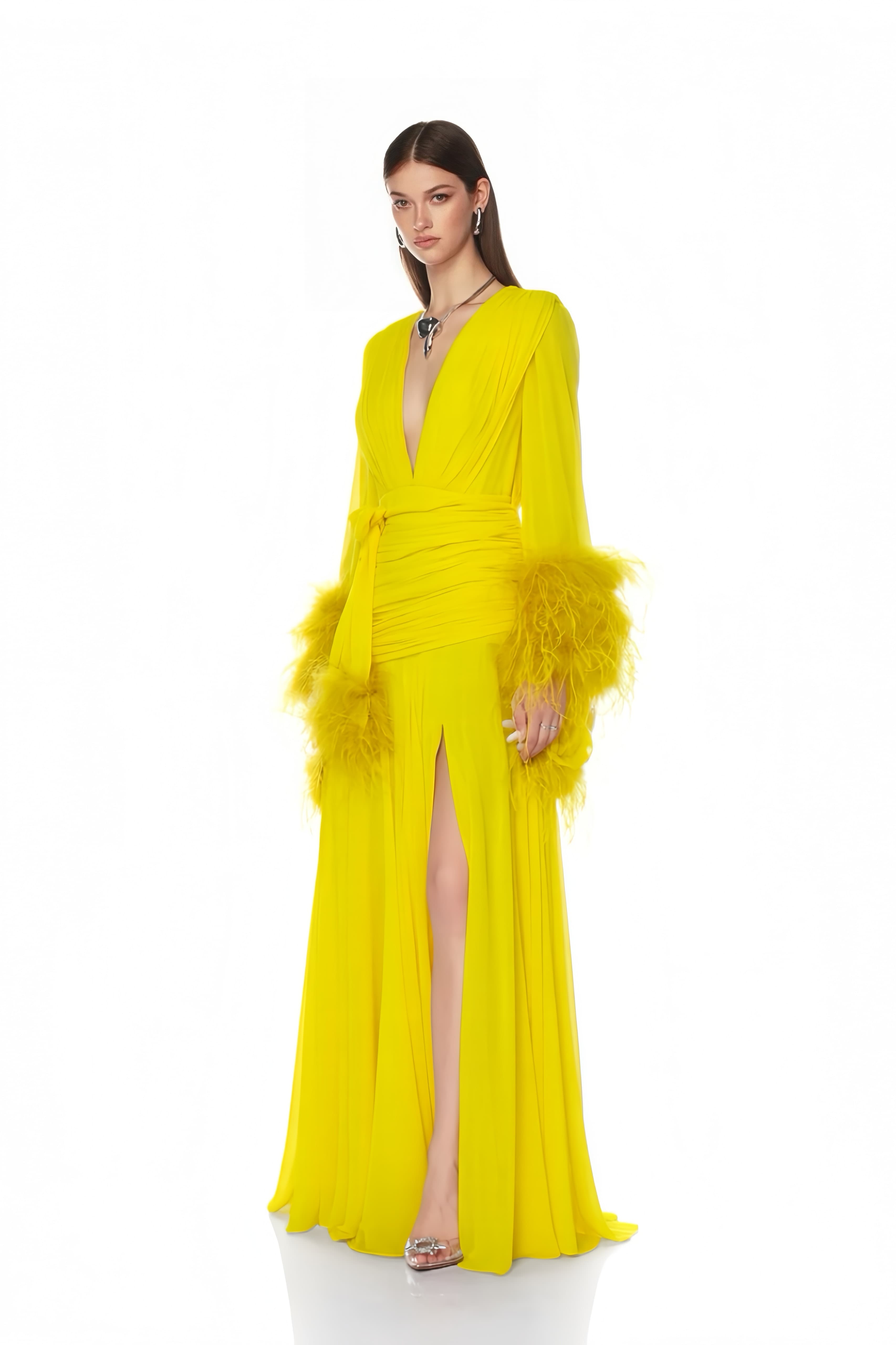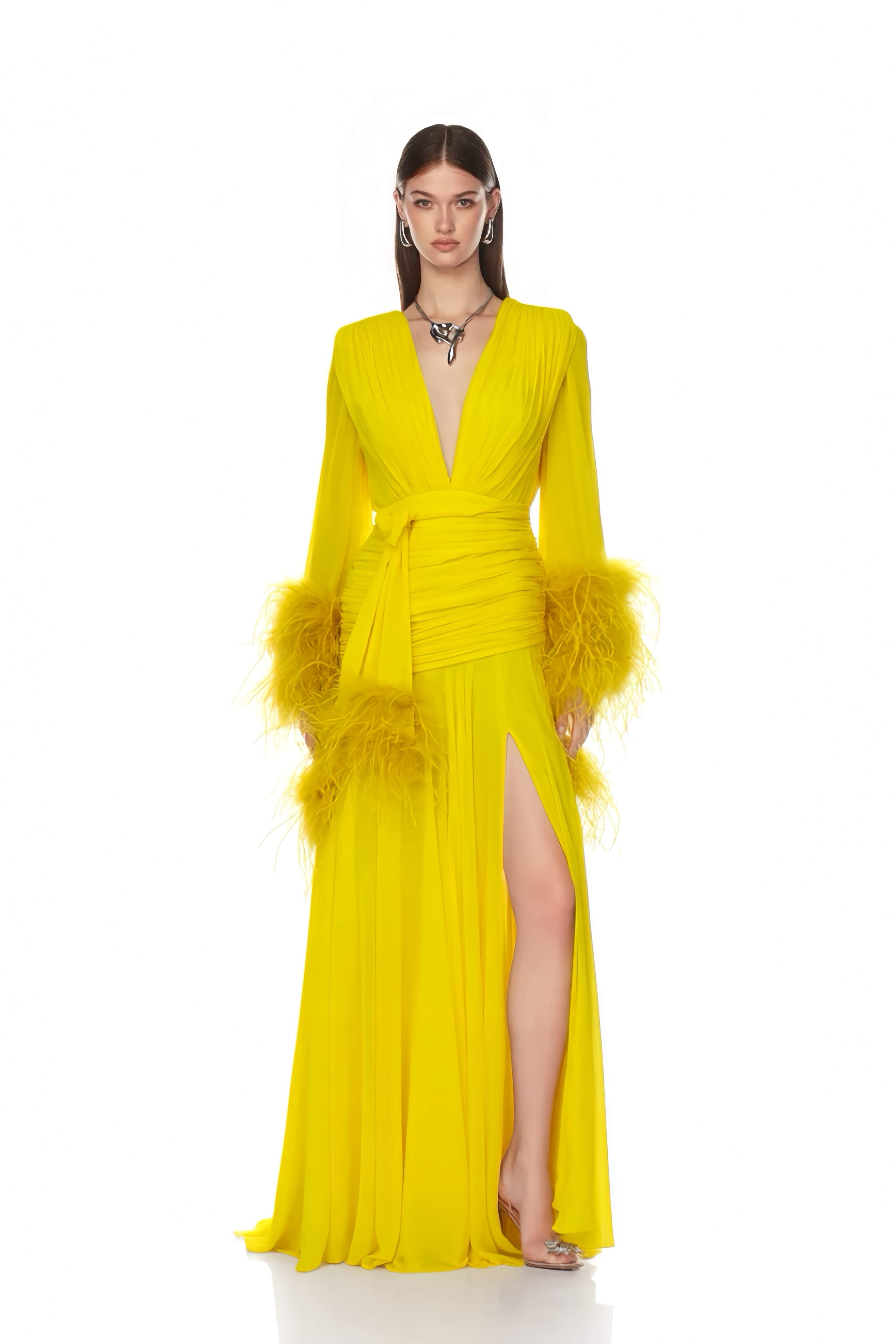Sarı Derin V Yaka Tüylü Abiye Elbise