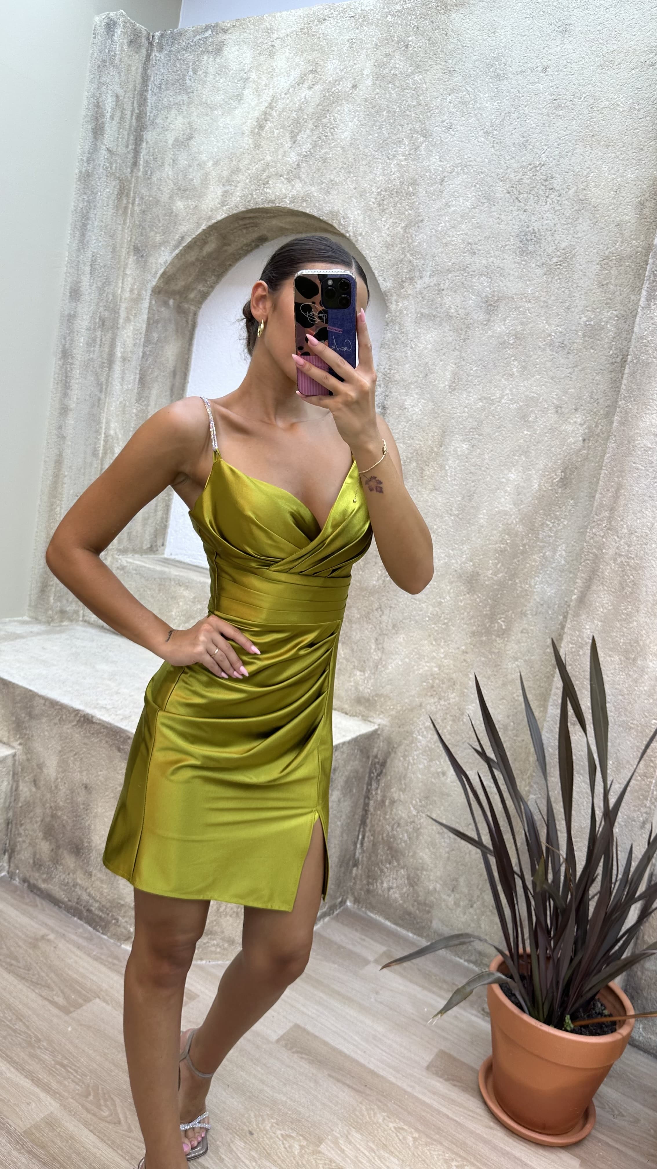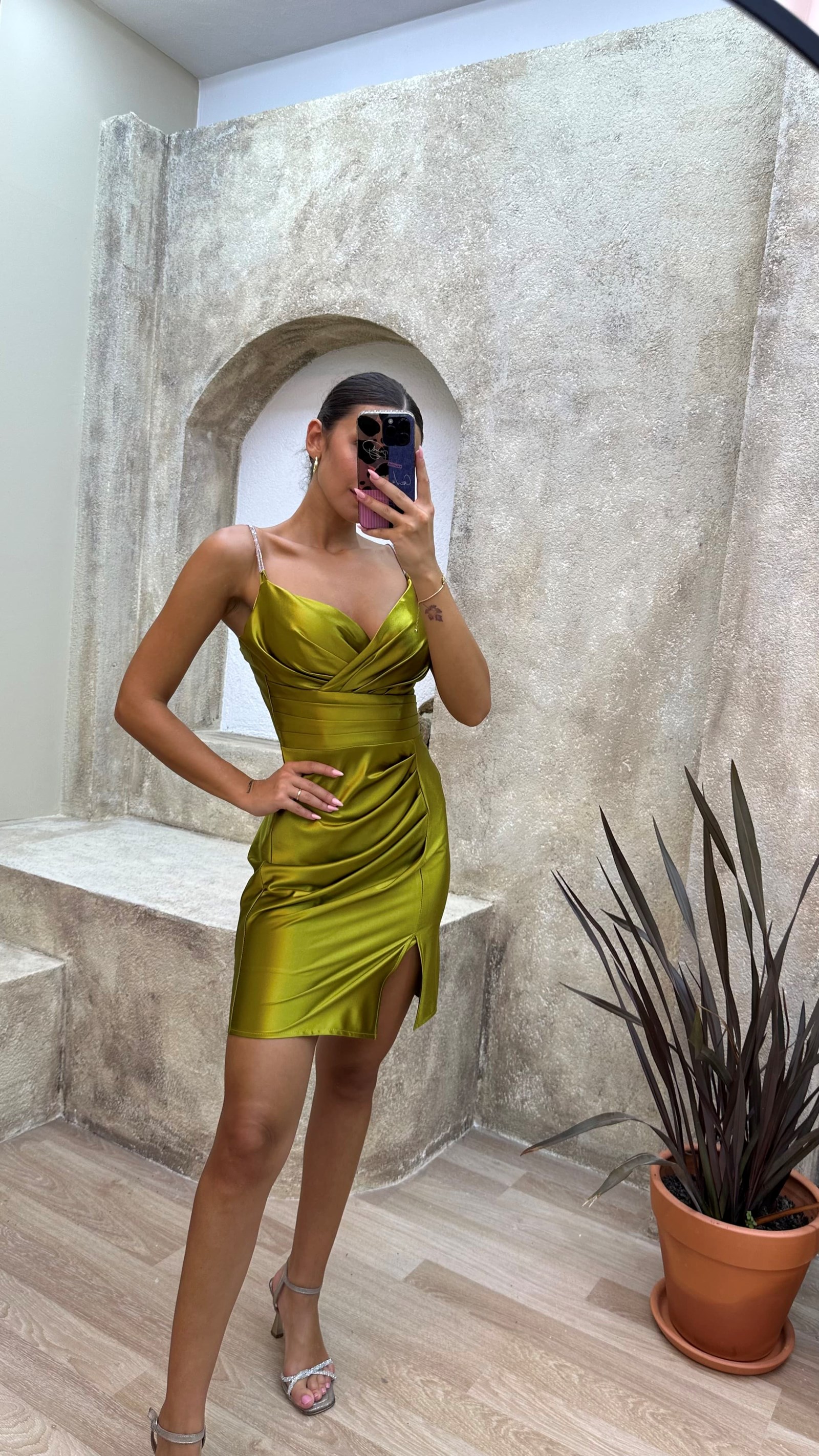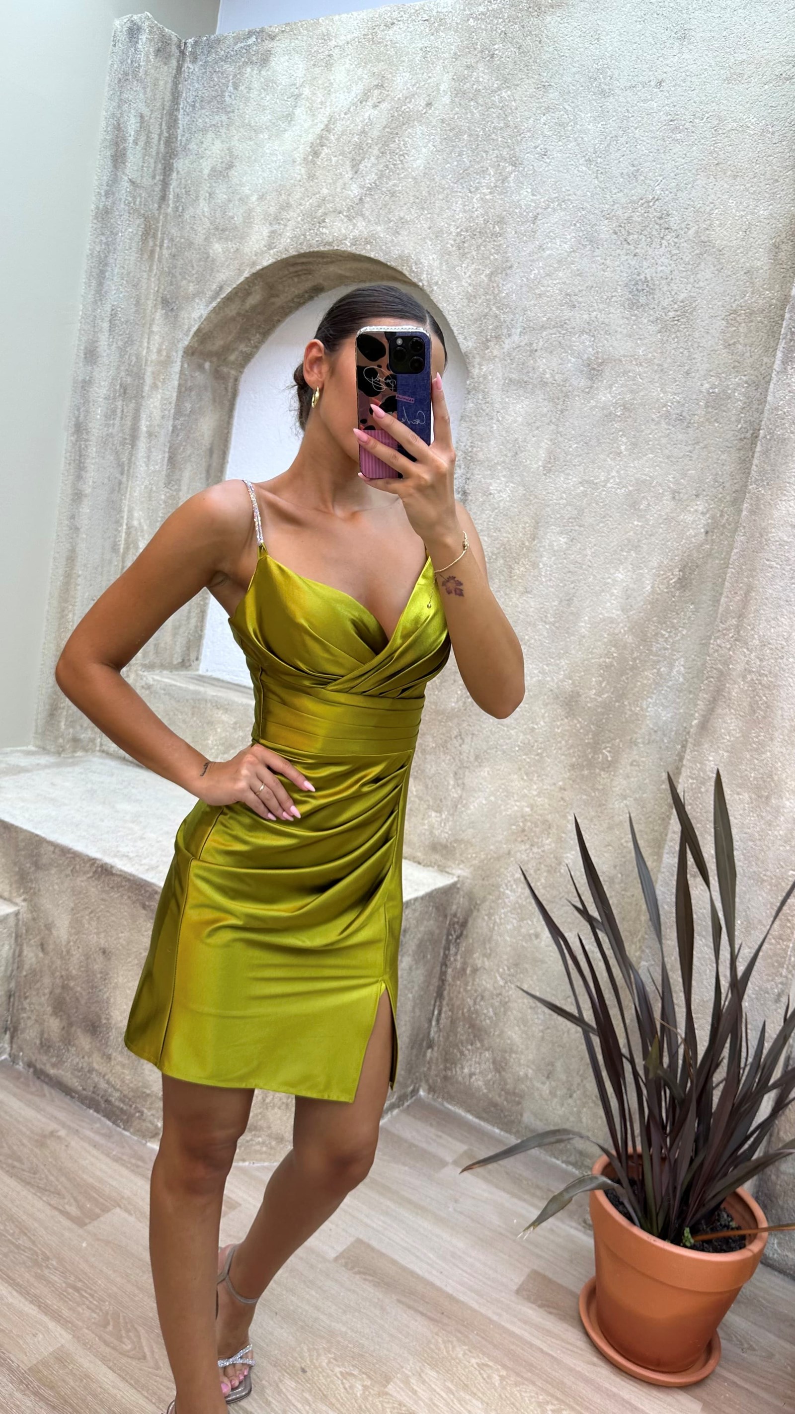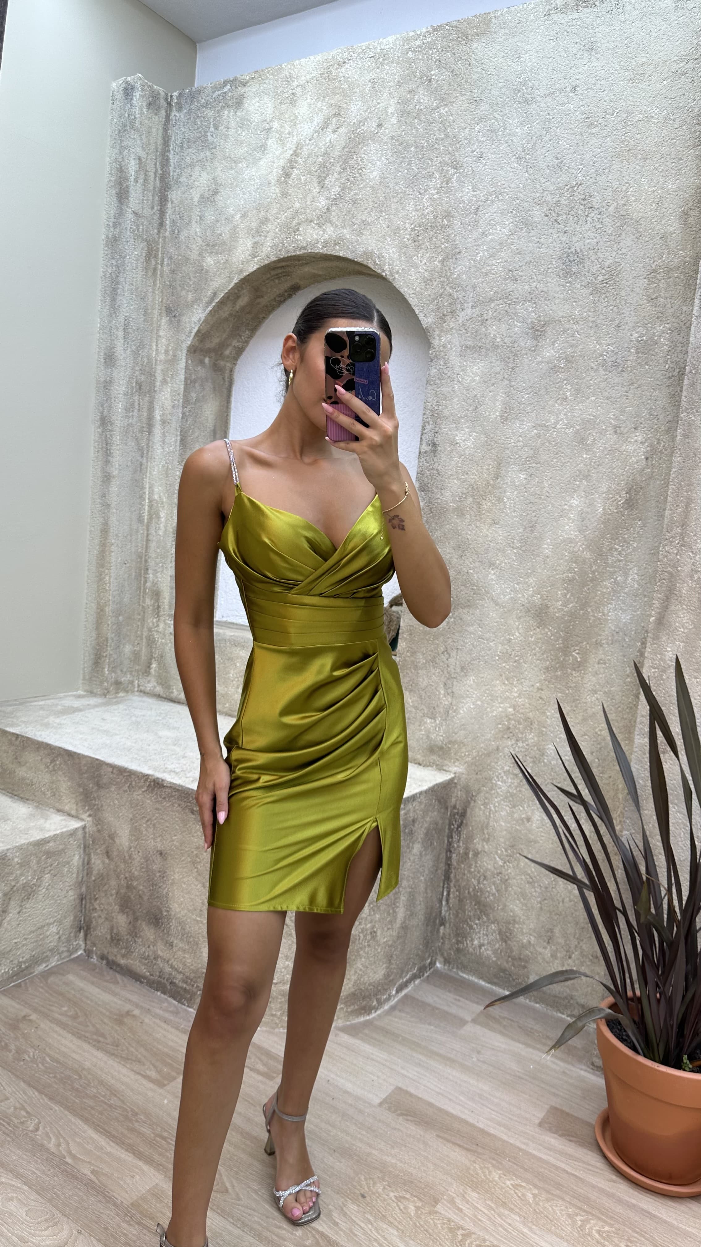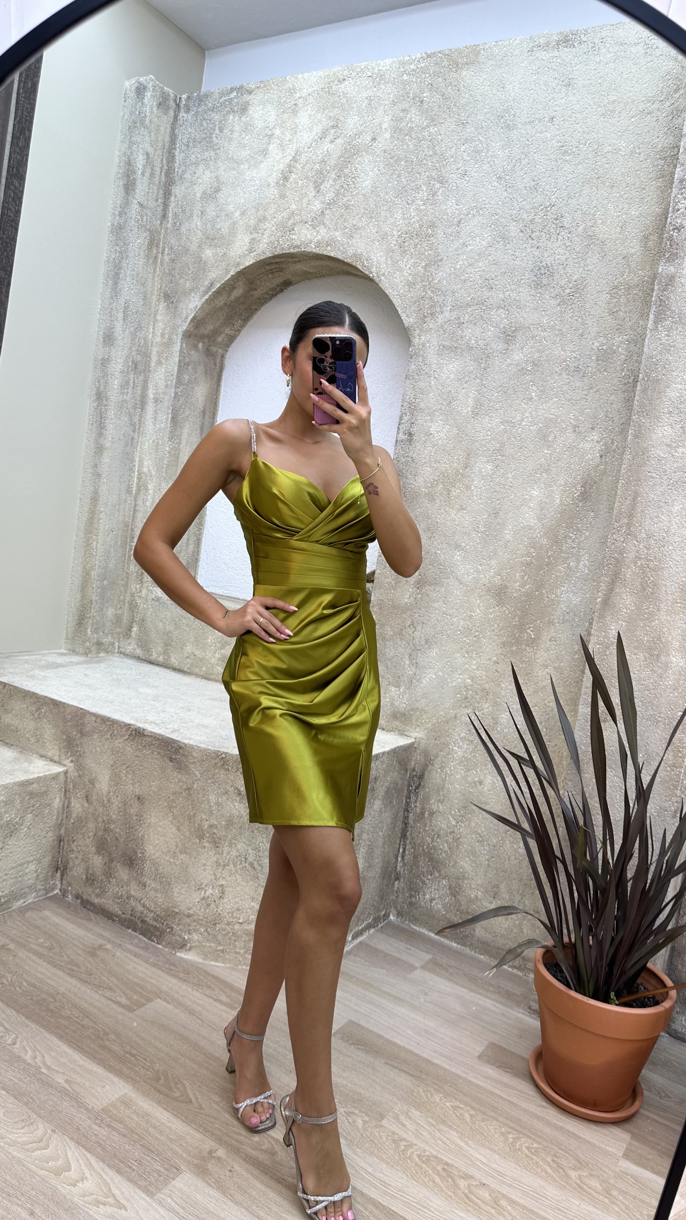 • Sarı Drapeli Saten Mini Abiye Elbise