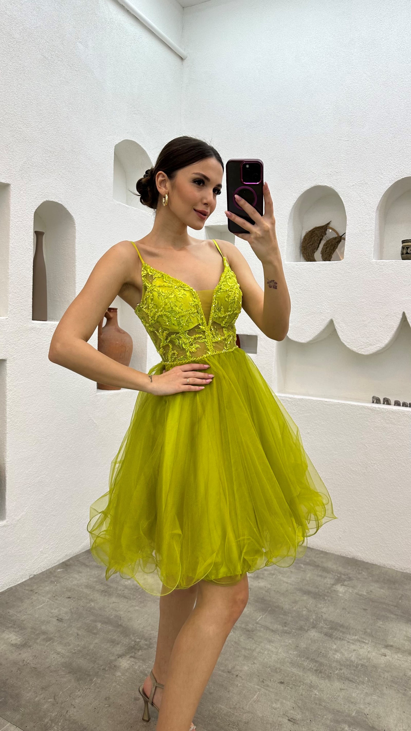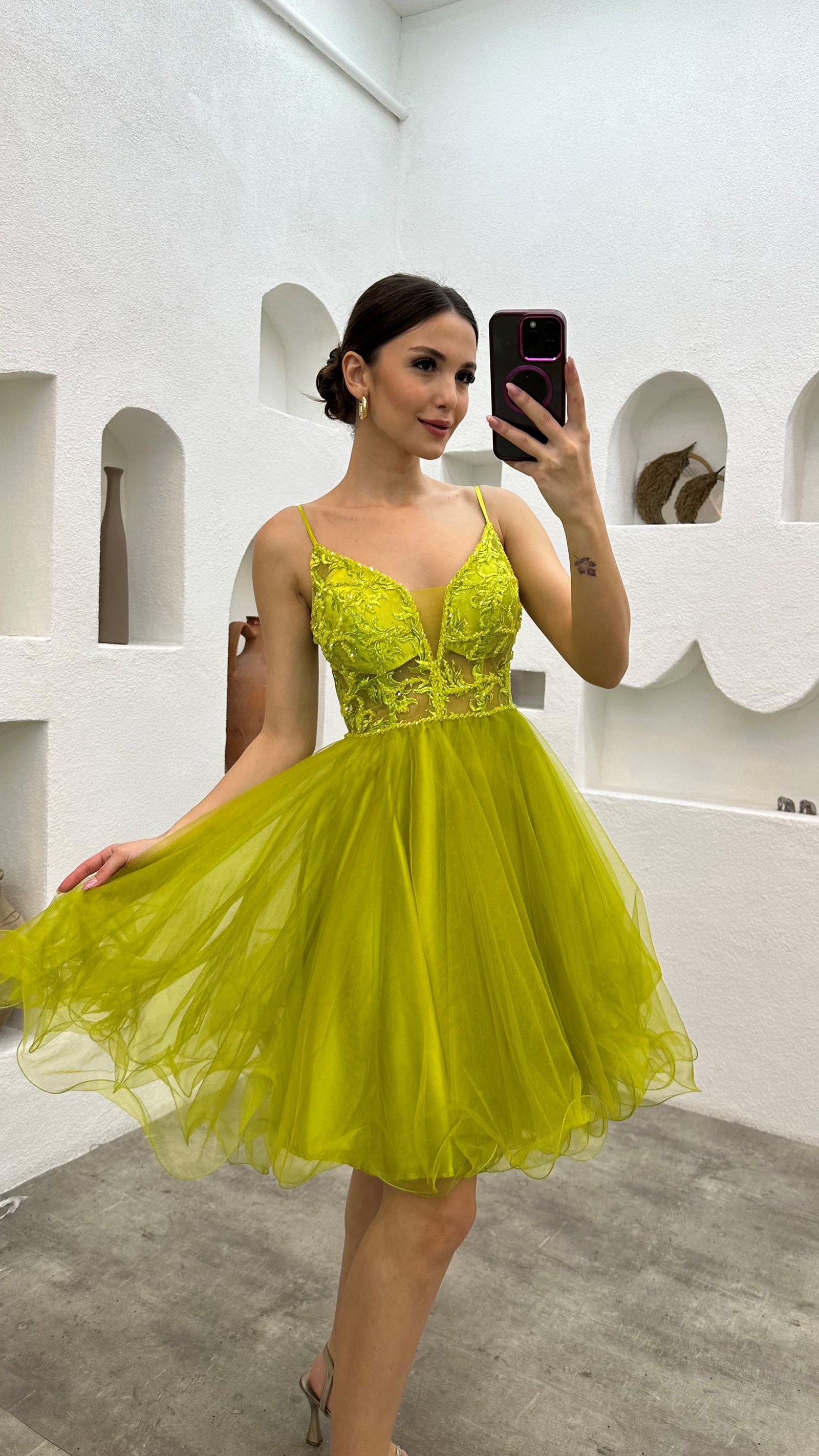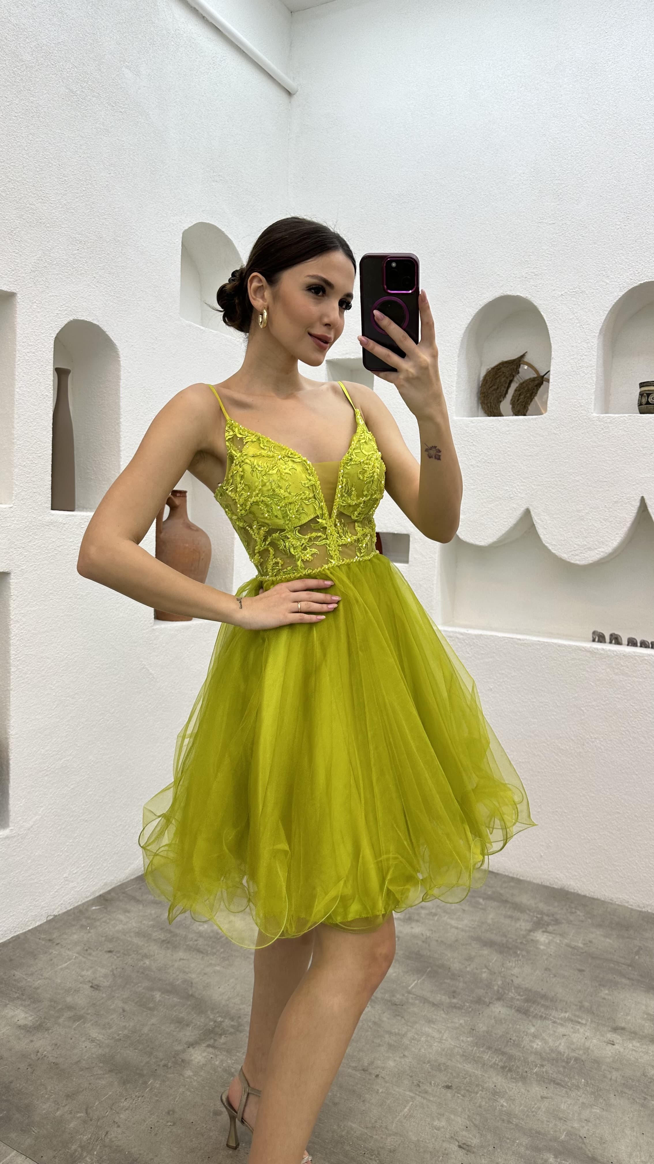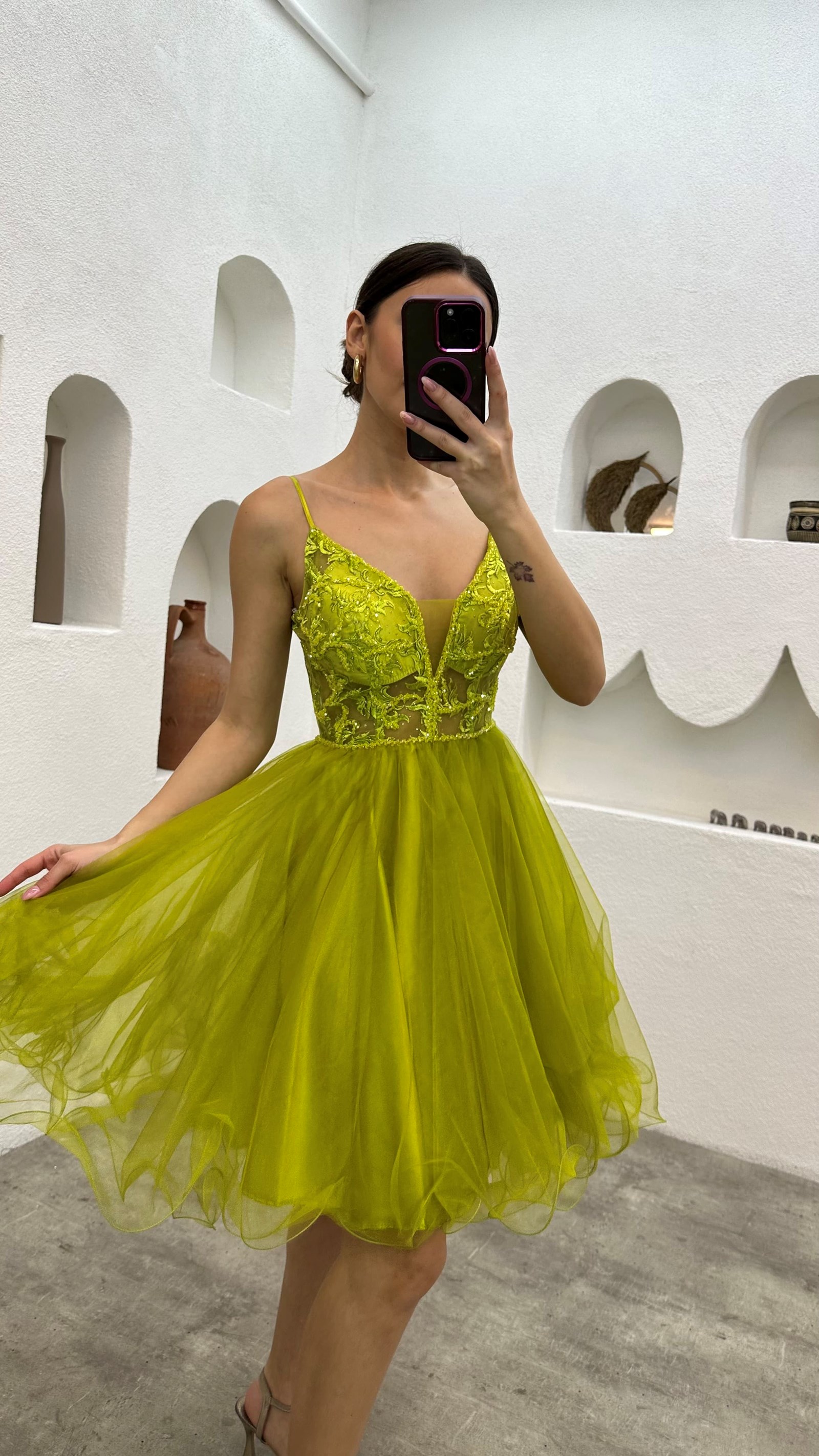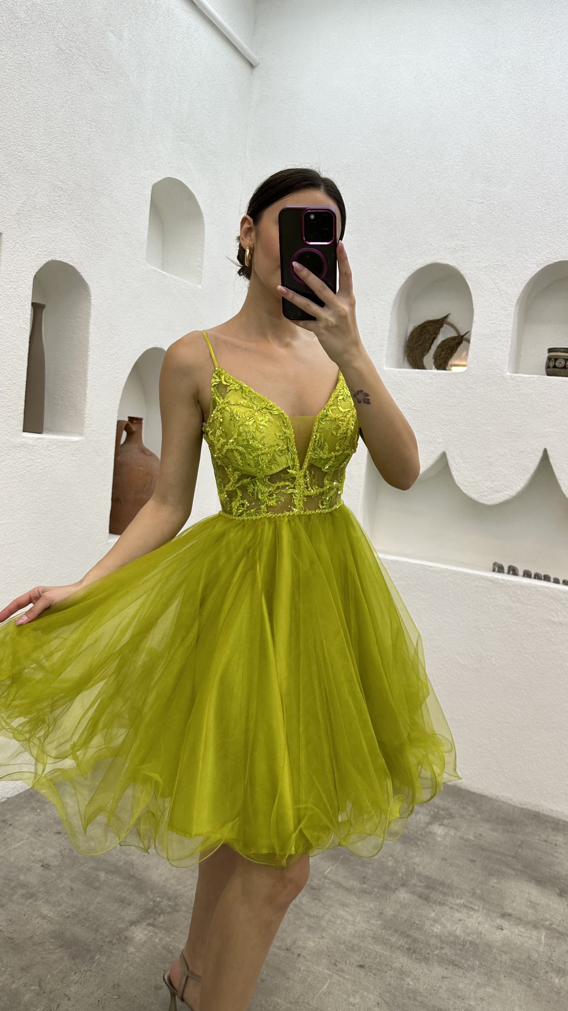 • Sarı İp Askı Taş İşleme Mini Tül Abiye Elbise