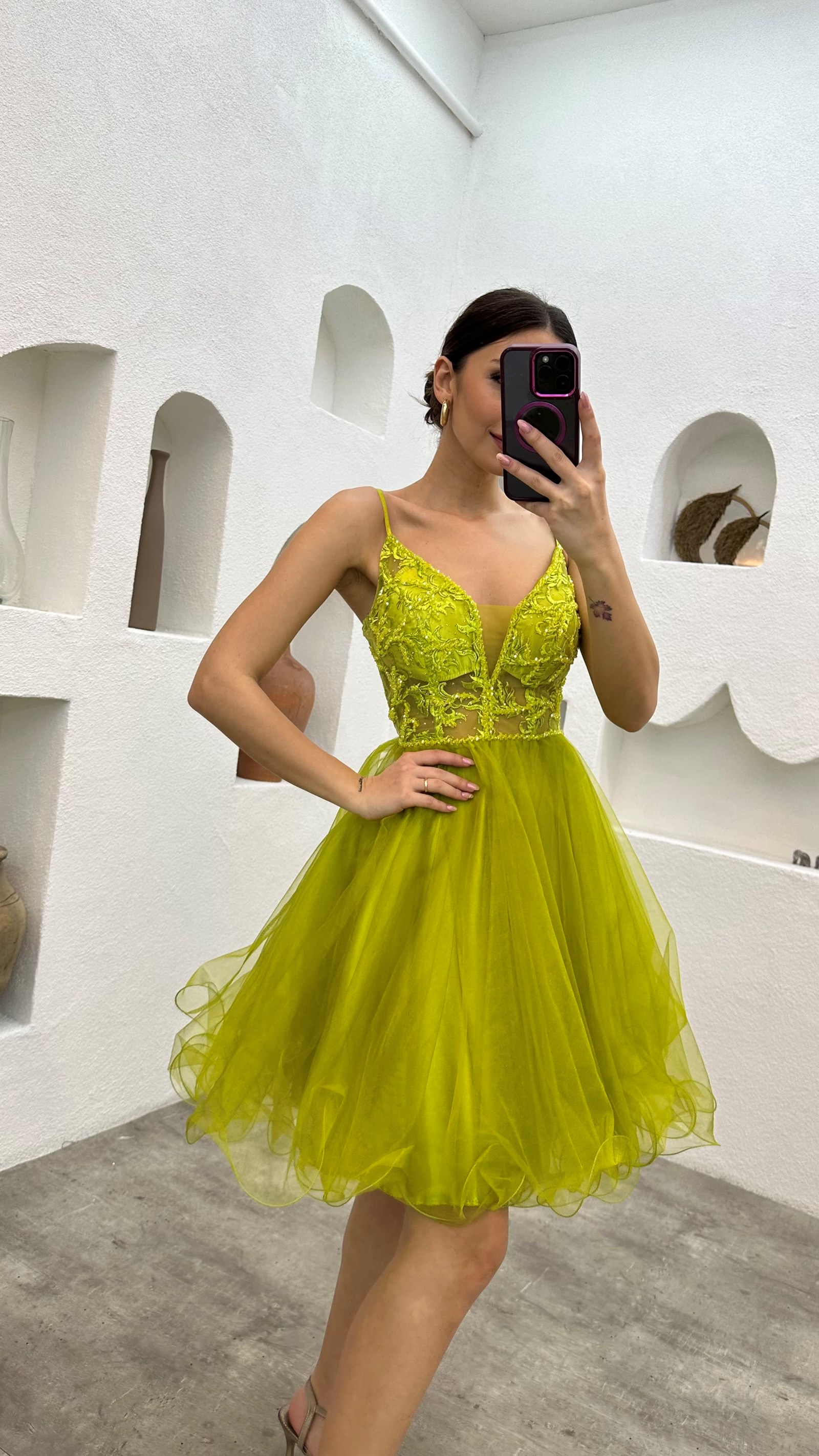 Sarı İp Askı Taş İşleme Mini Tül Abiye Elbise