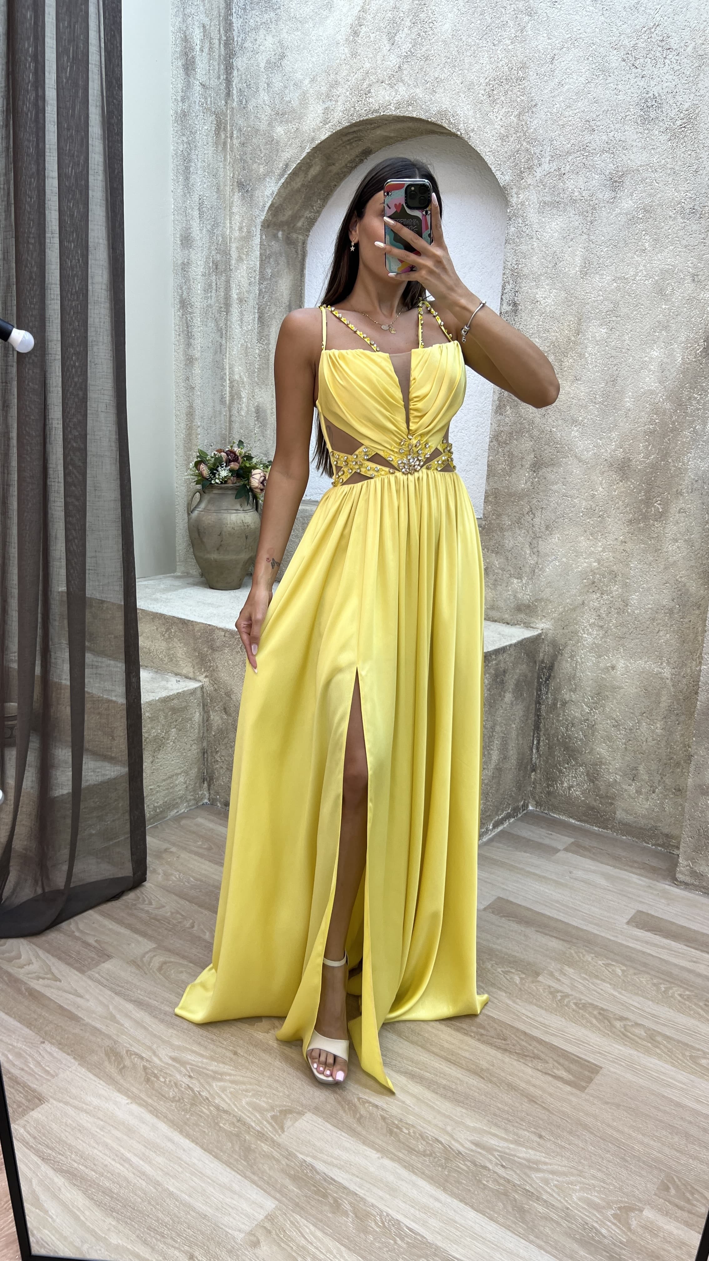 • Sarı İp Askılı Drapeli Bel Detay Abiye Elbise