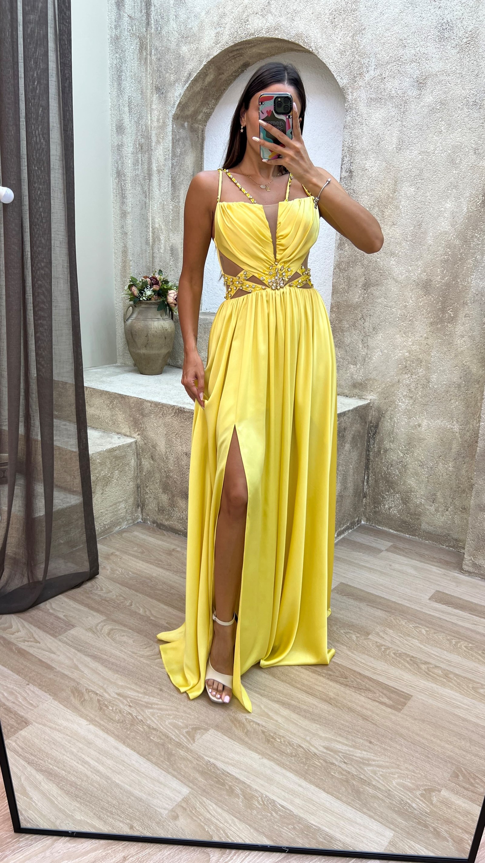 Sarı İp Askılı Drapeli Bel Detay Abiye Elbise