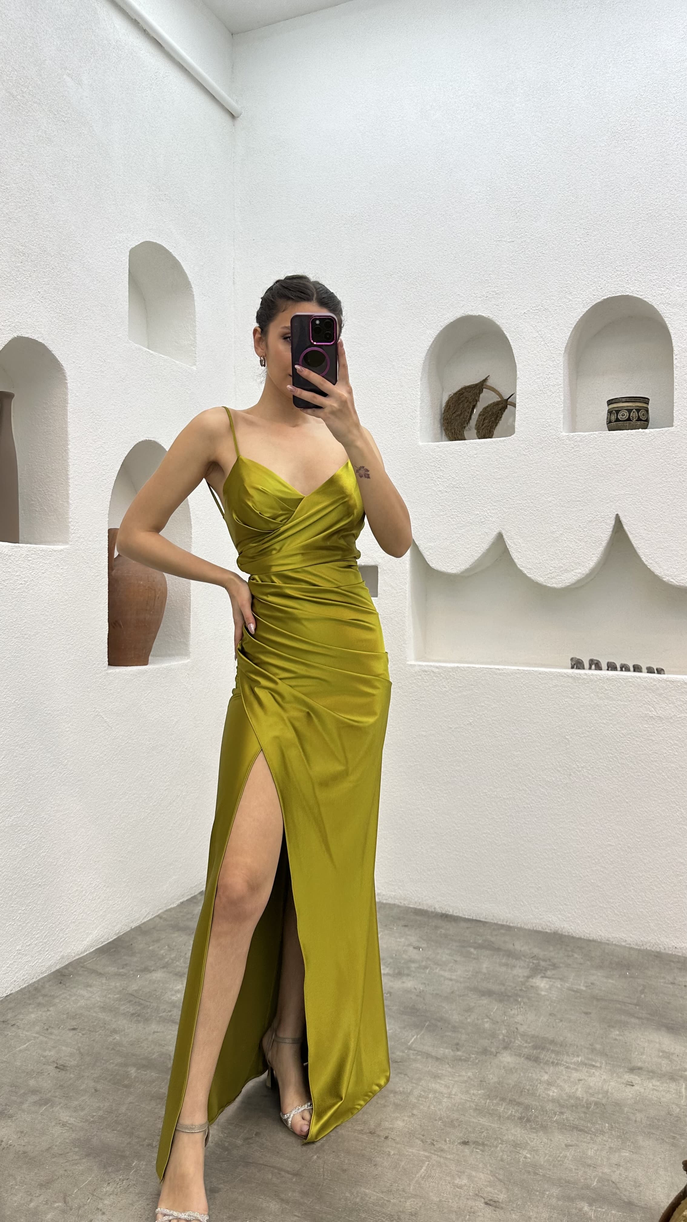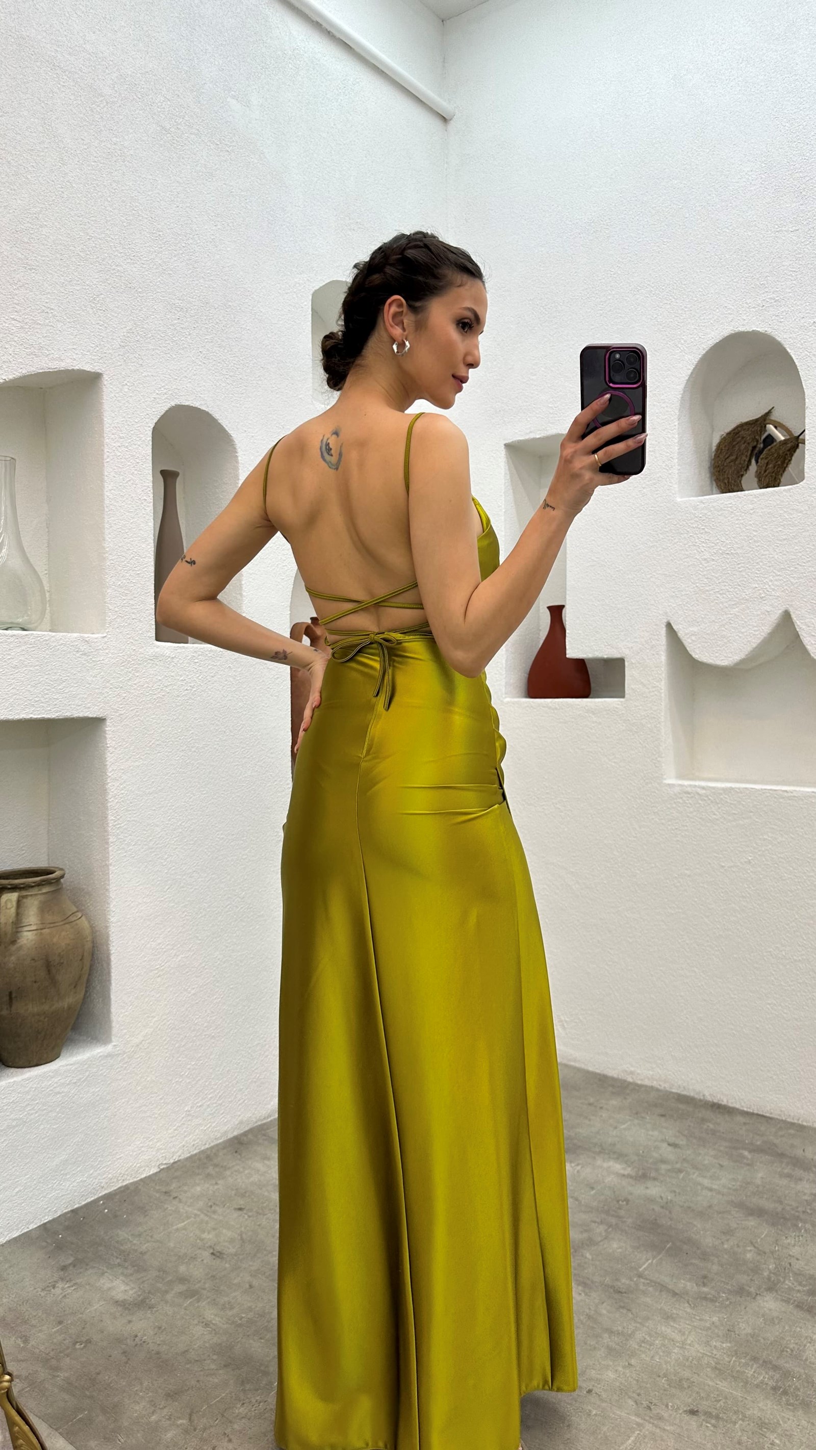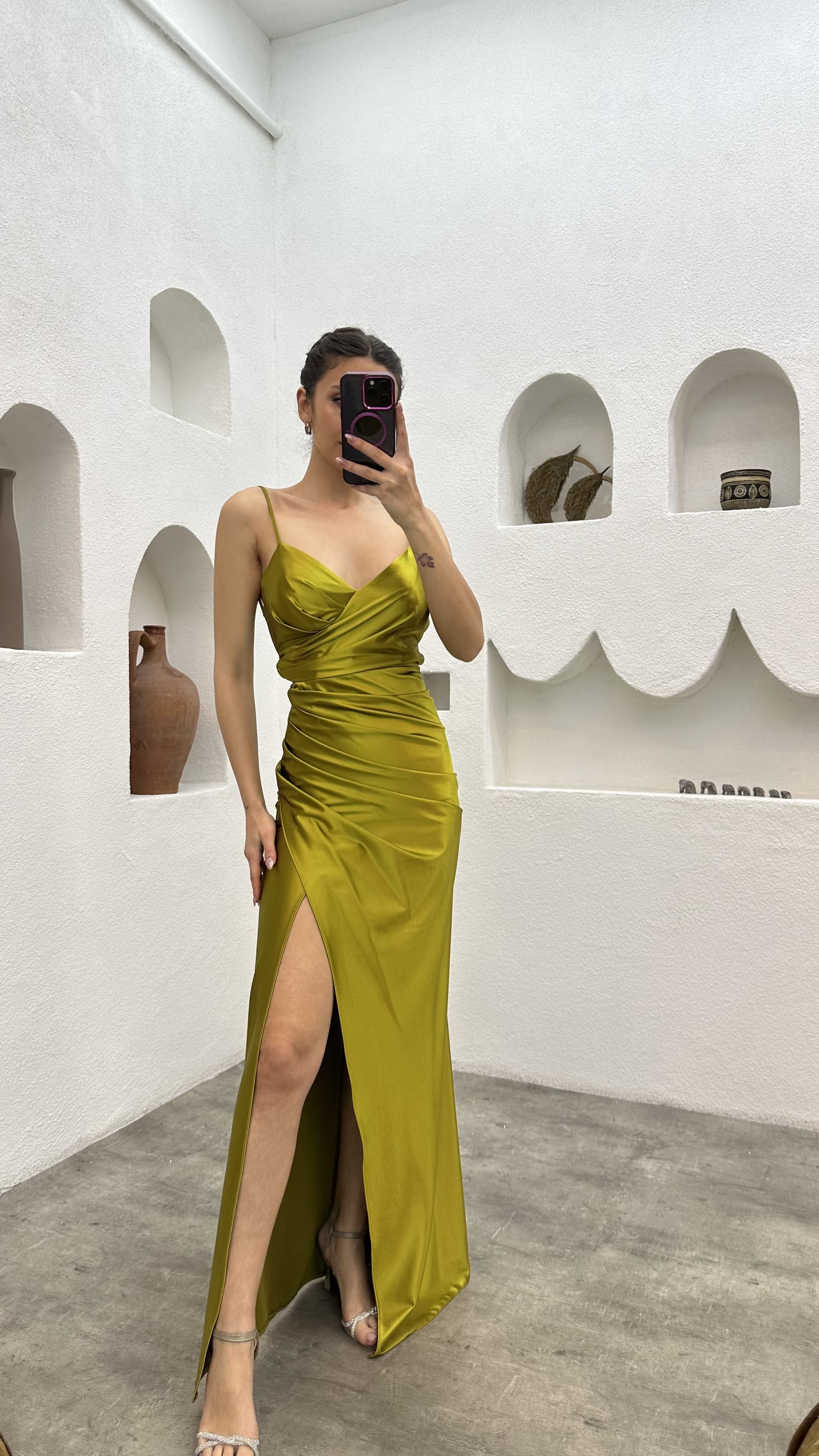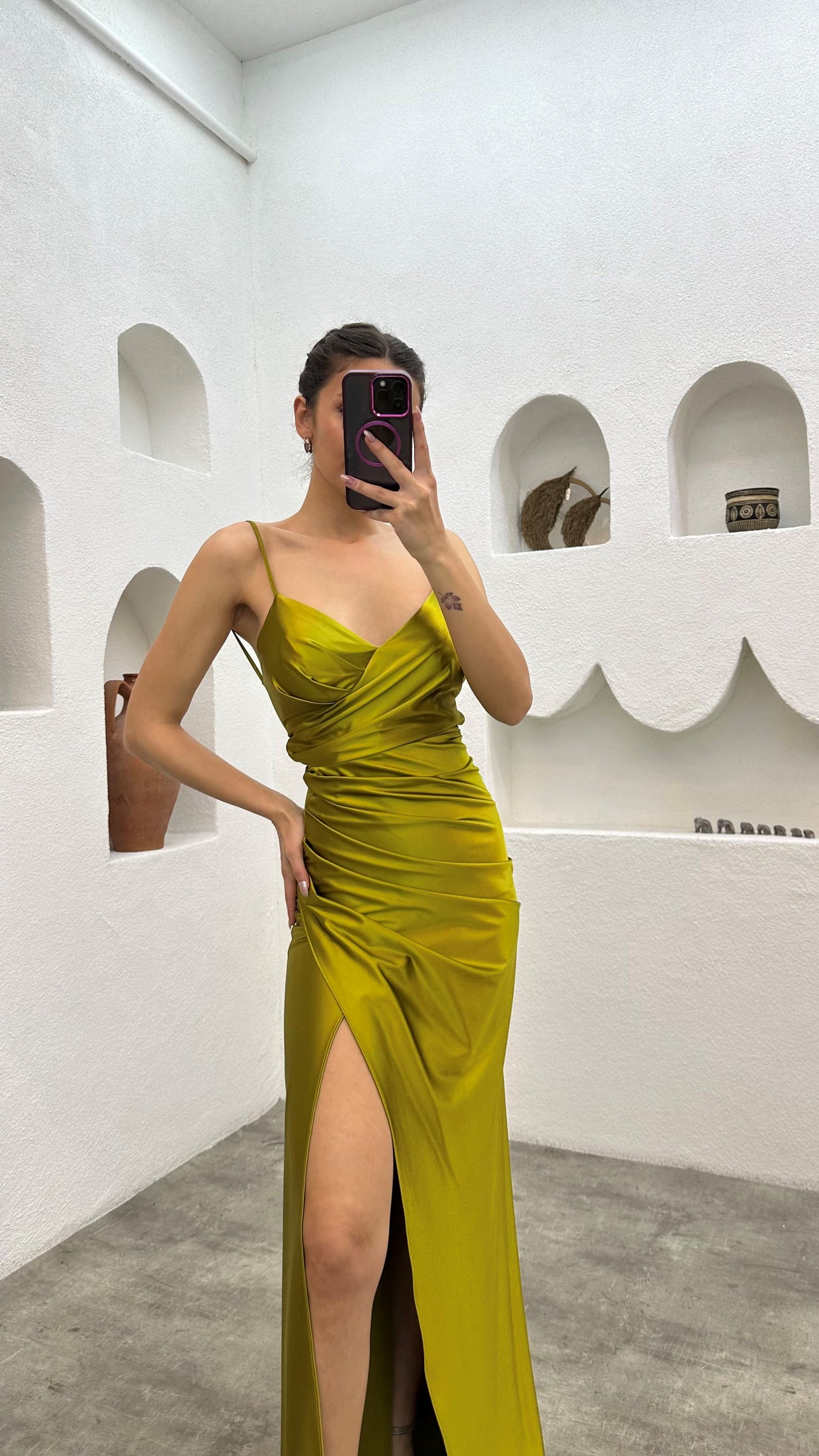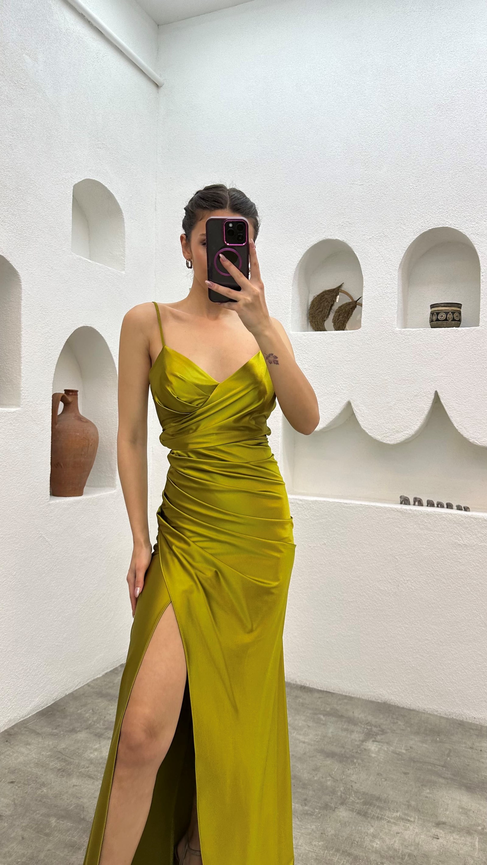 • Sarı İp Askılı Kalp Yaka Abiye Elbise