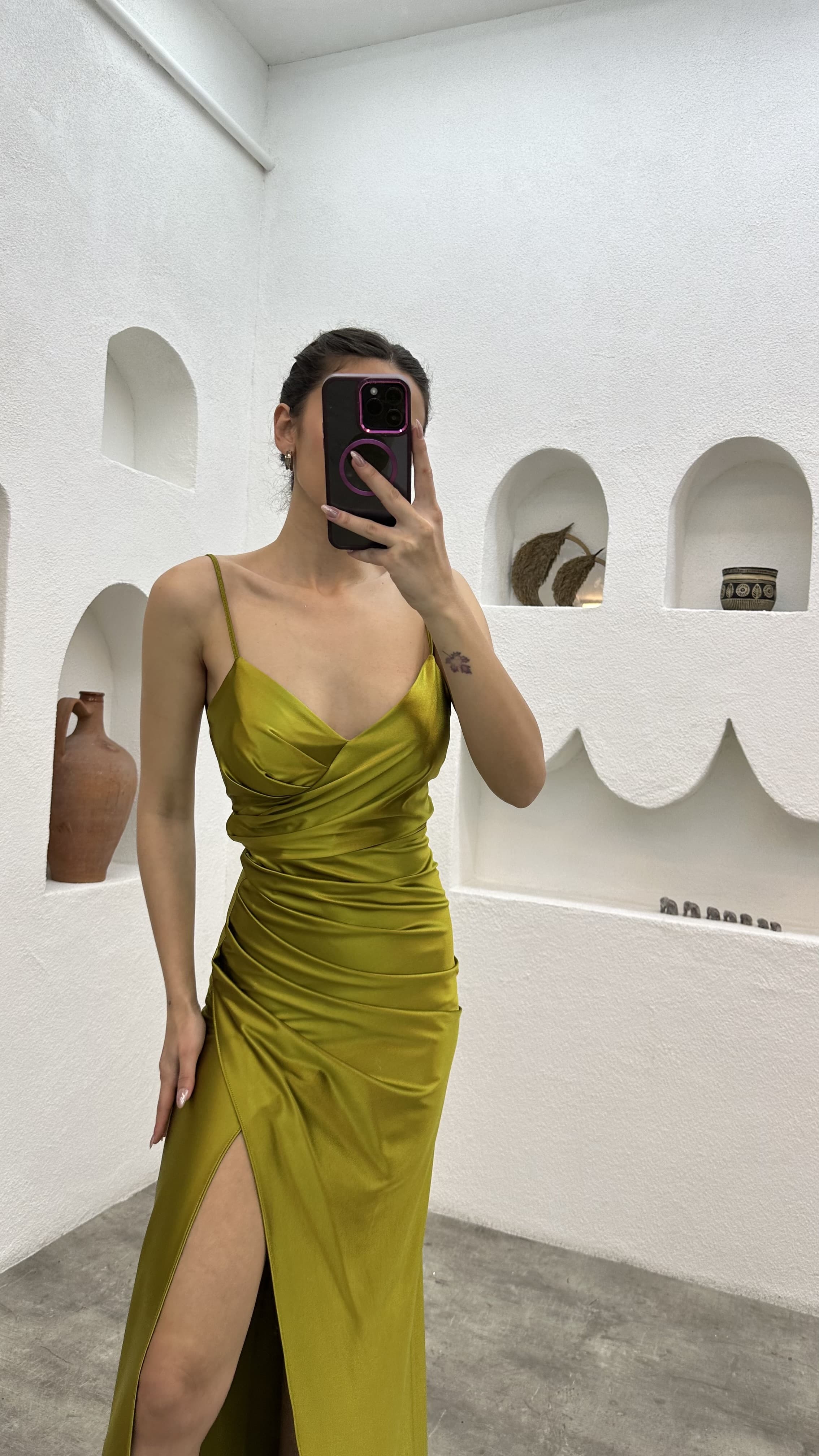 • Zümrüt İp Askılı Kalp Yaka Abiye Elbise