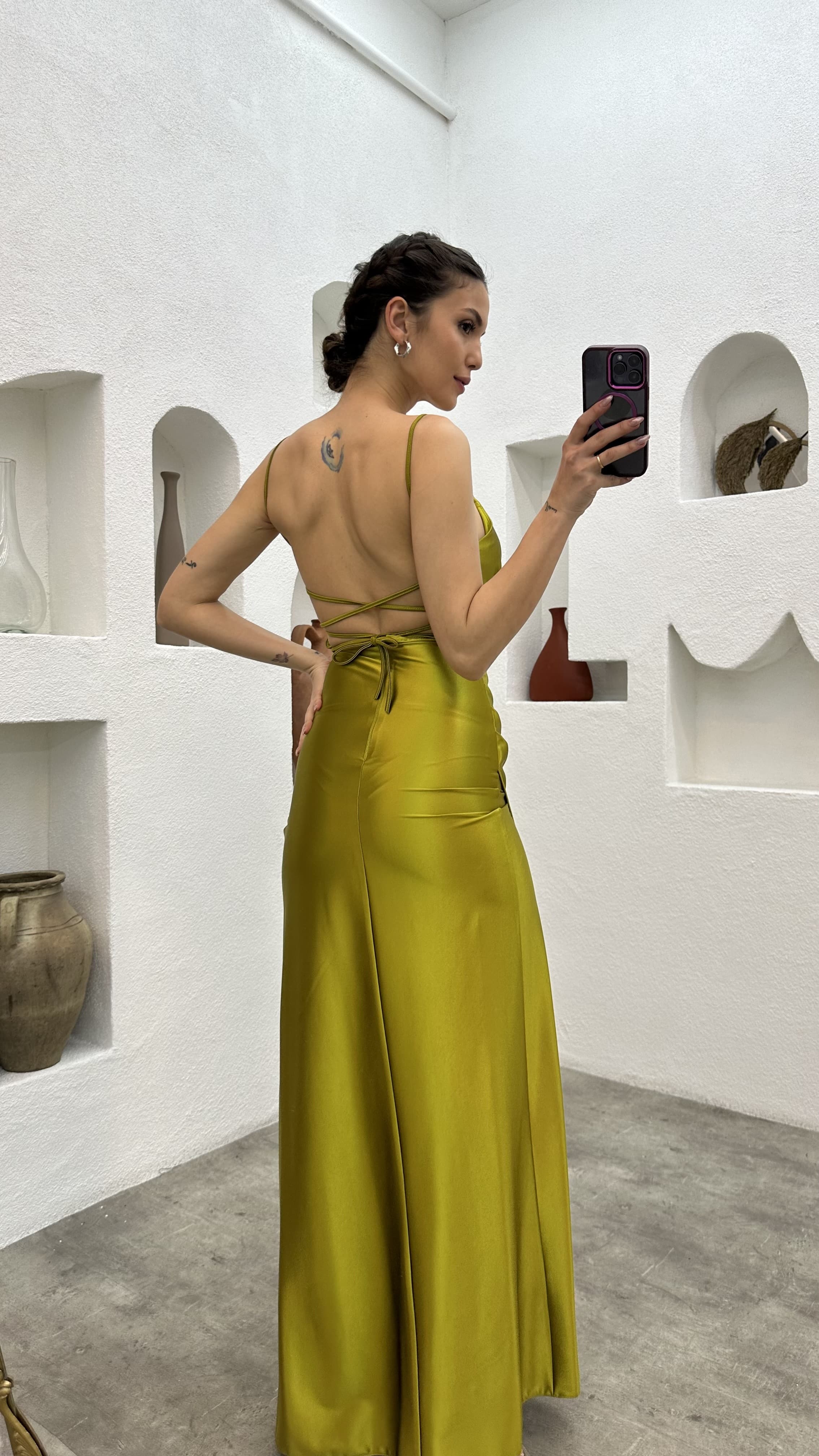 • Bej İp Askılı Sırt Detay Abiye Elbise
