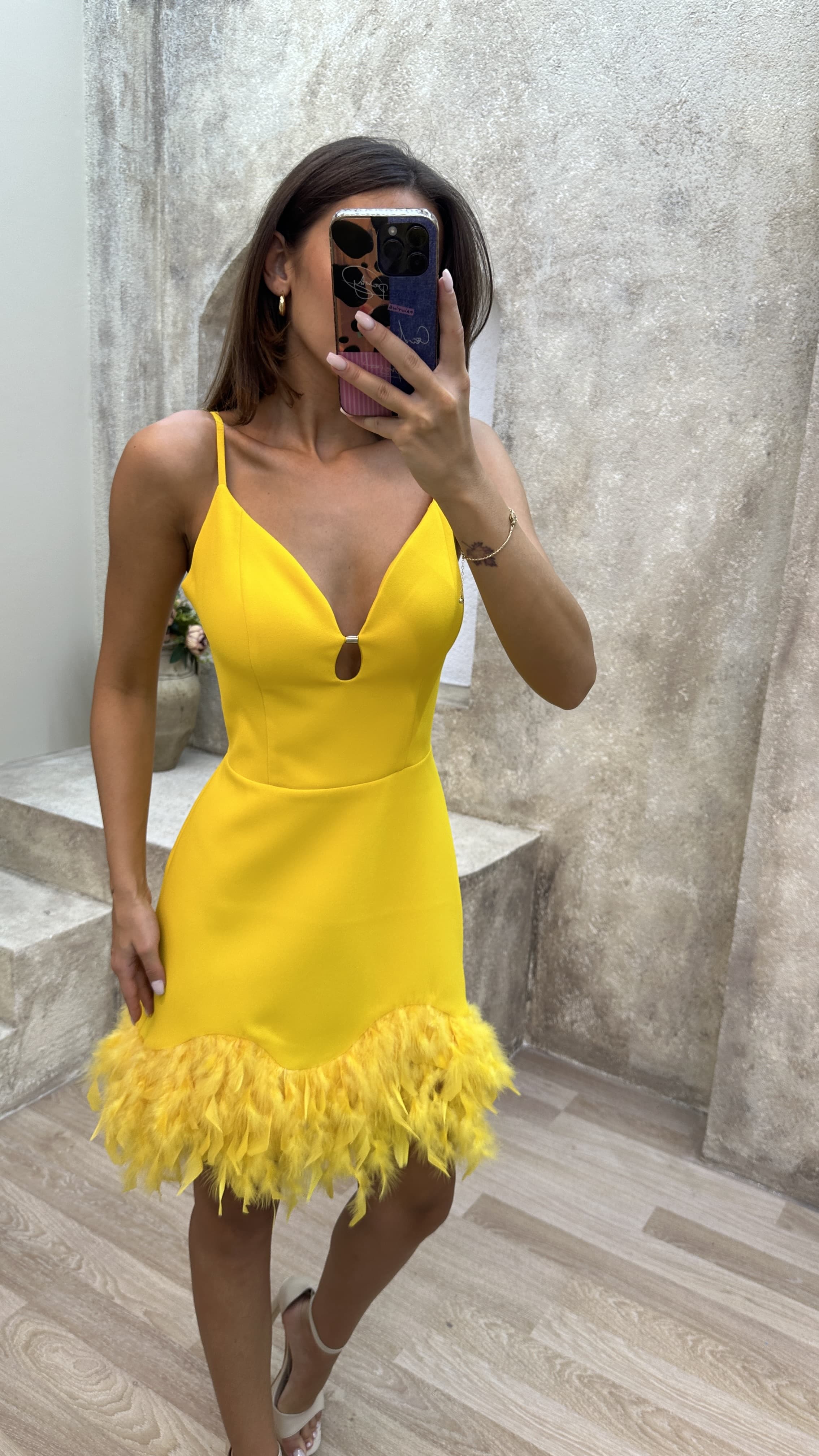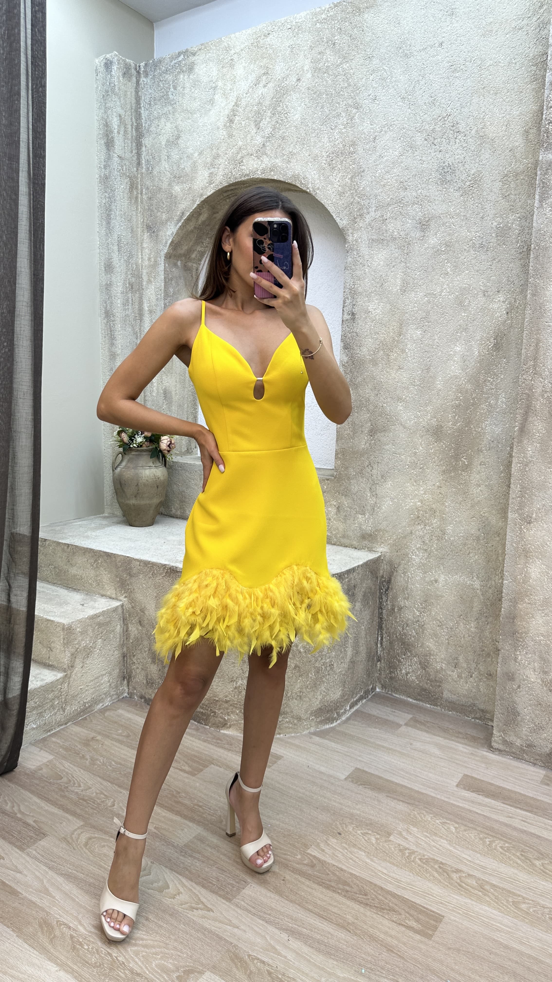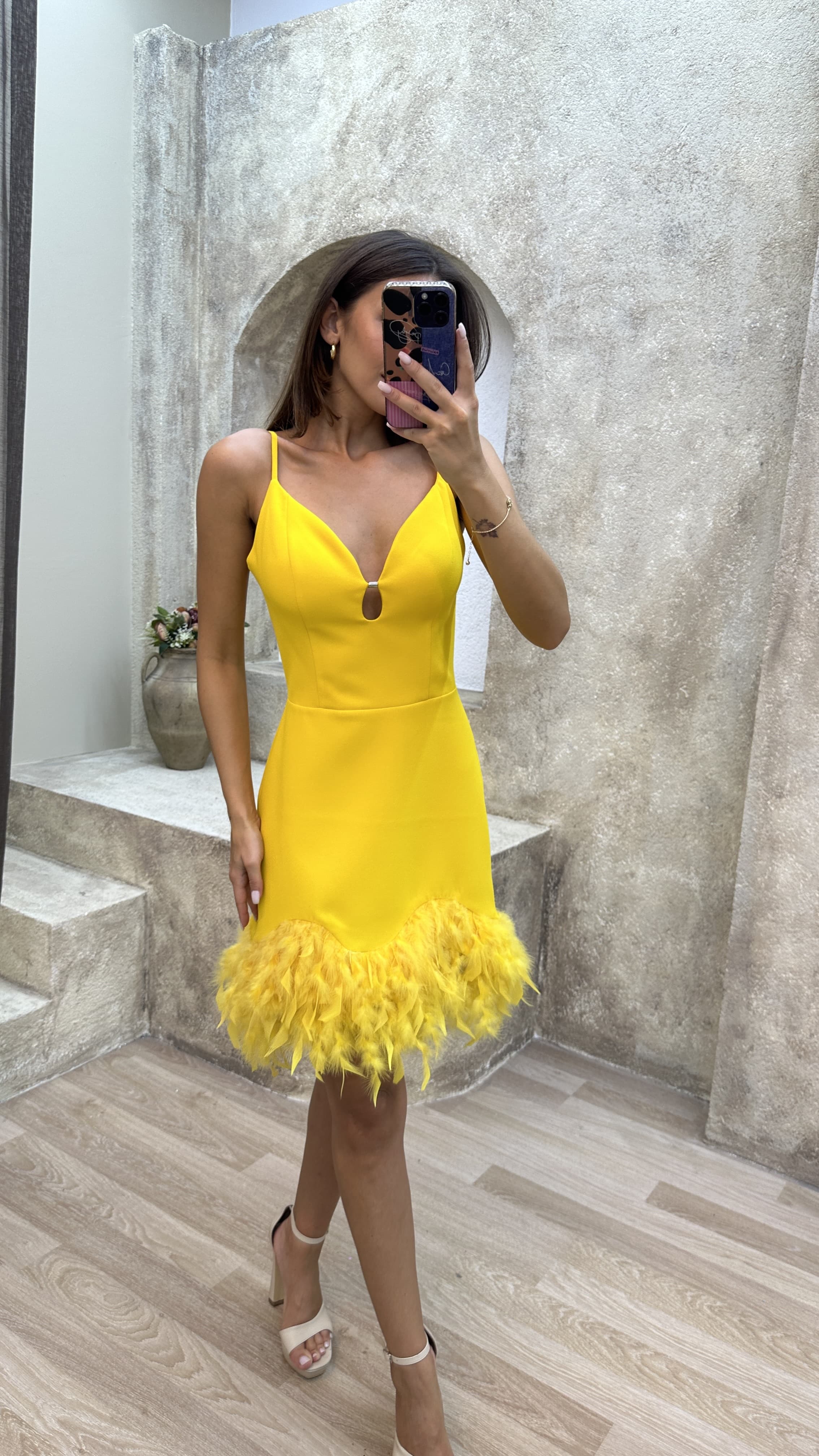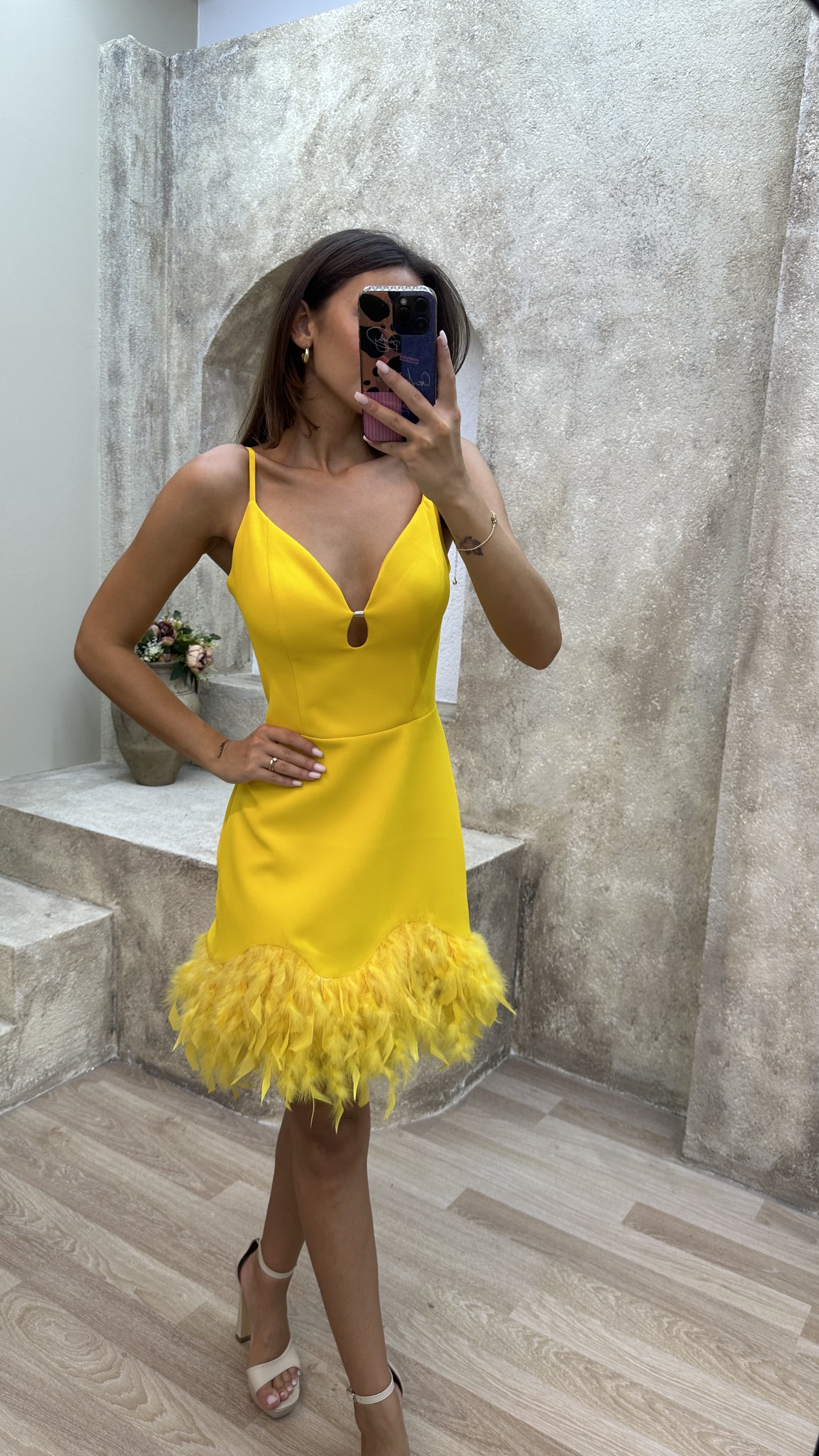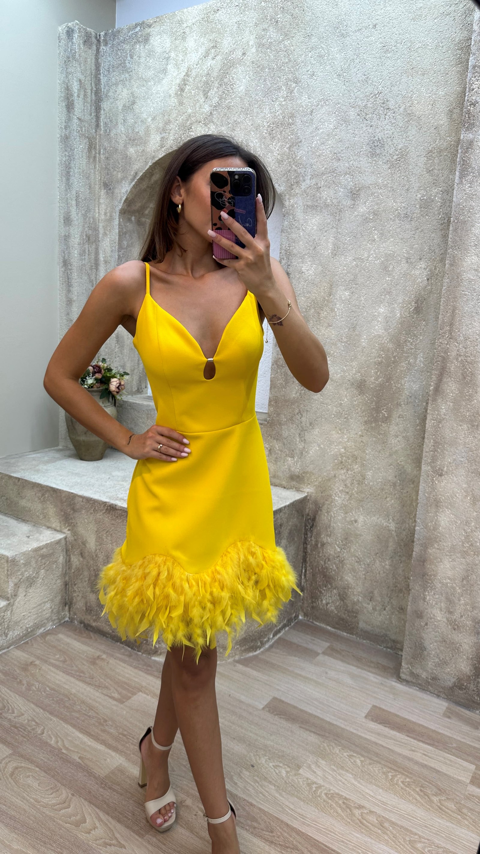 • Sarı İp Askılı Tüy Detay Mini Elbise