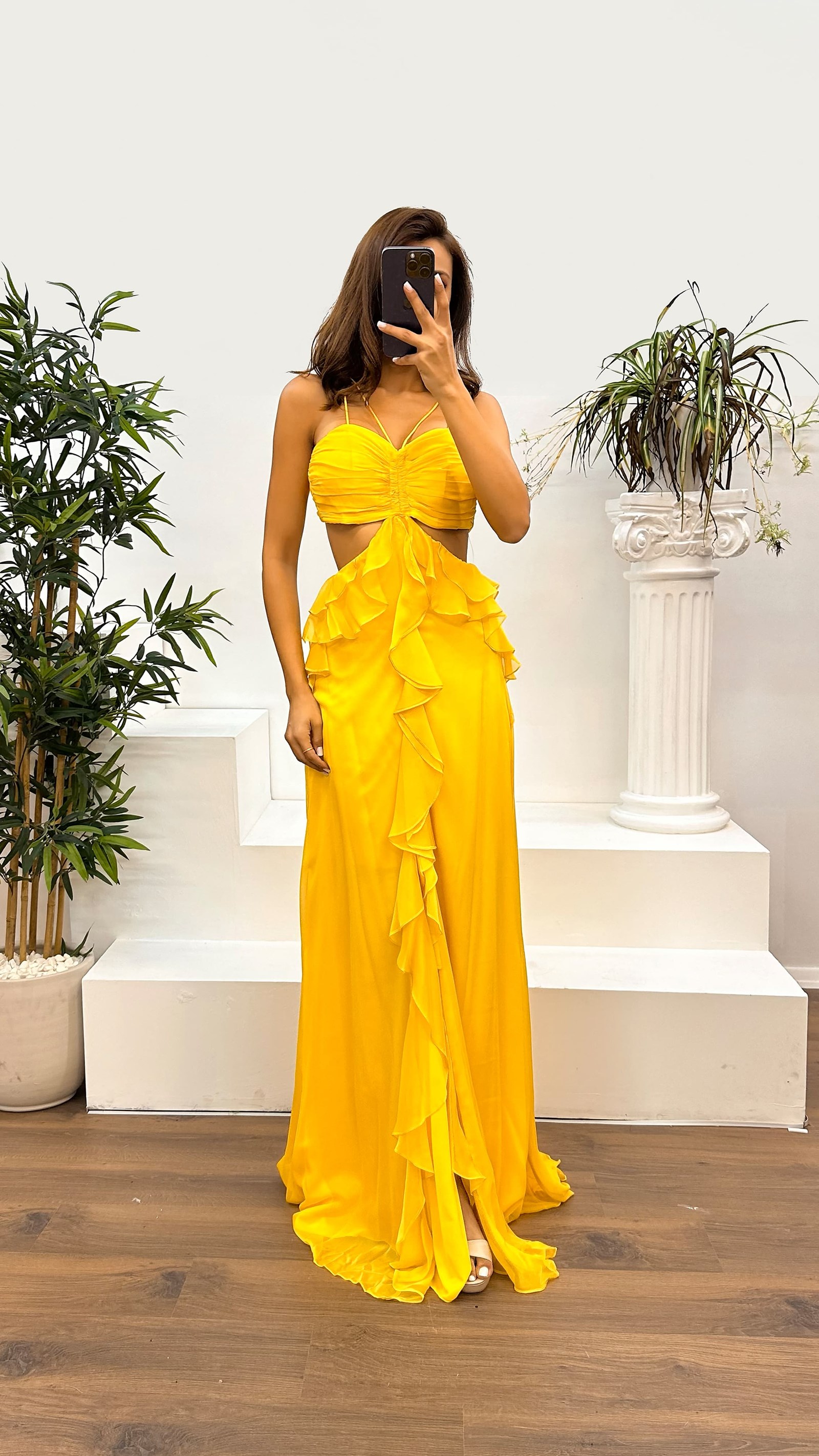 Sarı İp Askılı Valonlu Sırt Detay Abiye Elbise