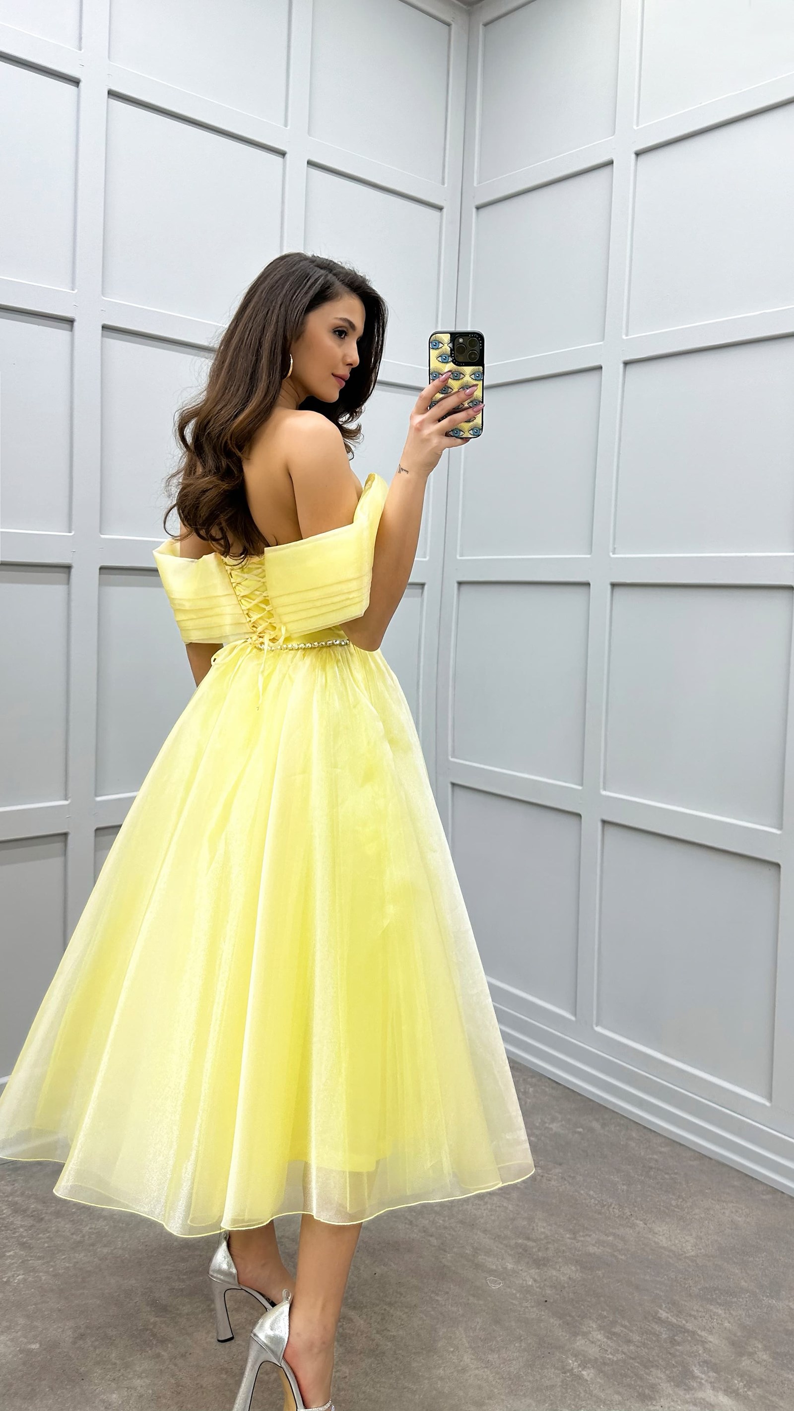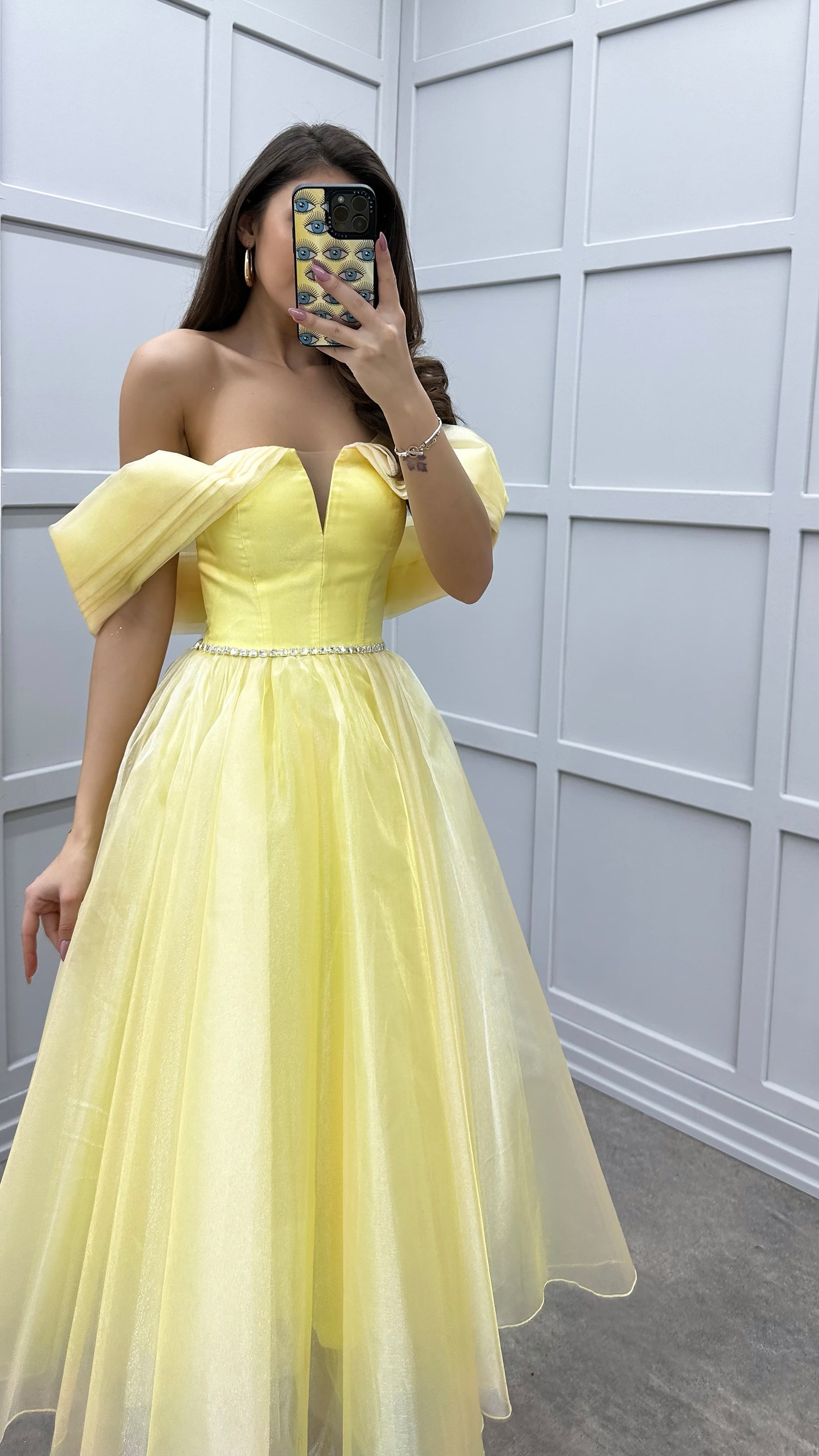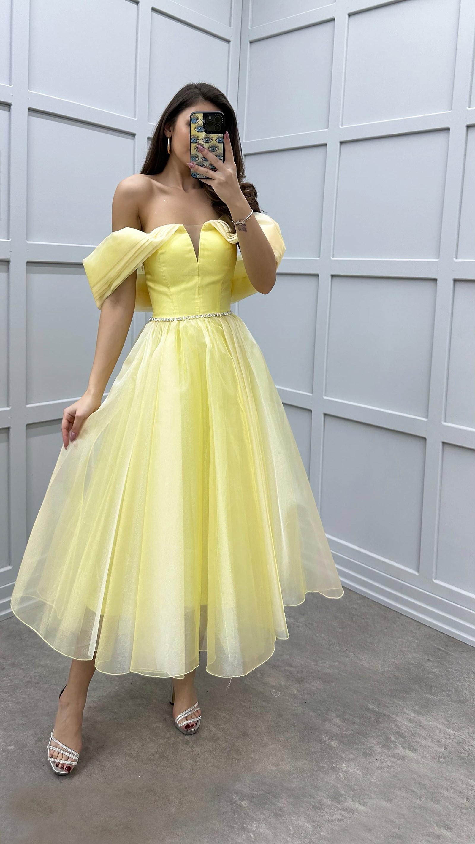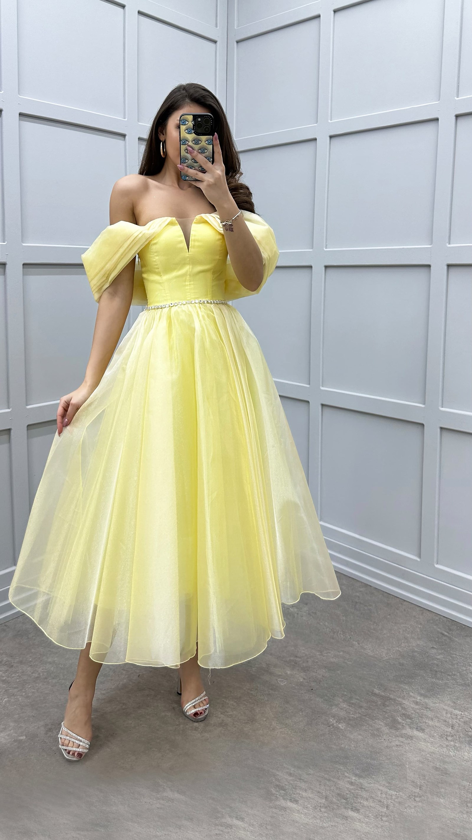 • Sarı Omuz Detay Beli Taşlı Tasarım Tül Elbise