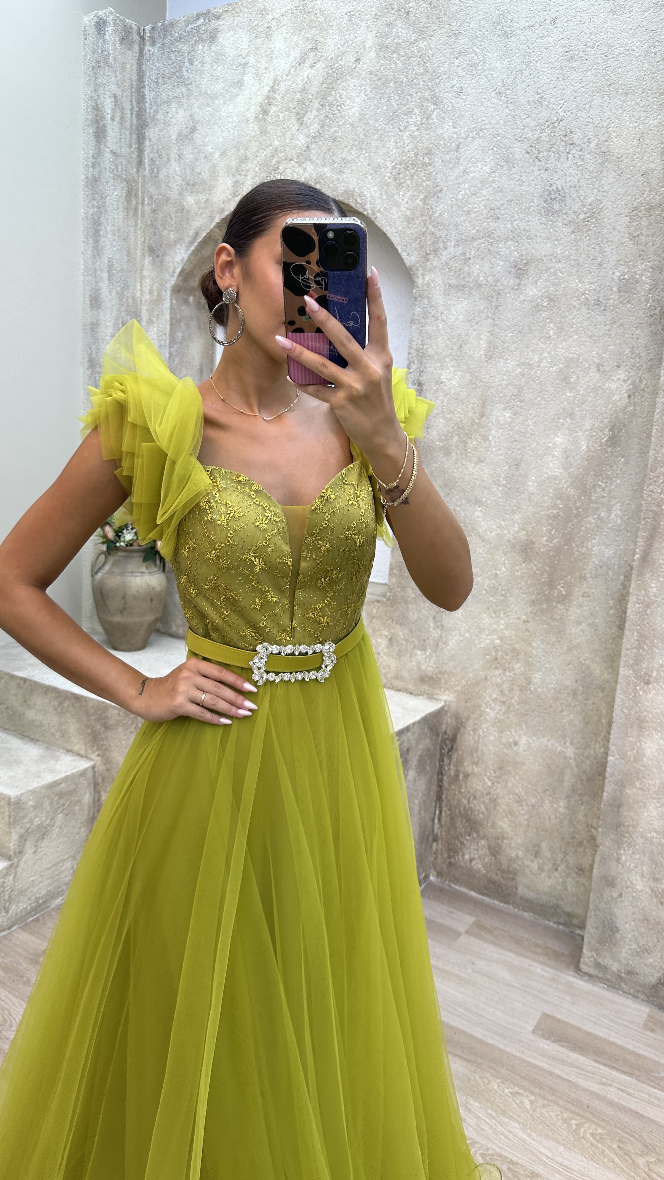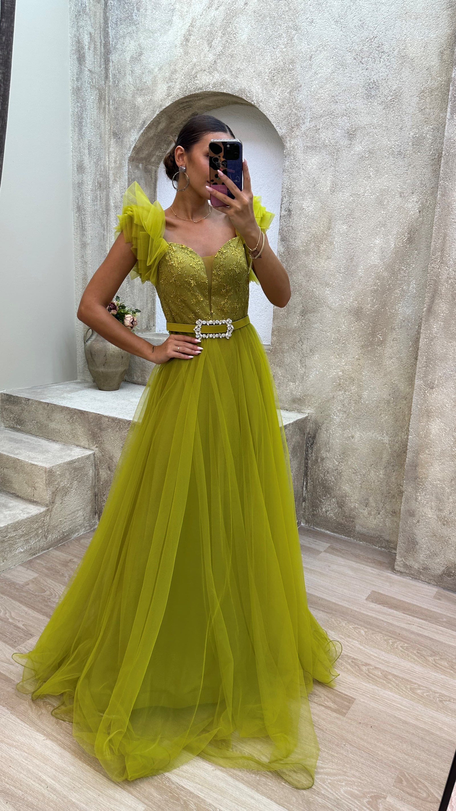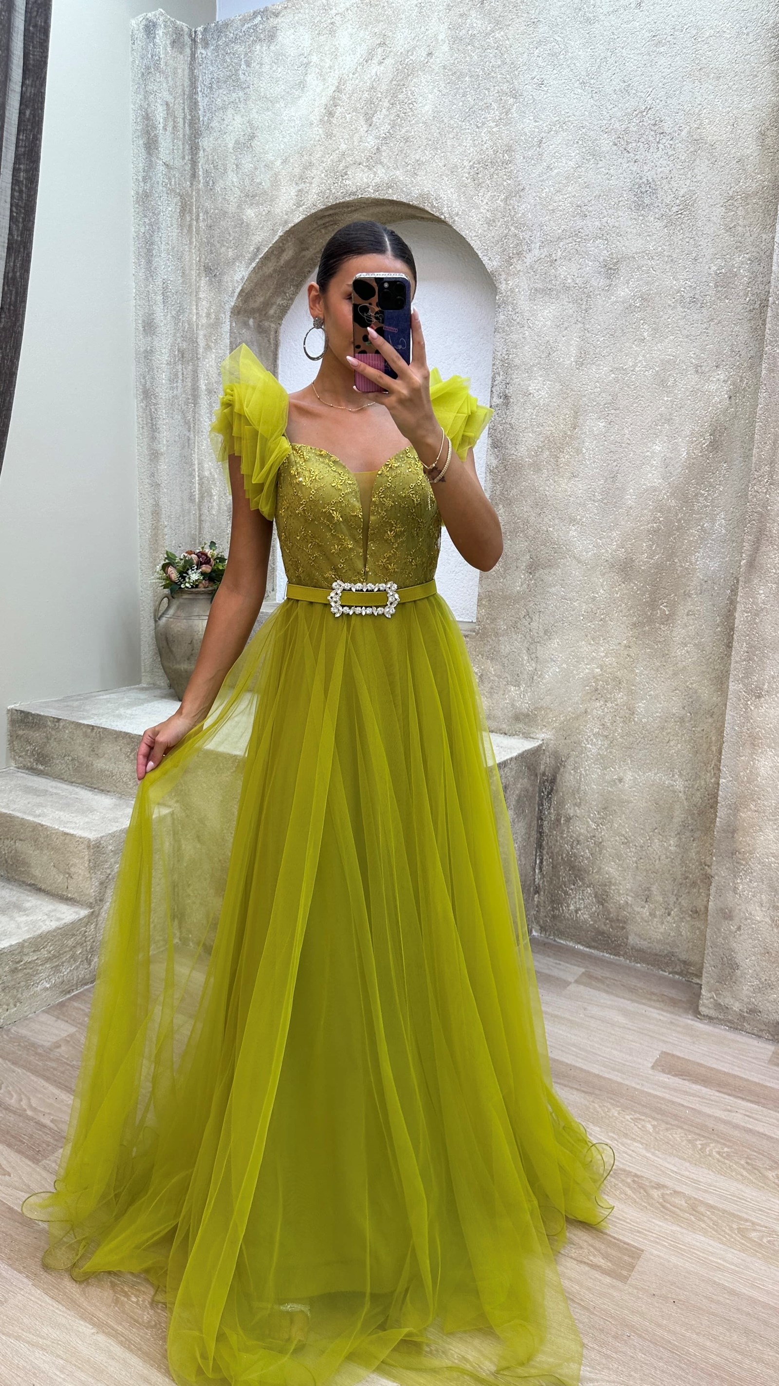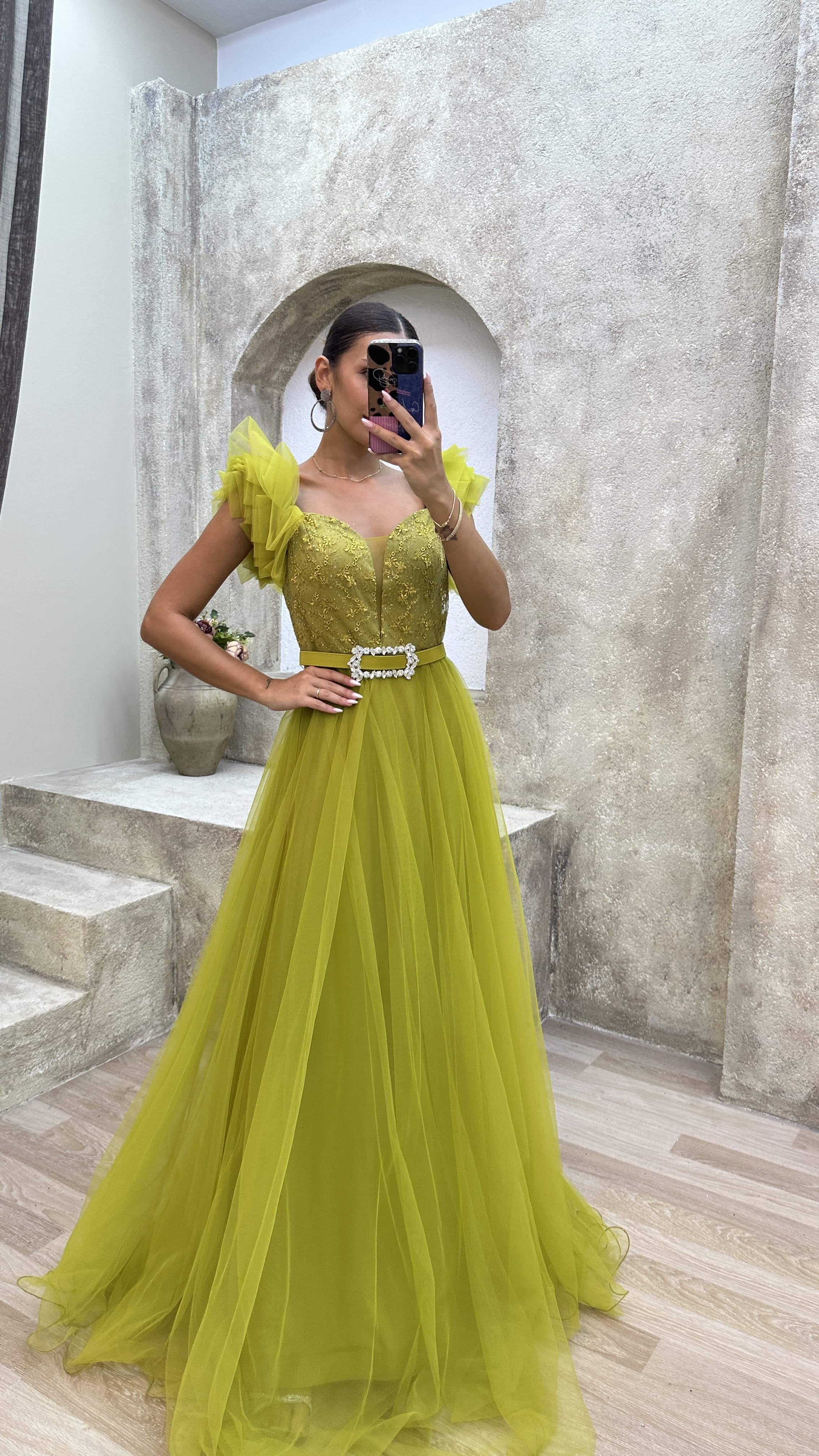 • Sarı Omuz Detay Göğsü İşlemeli Tül Abiye Elbise