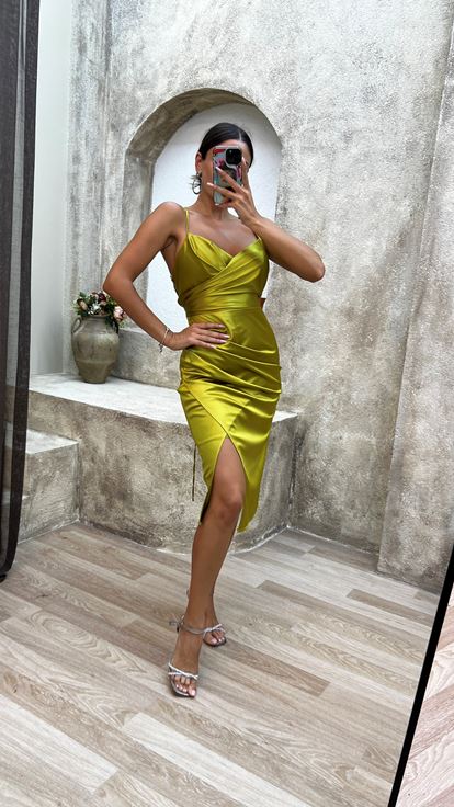 • Sarı Sırtı Çapraz Büzgülü Midi Elbise