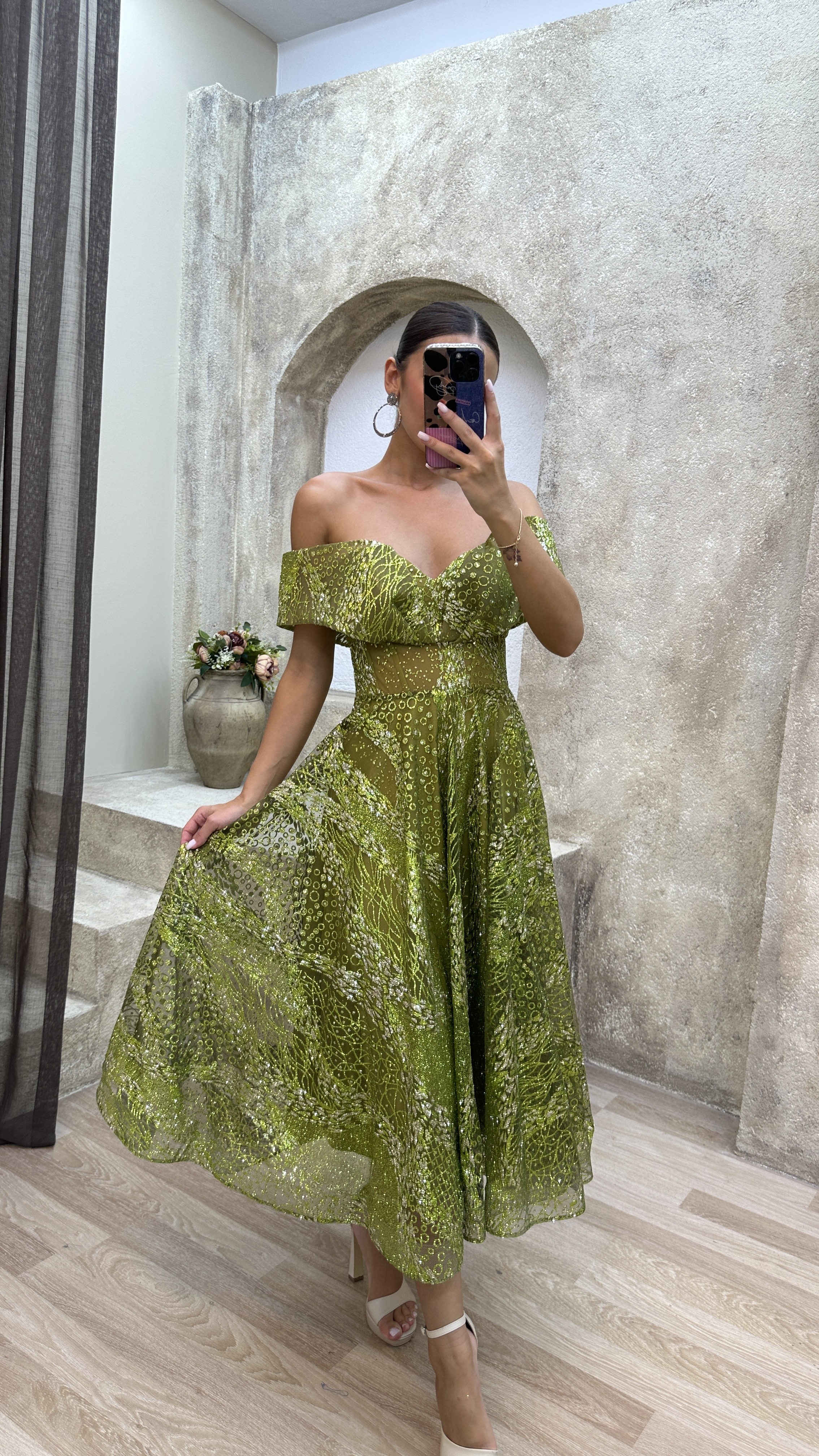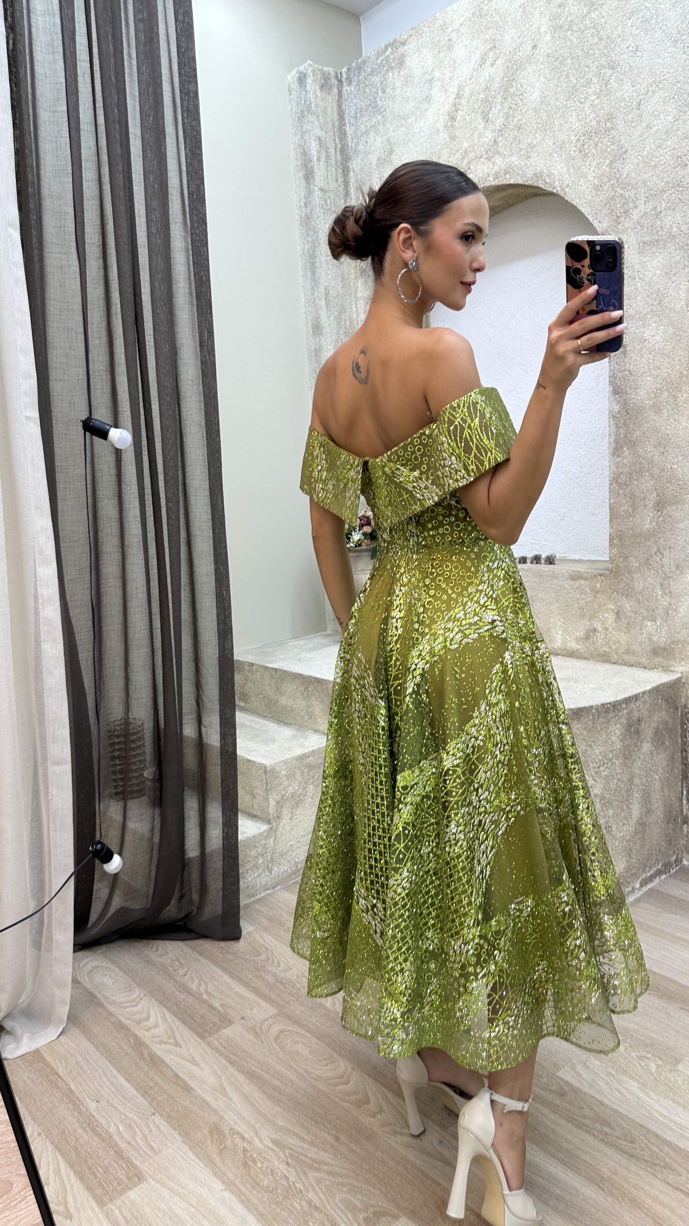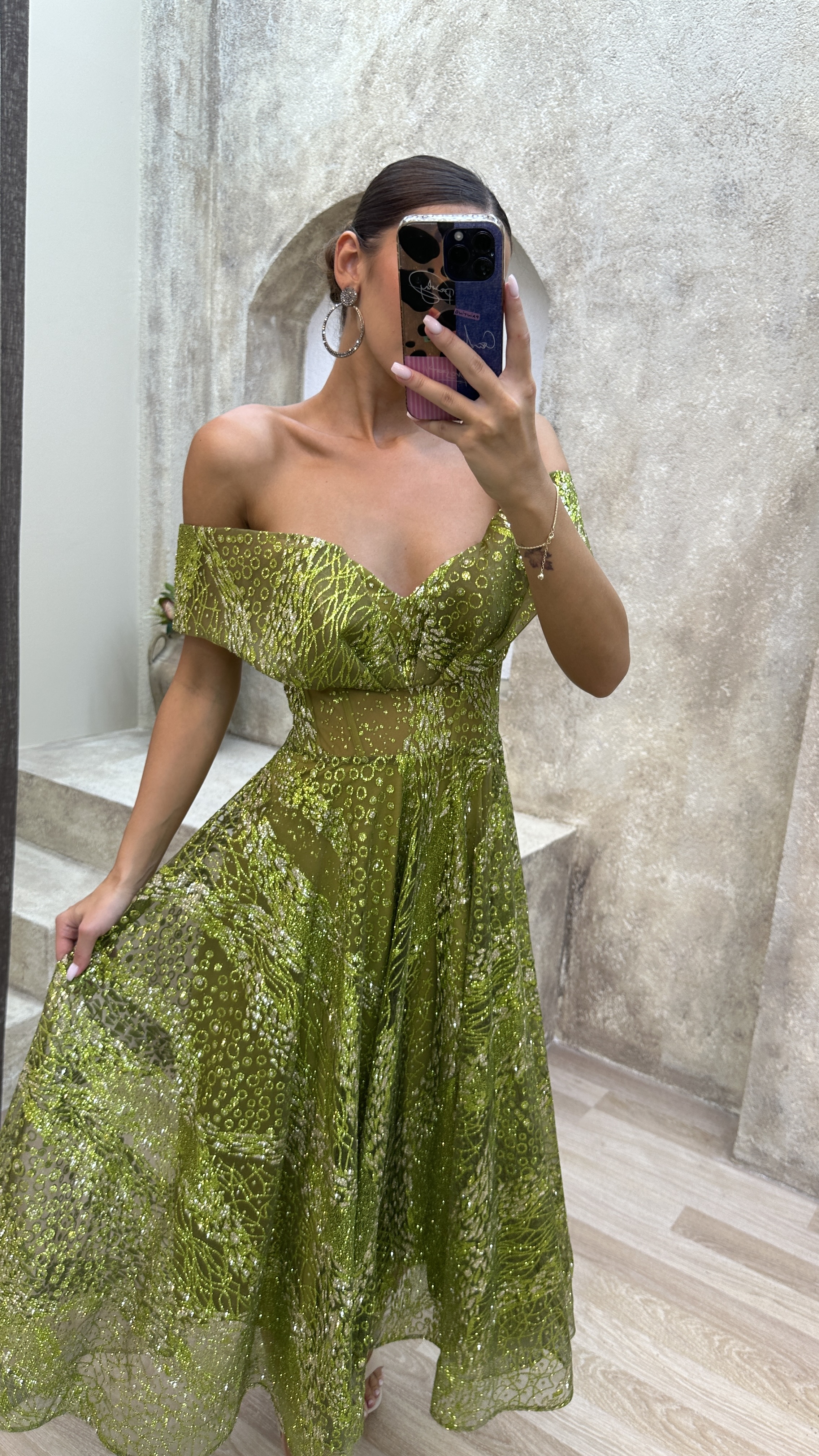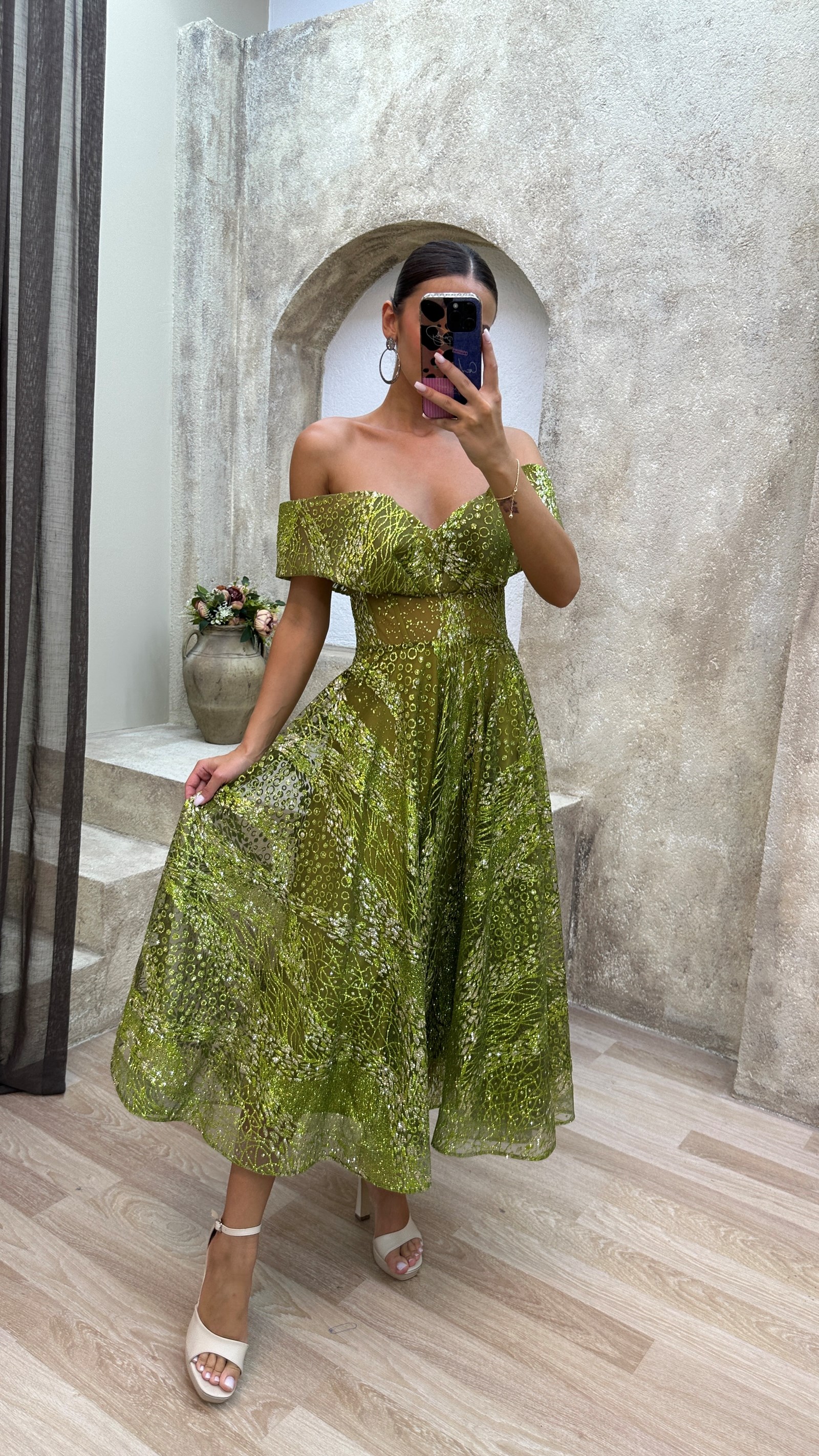 • Sarı Straplez Göğüs İşlemeli Detay Elbise