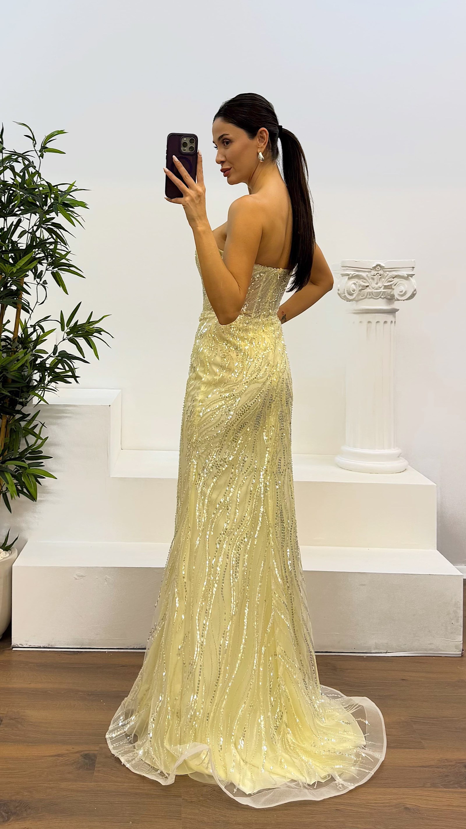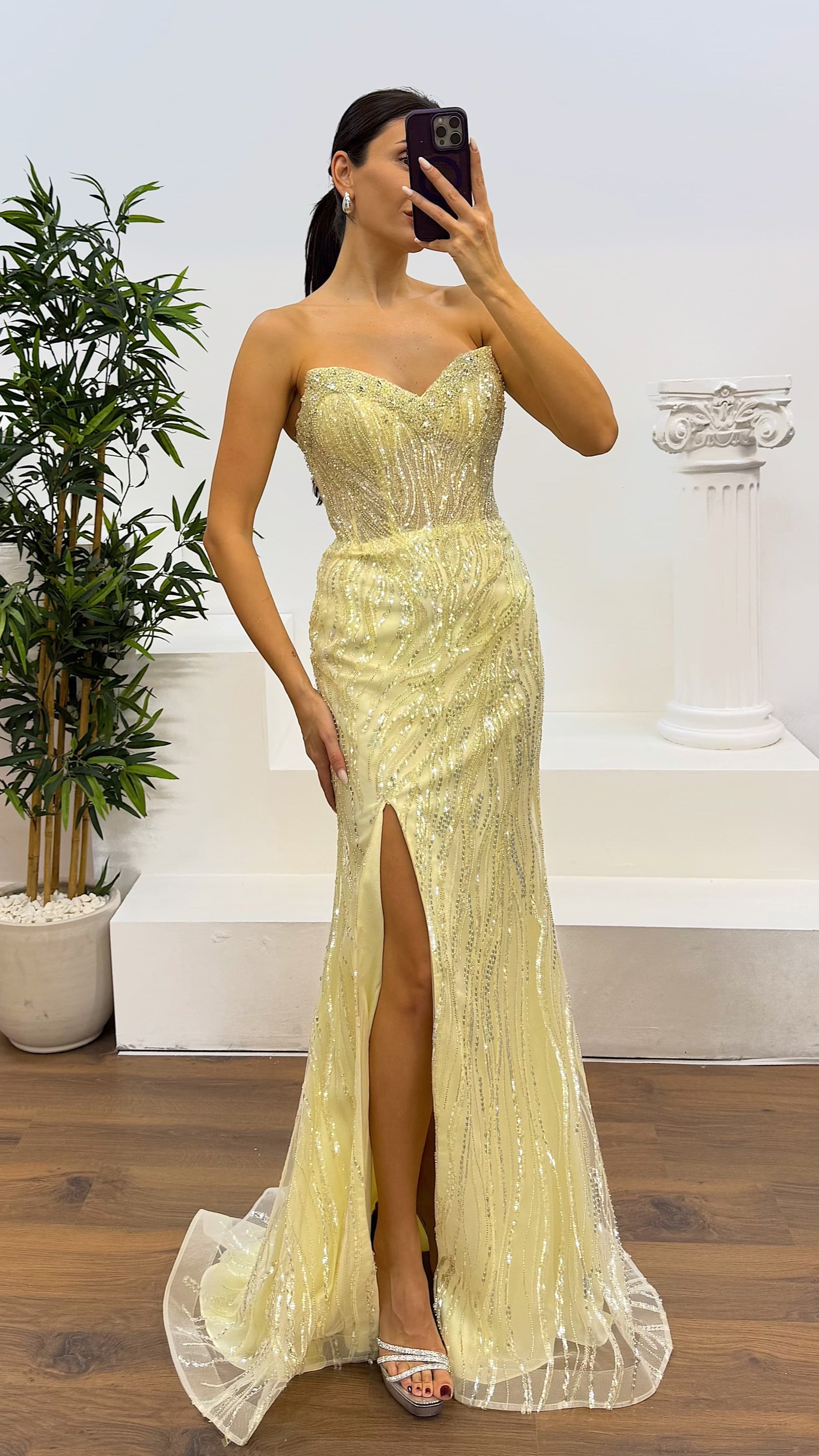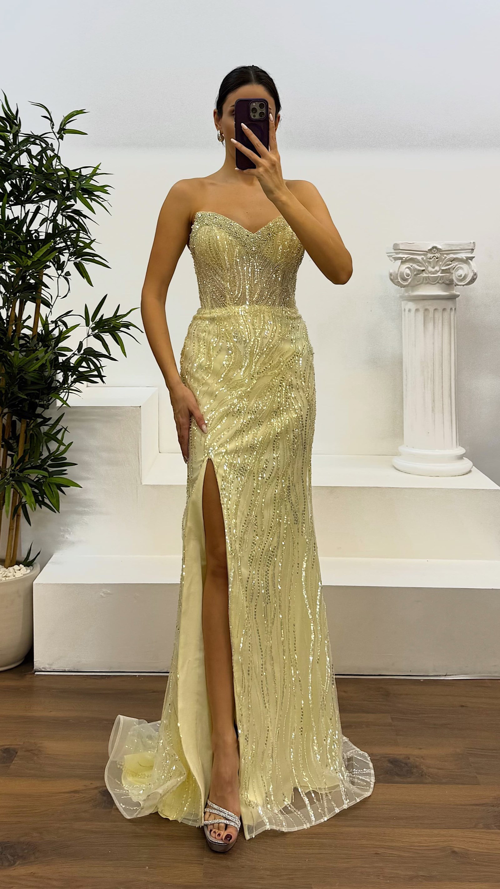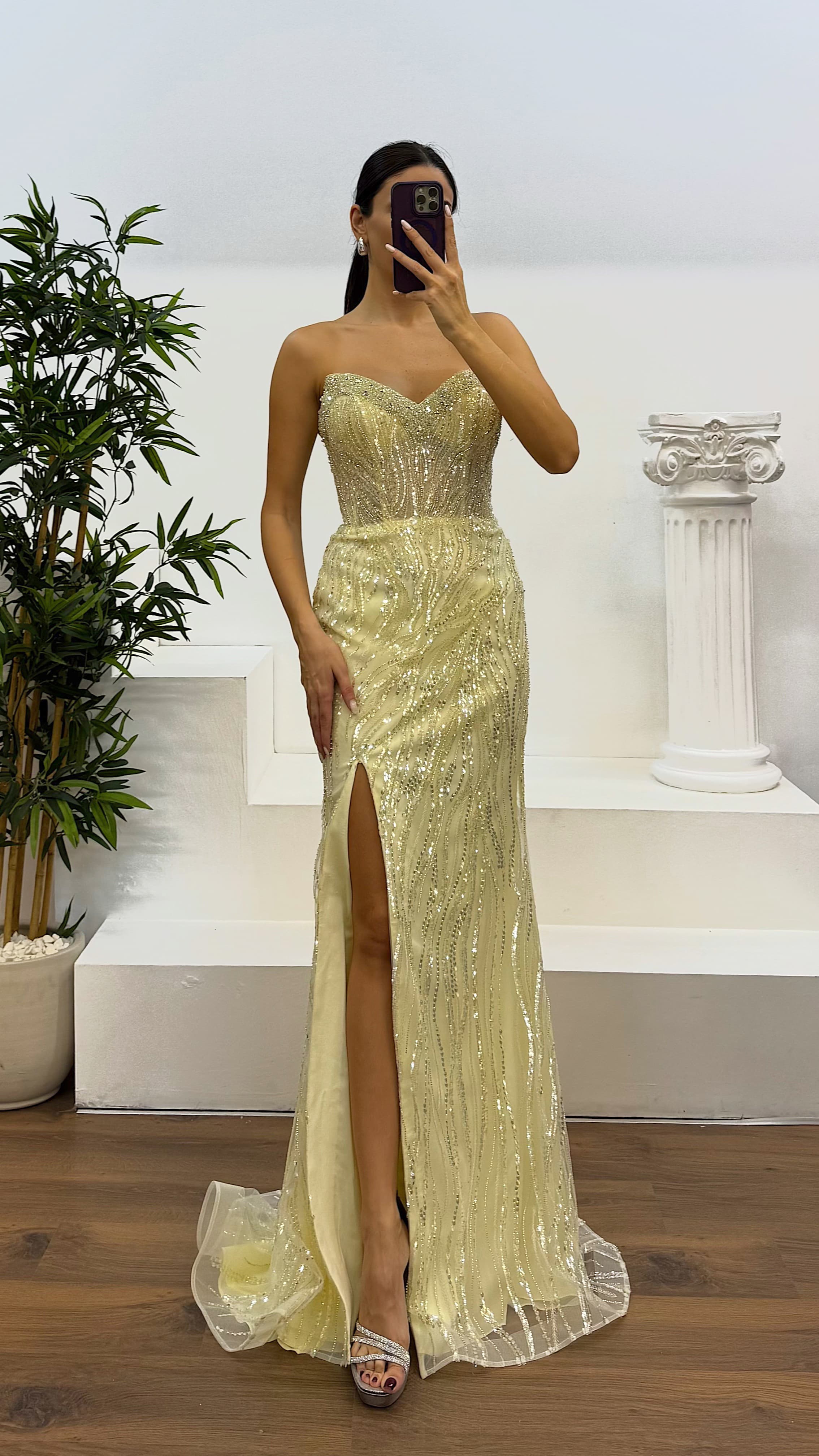 Straplez işlemeli tasarım abiye elbise