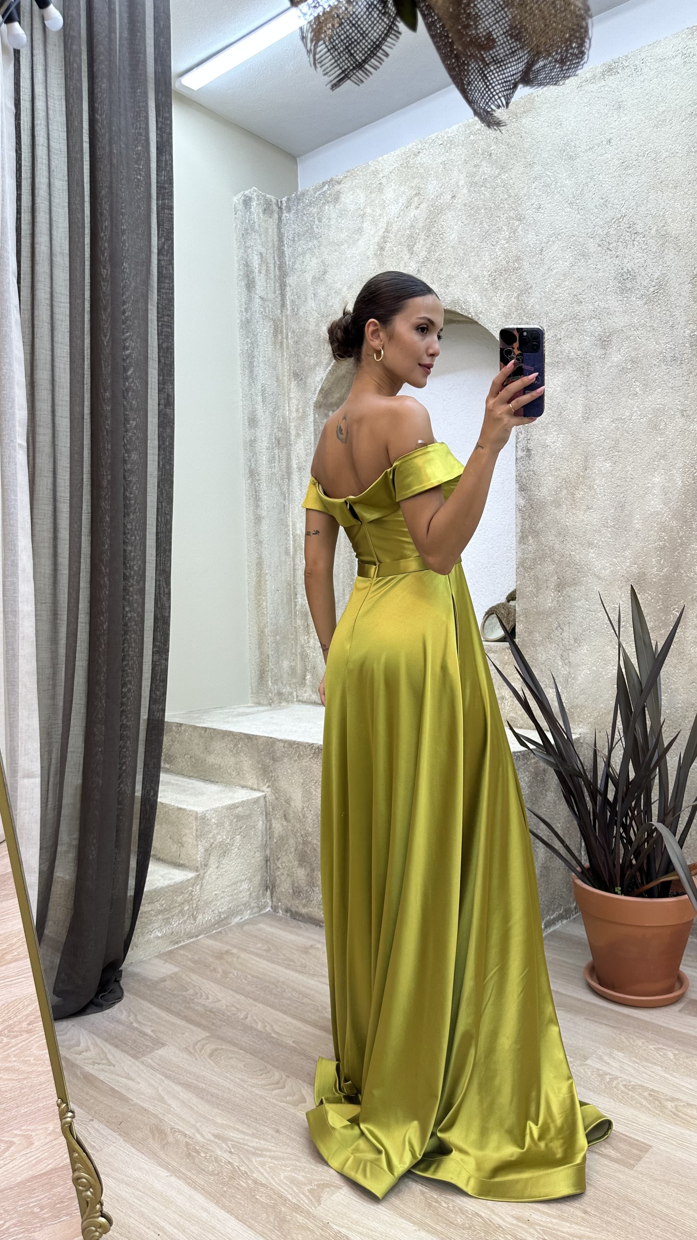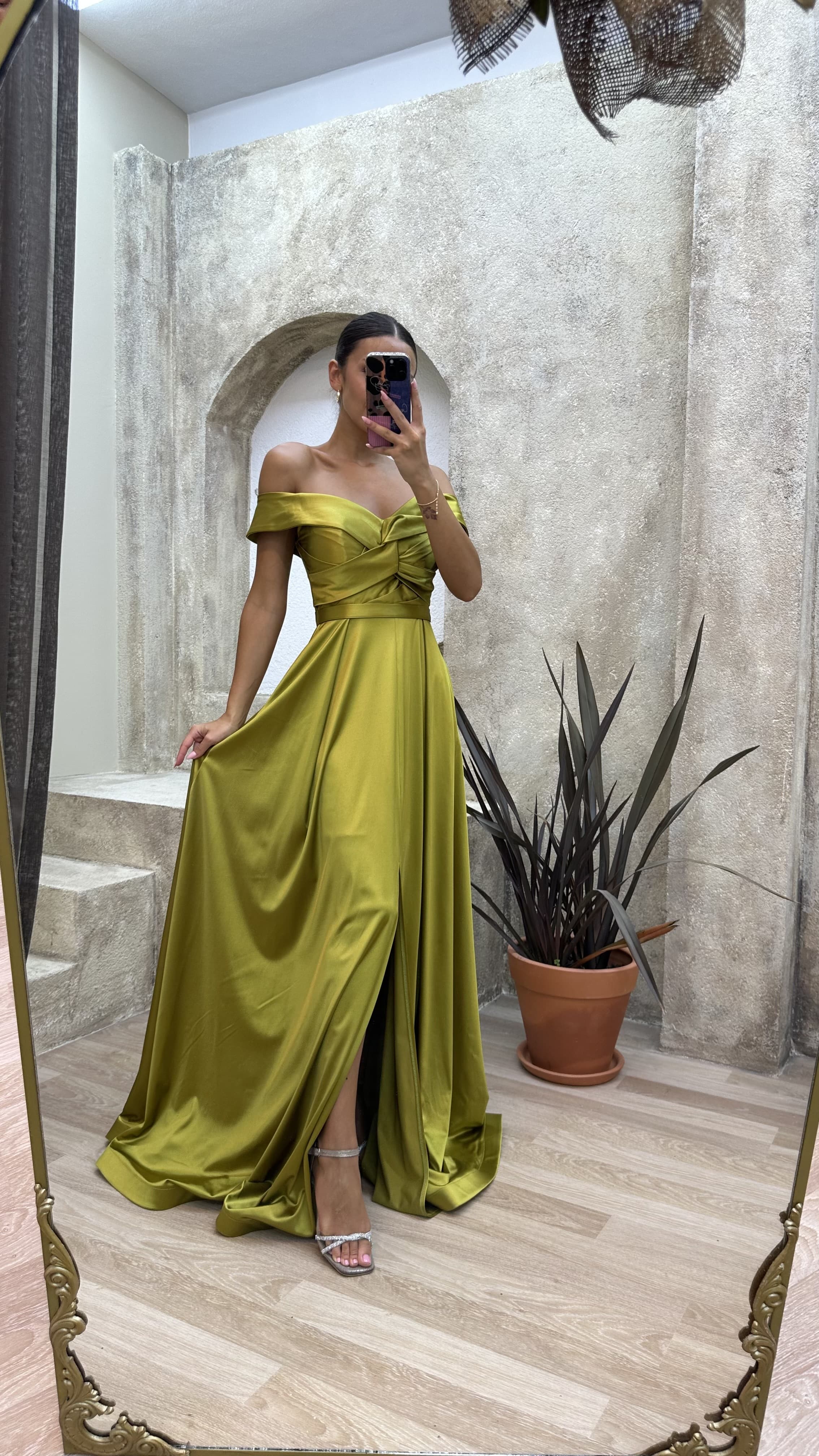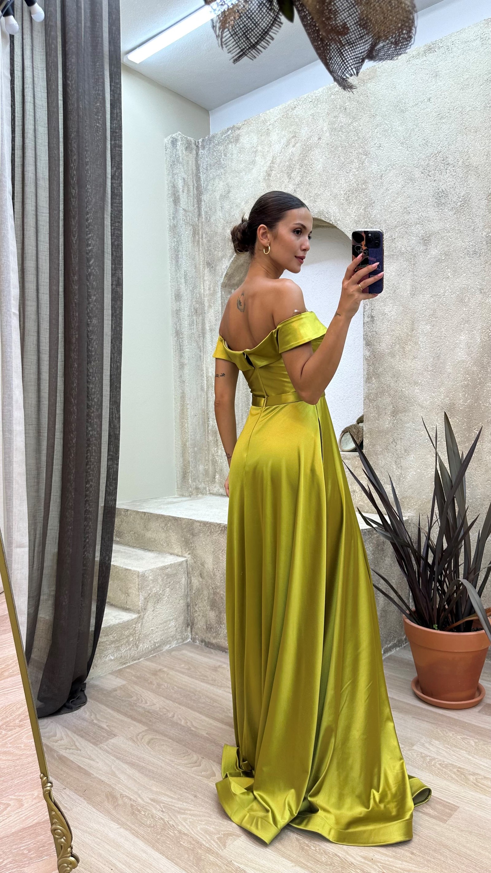• Sarı Straplez Kayık Yaka Çapraz Detay Saten Abiye Elbise