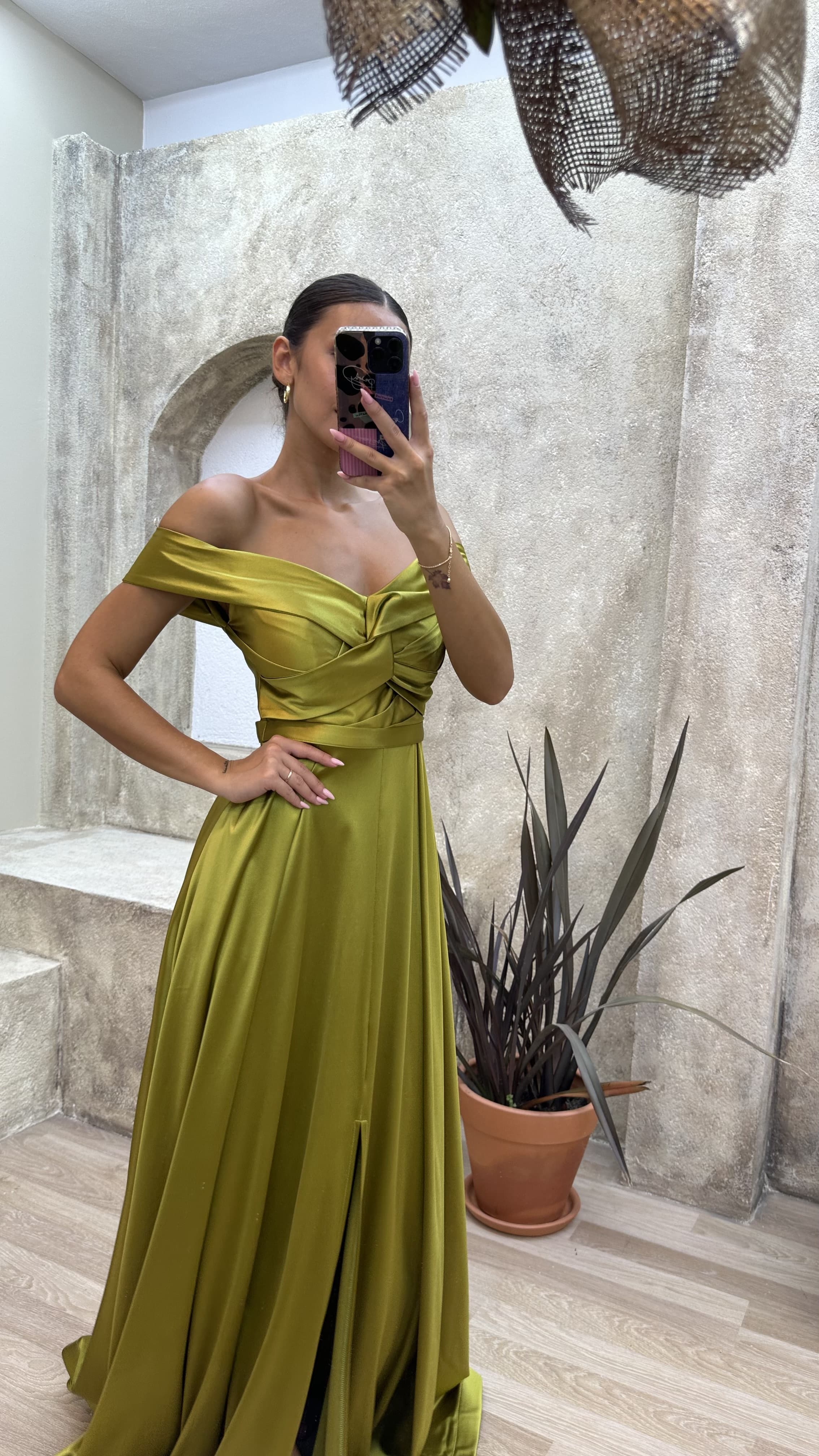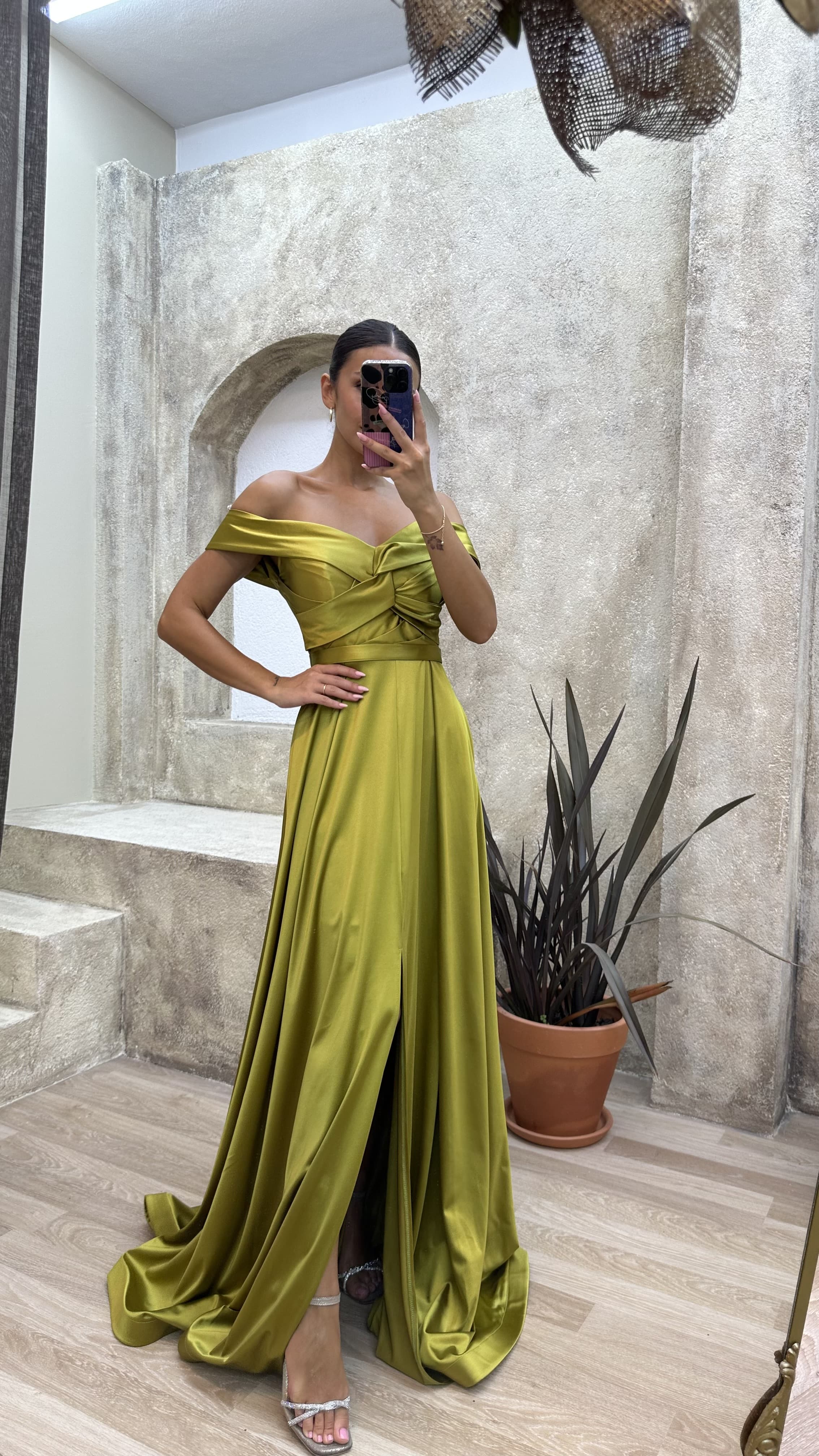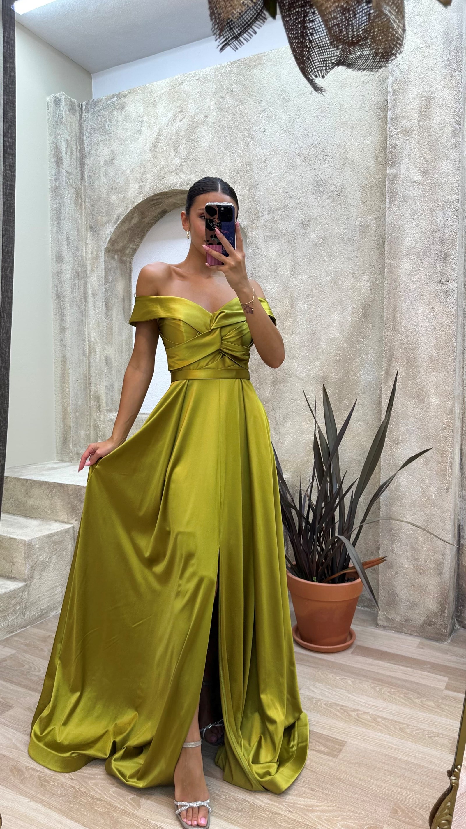 • Sarı Straplez Kayık Yaka Çapraz Detay Saten Abiye Elbise