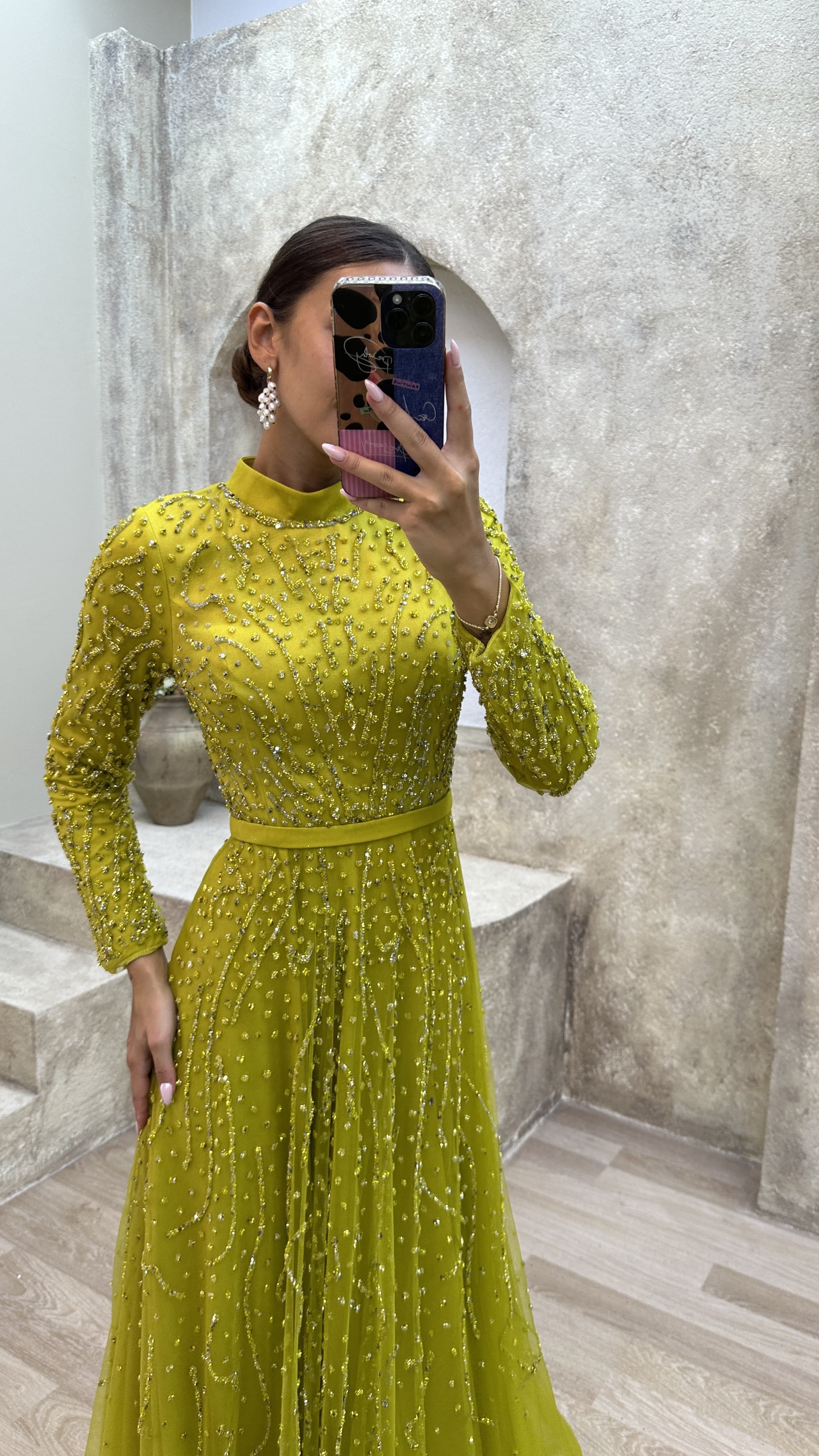 Sarı Taş İşlemeli Tül Tesettür Abiye Elbise