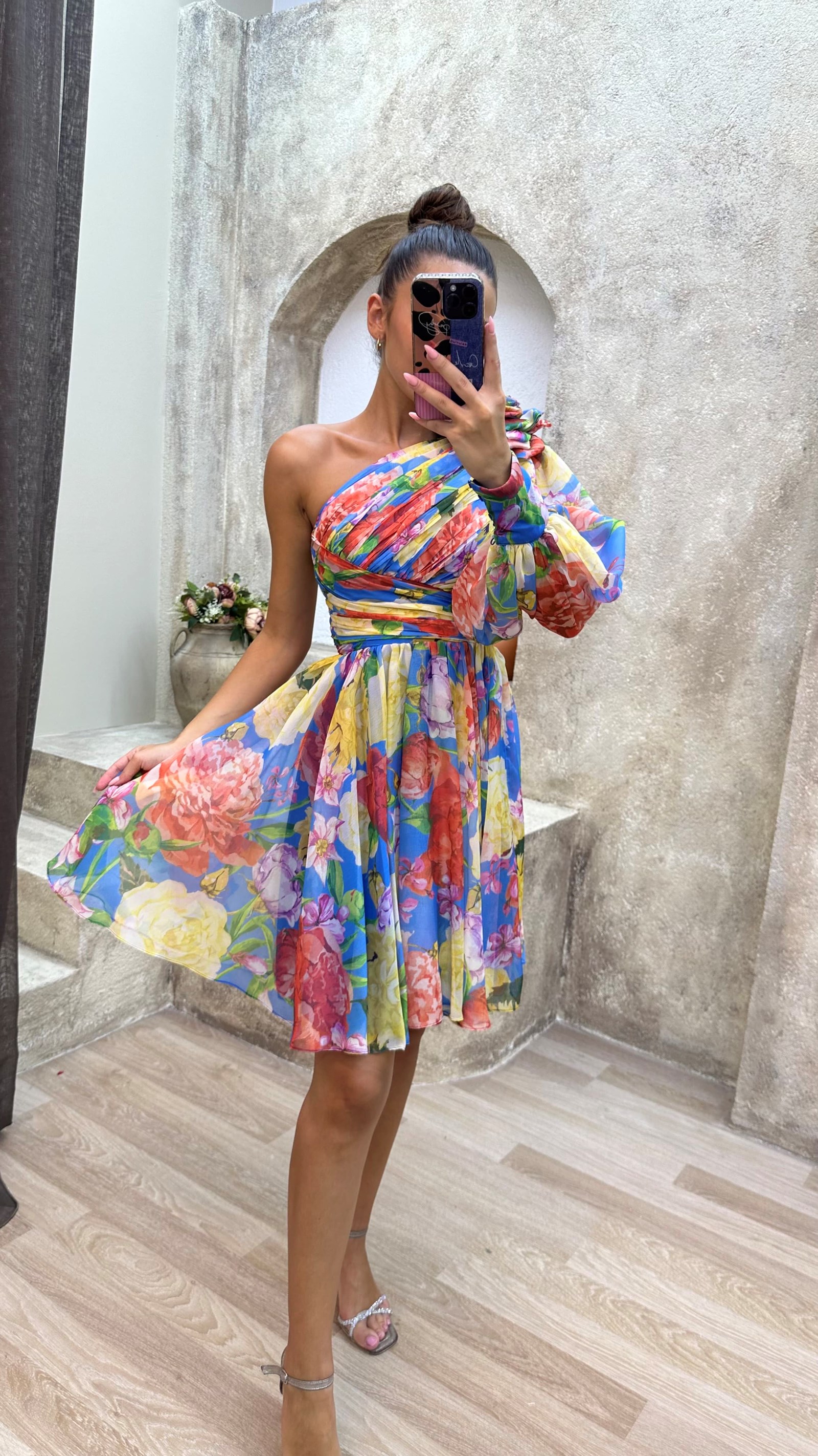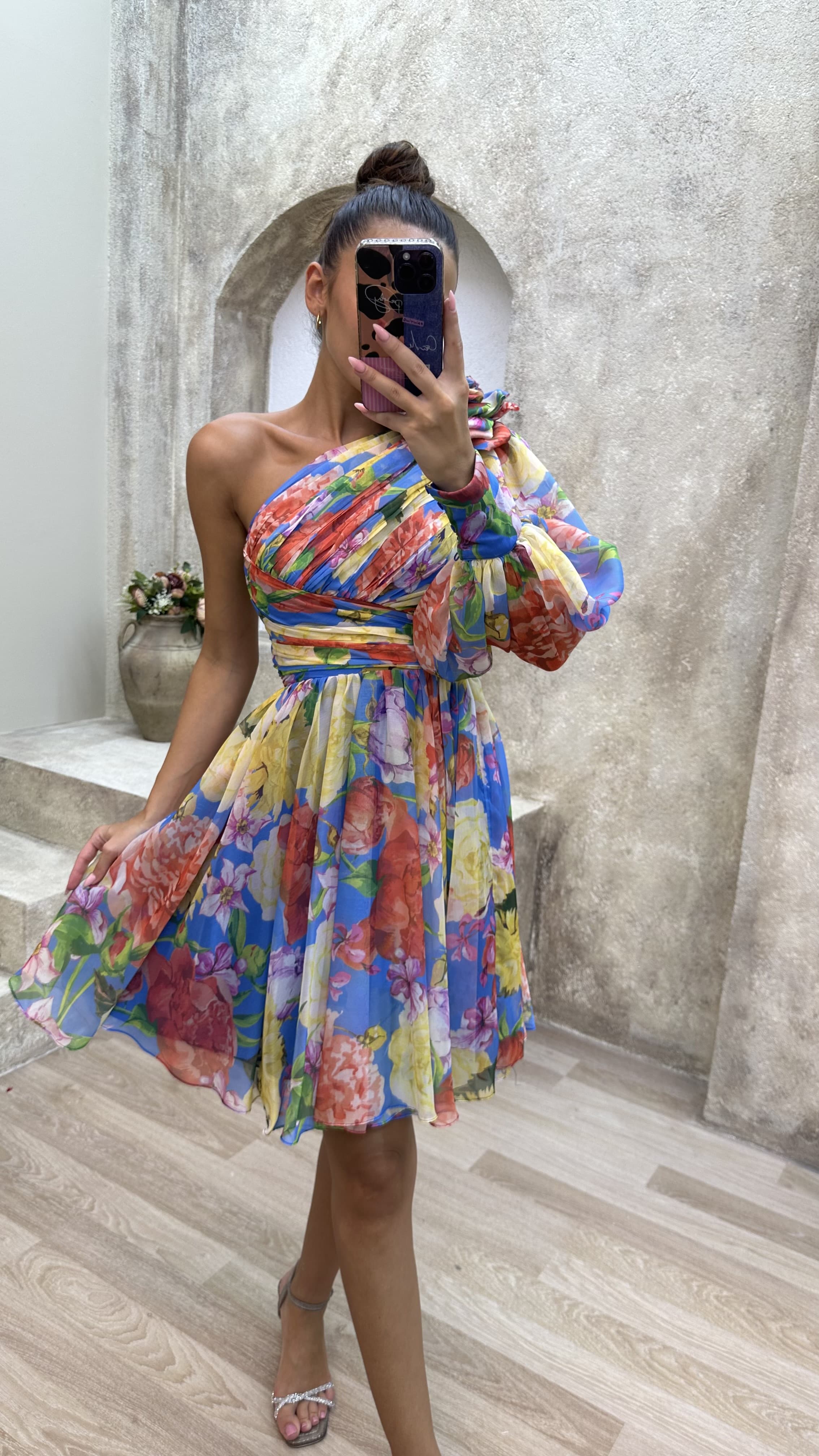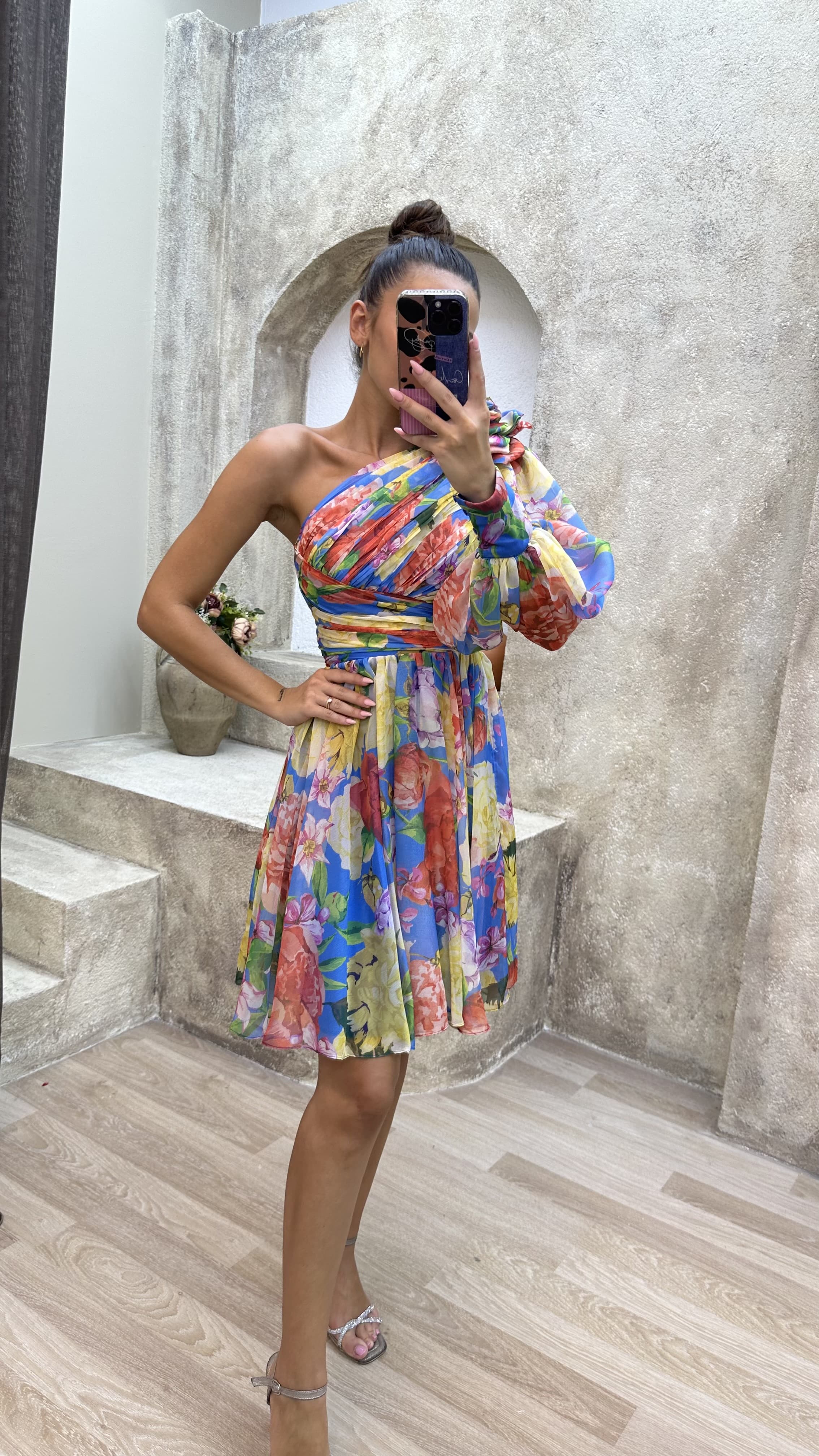 Sarı Tek Kol Omuz Detay Çiçekli Mini Elbise