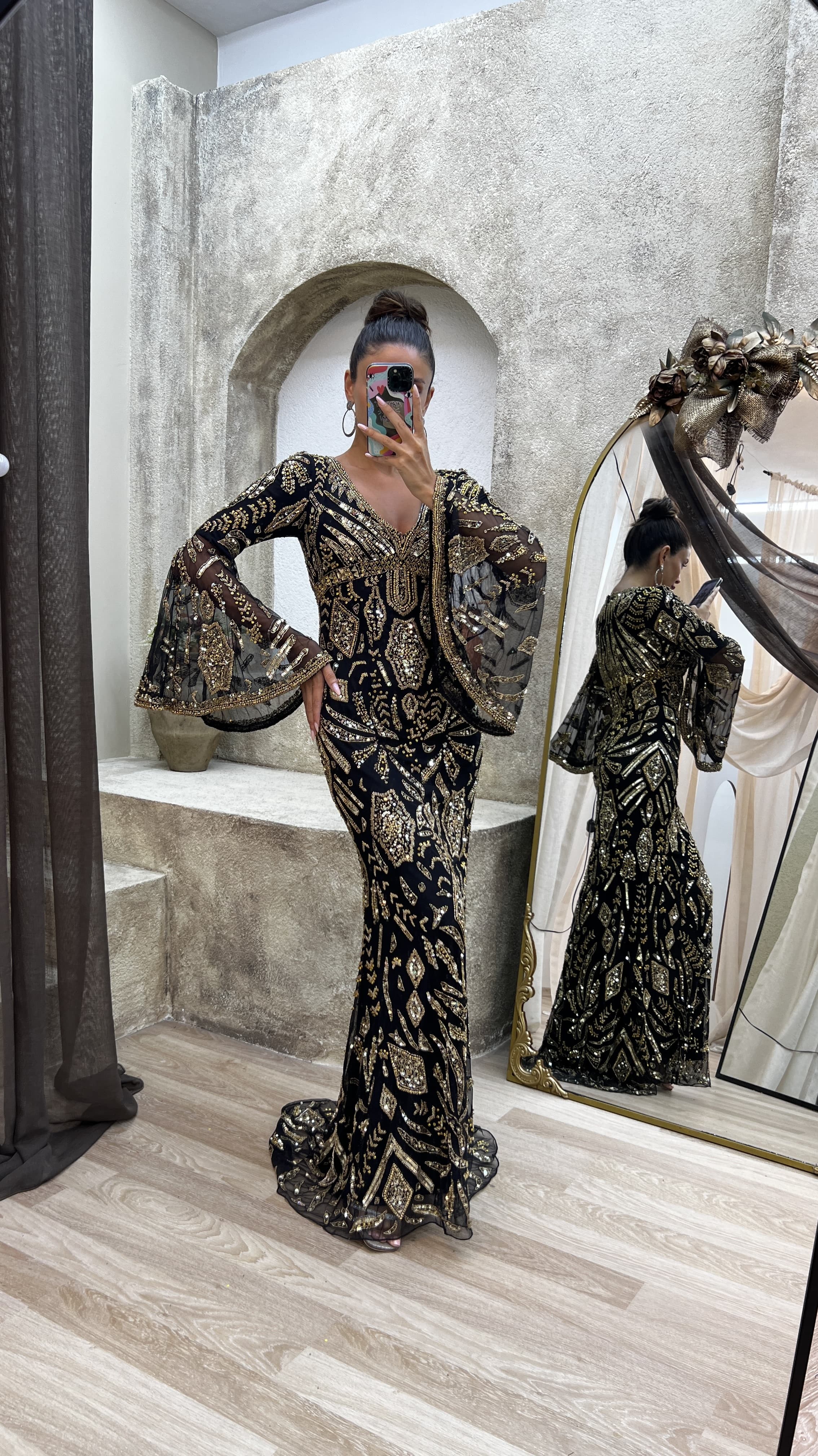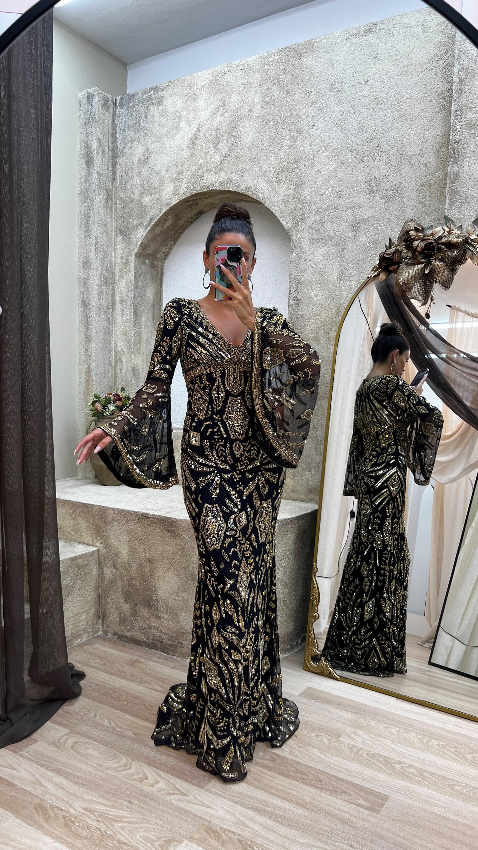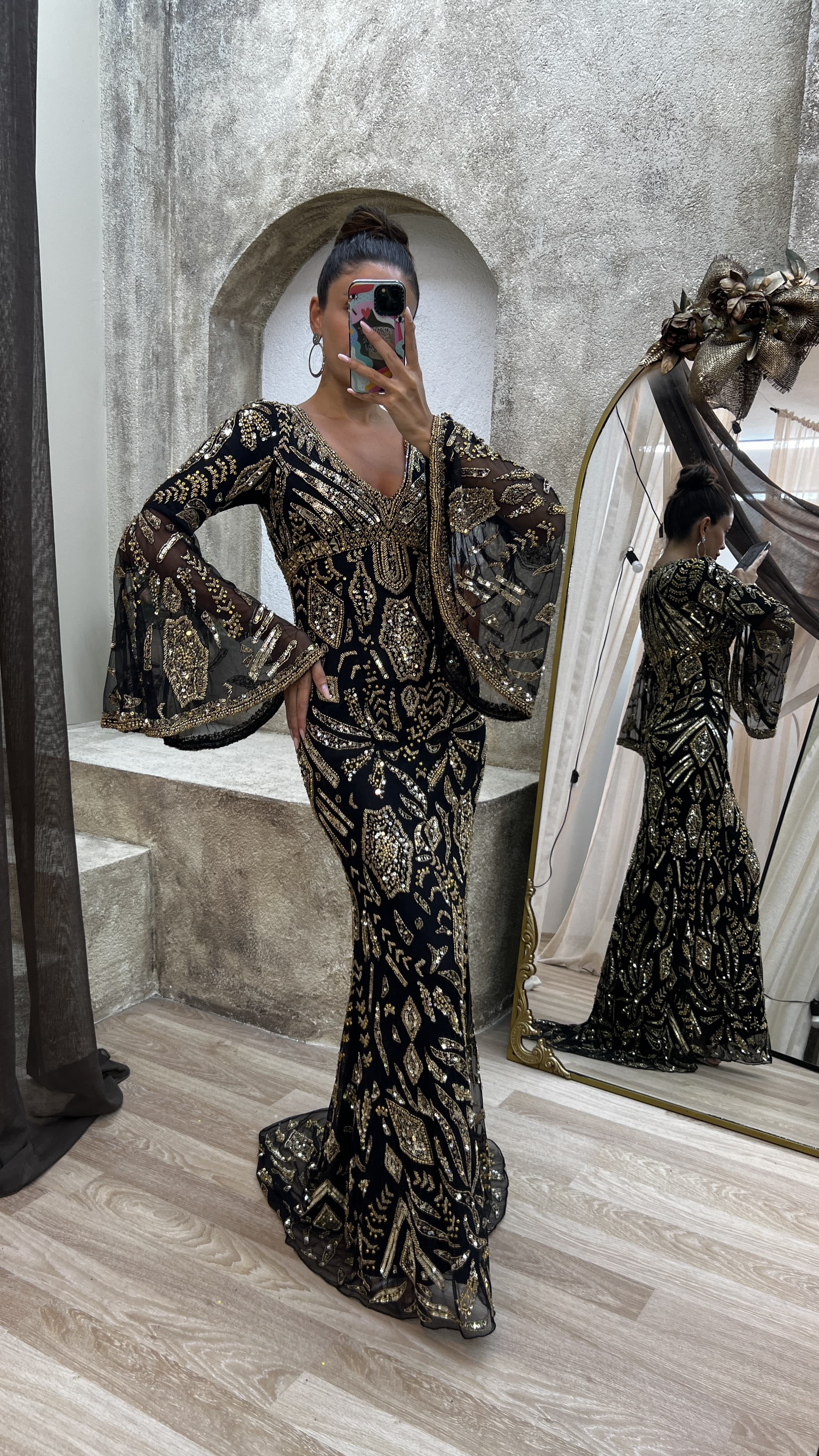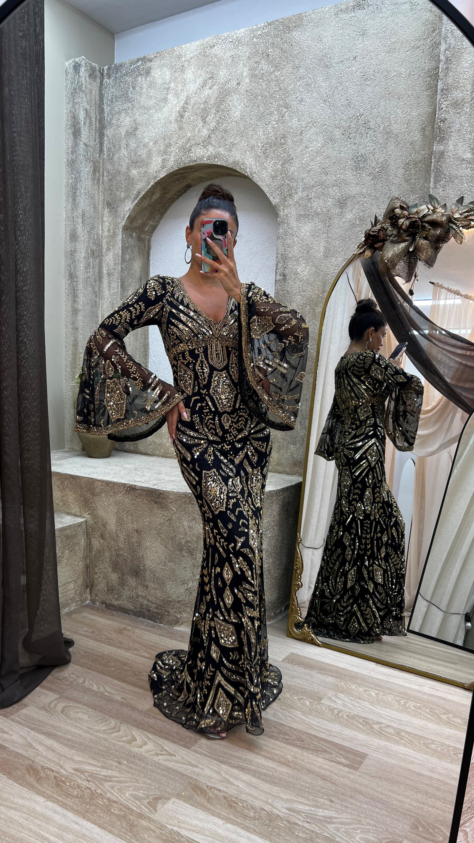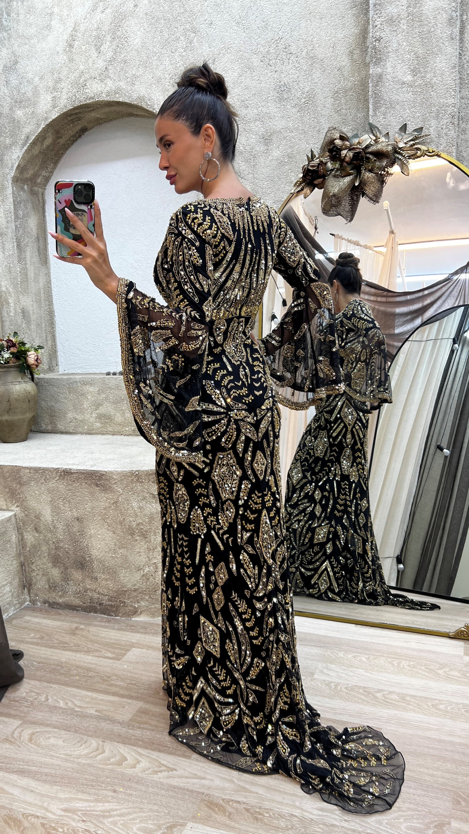 • Siyah Gold V Yaka El İşlemesi Tasarım Abiye Elbise