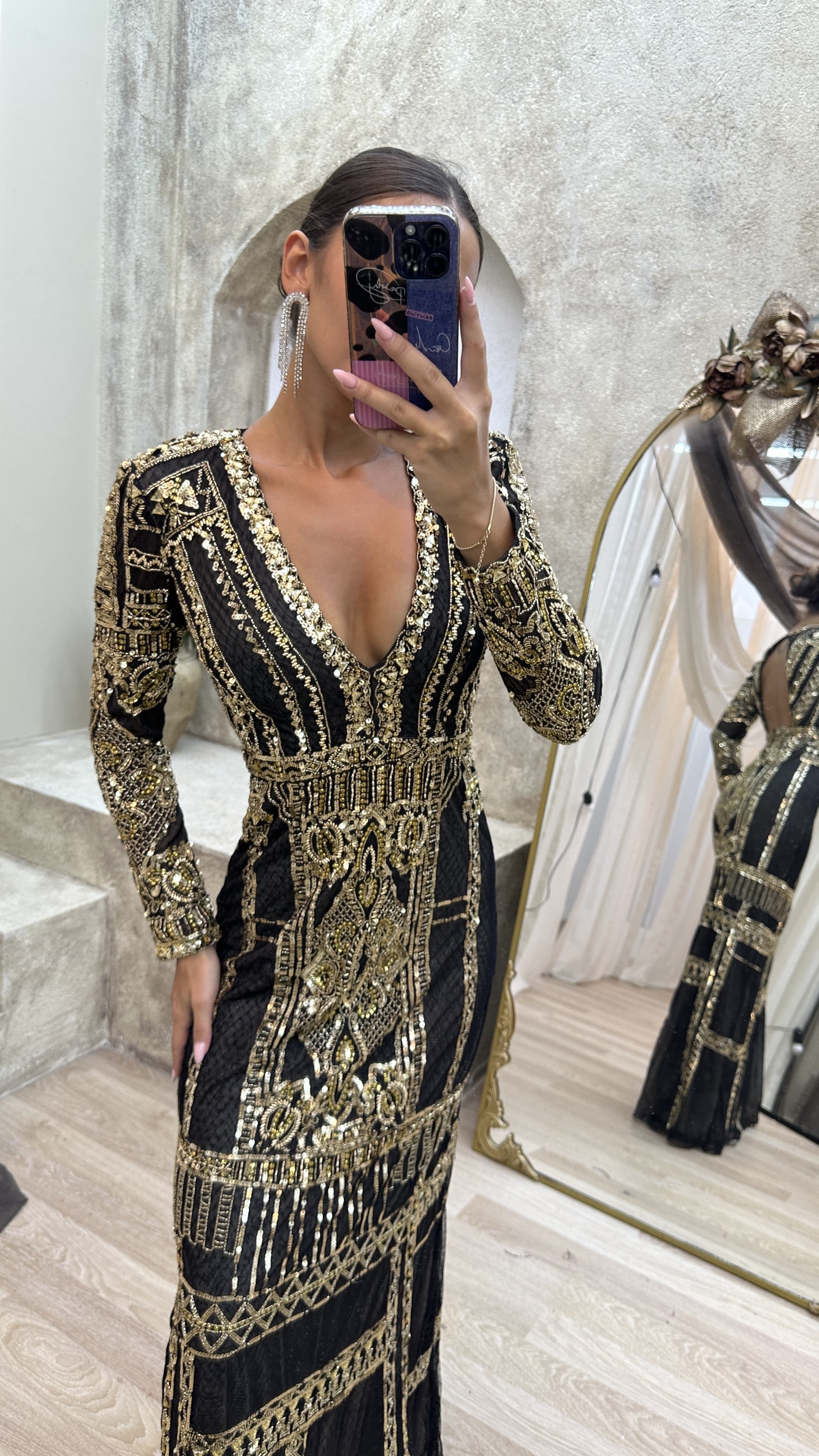 • Siyah Gold Sırt Detay El İşlemesi Abiye Elbise
