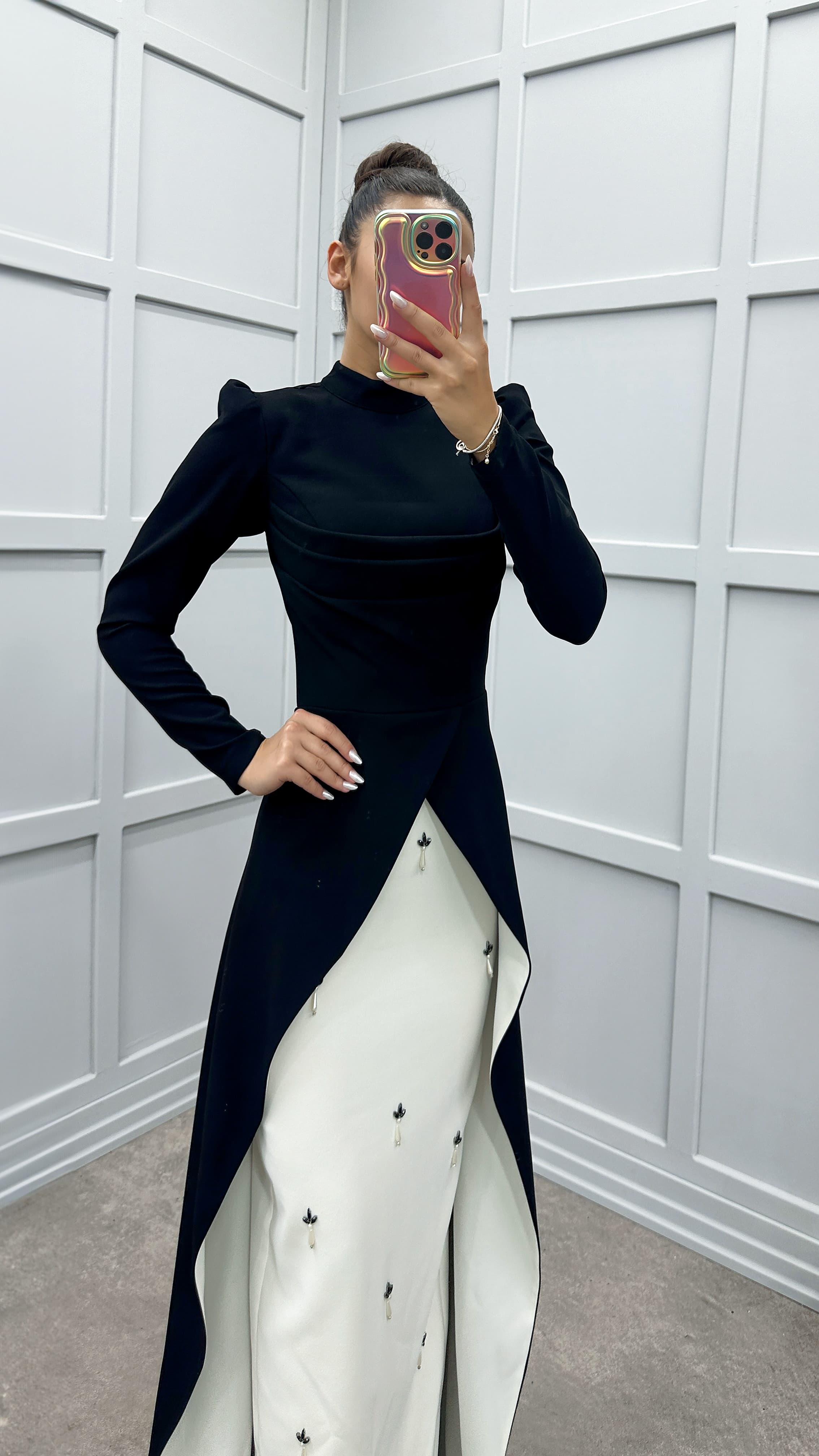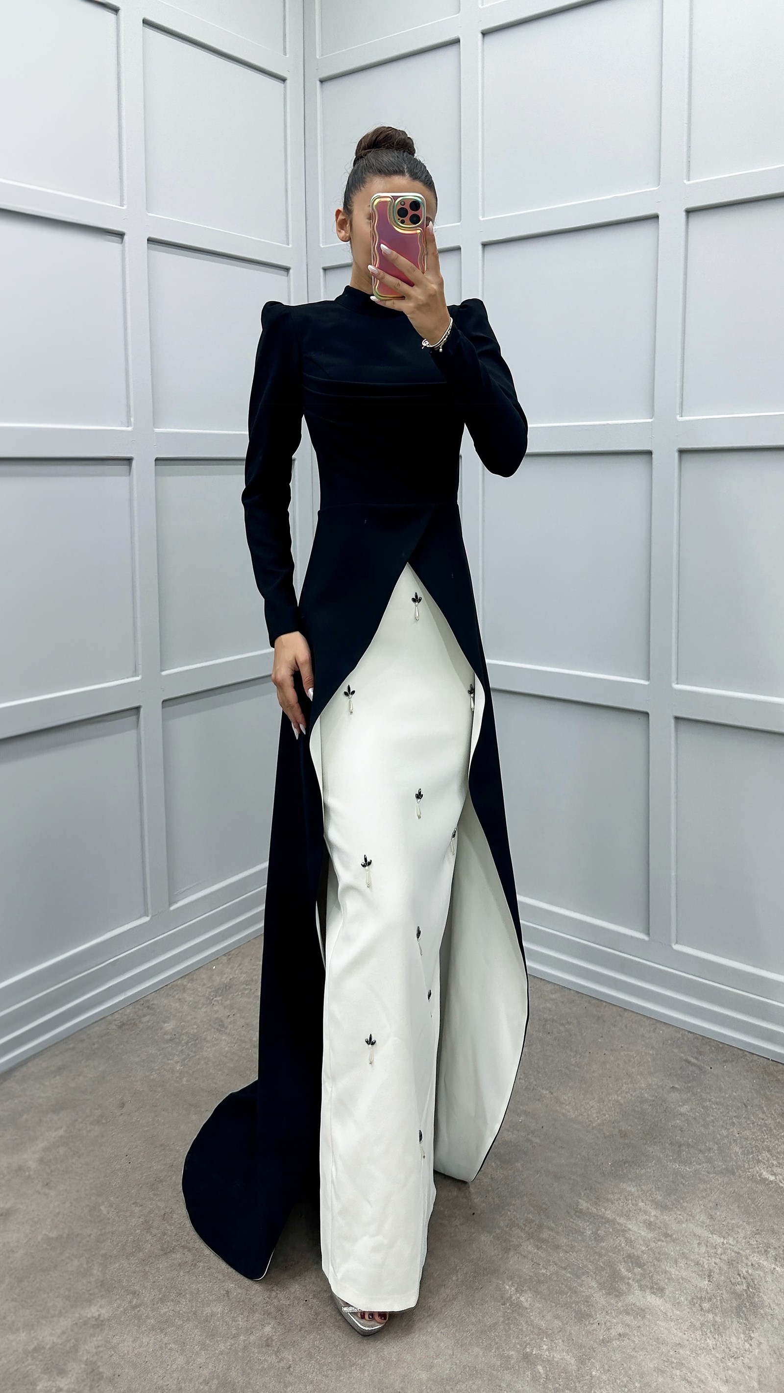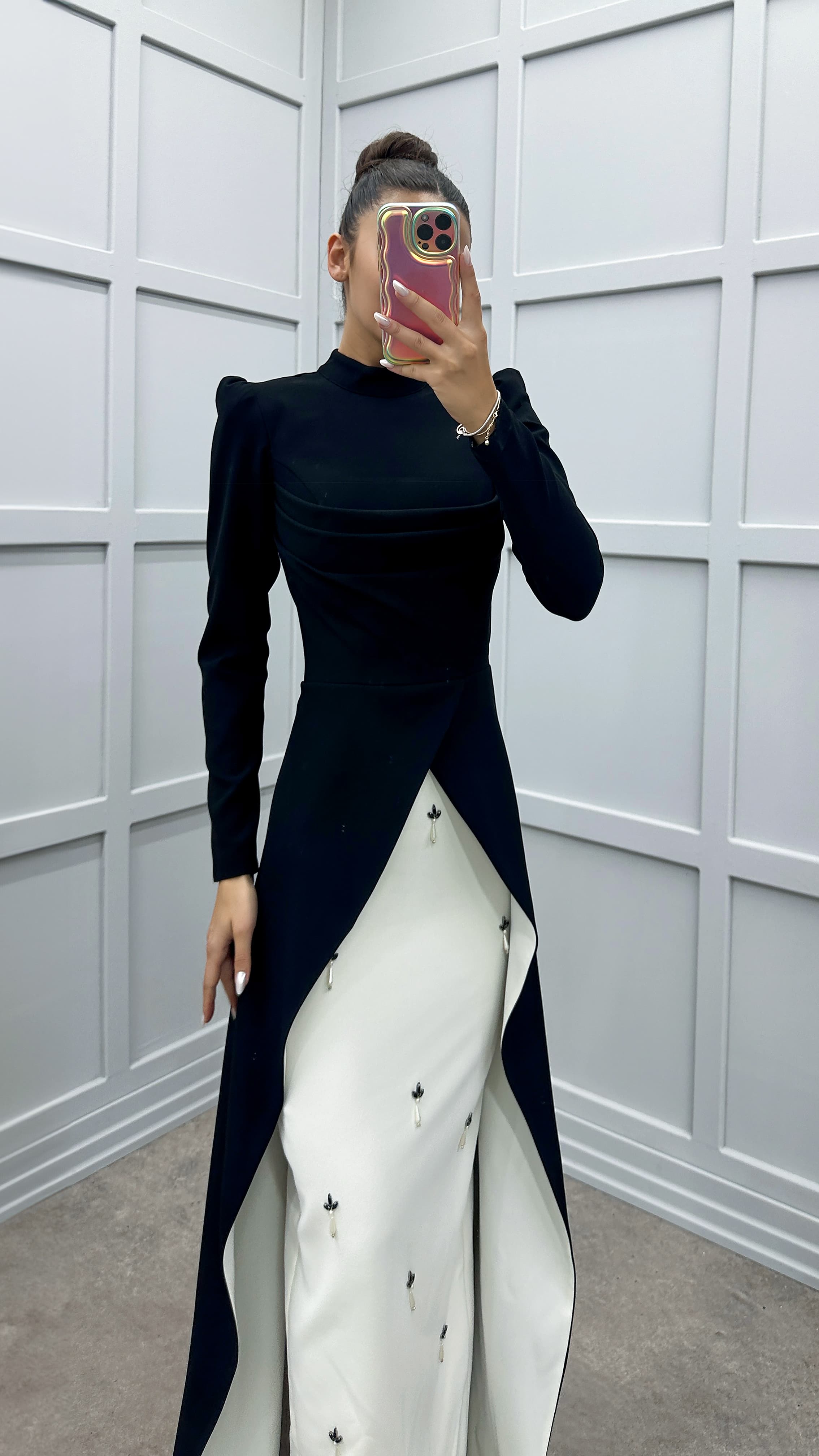 • Siyah Asimetrik Kesim İşlemeli Tasarım Abiye Elbise