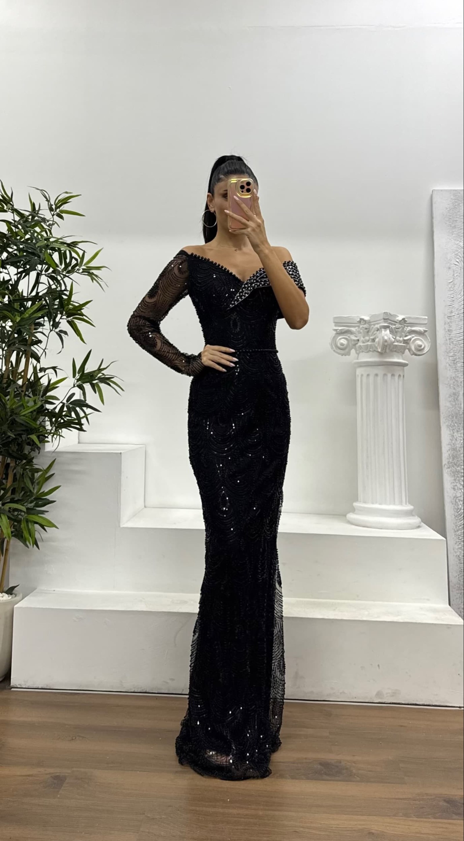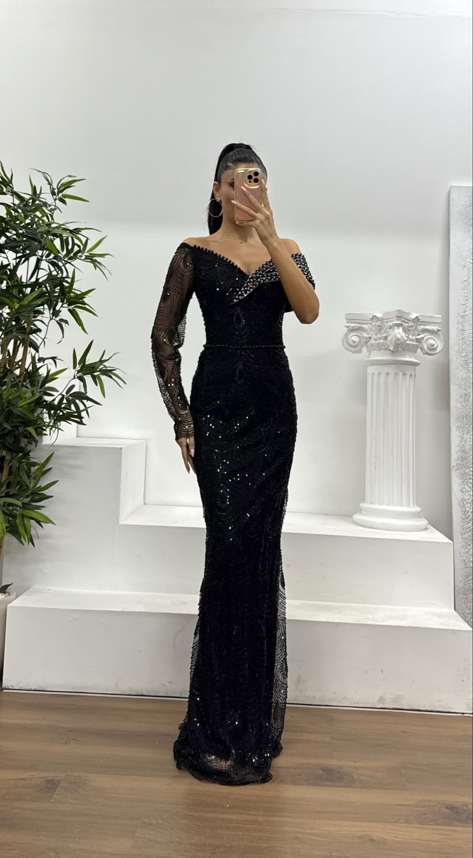 • Siyah Asimetrik Yaka İşlemeli Abiye Elbise