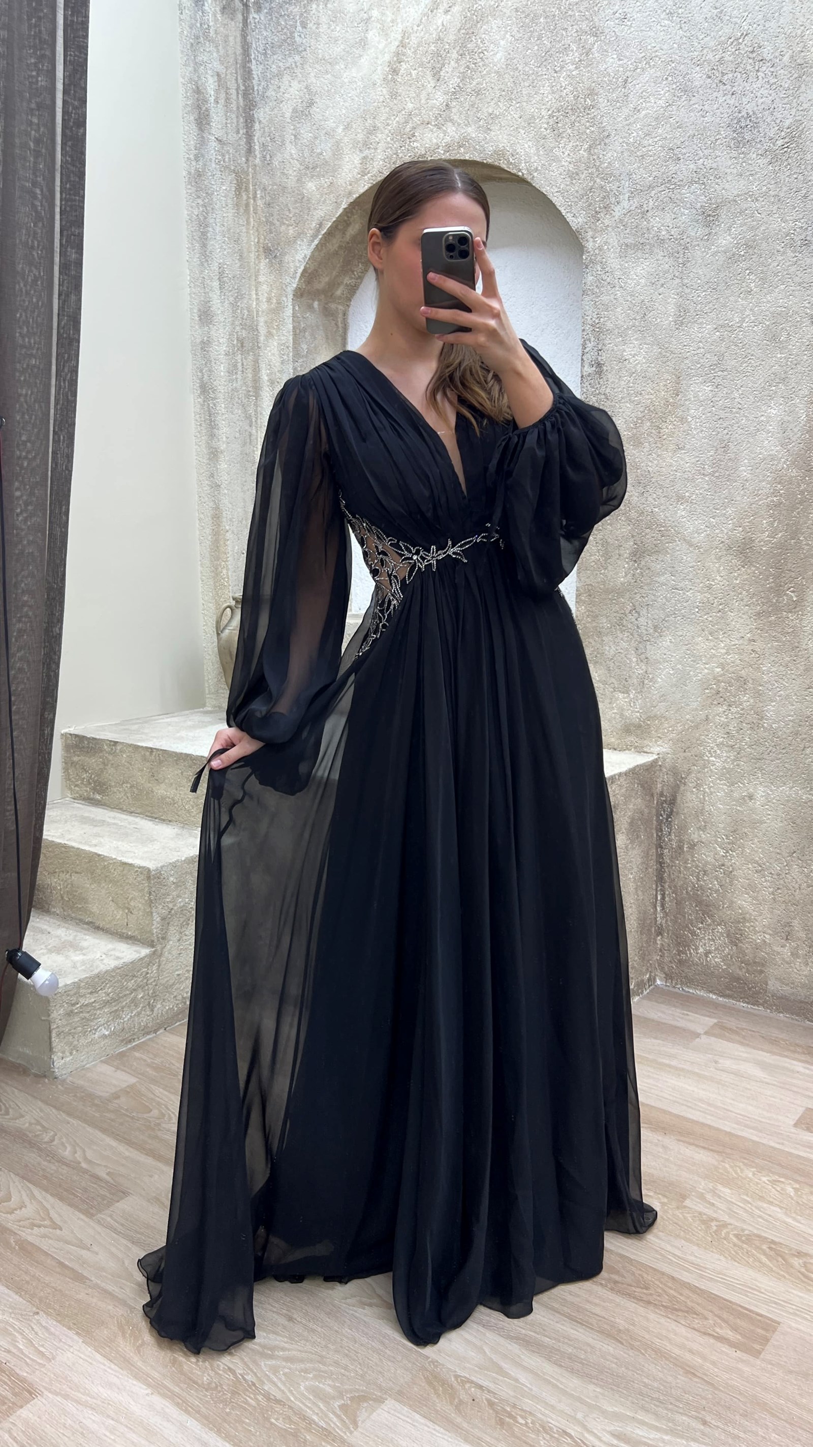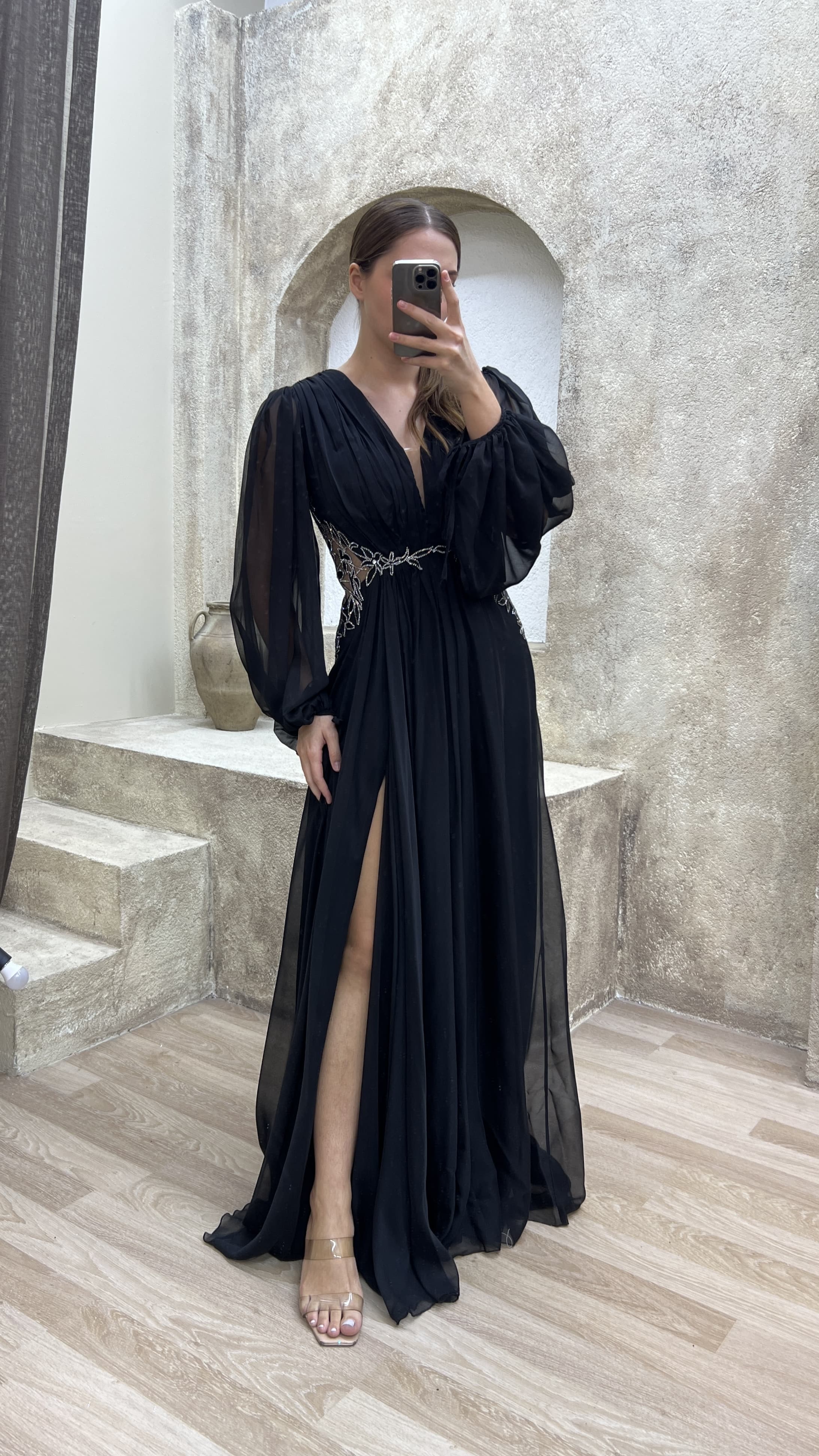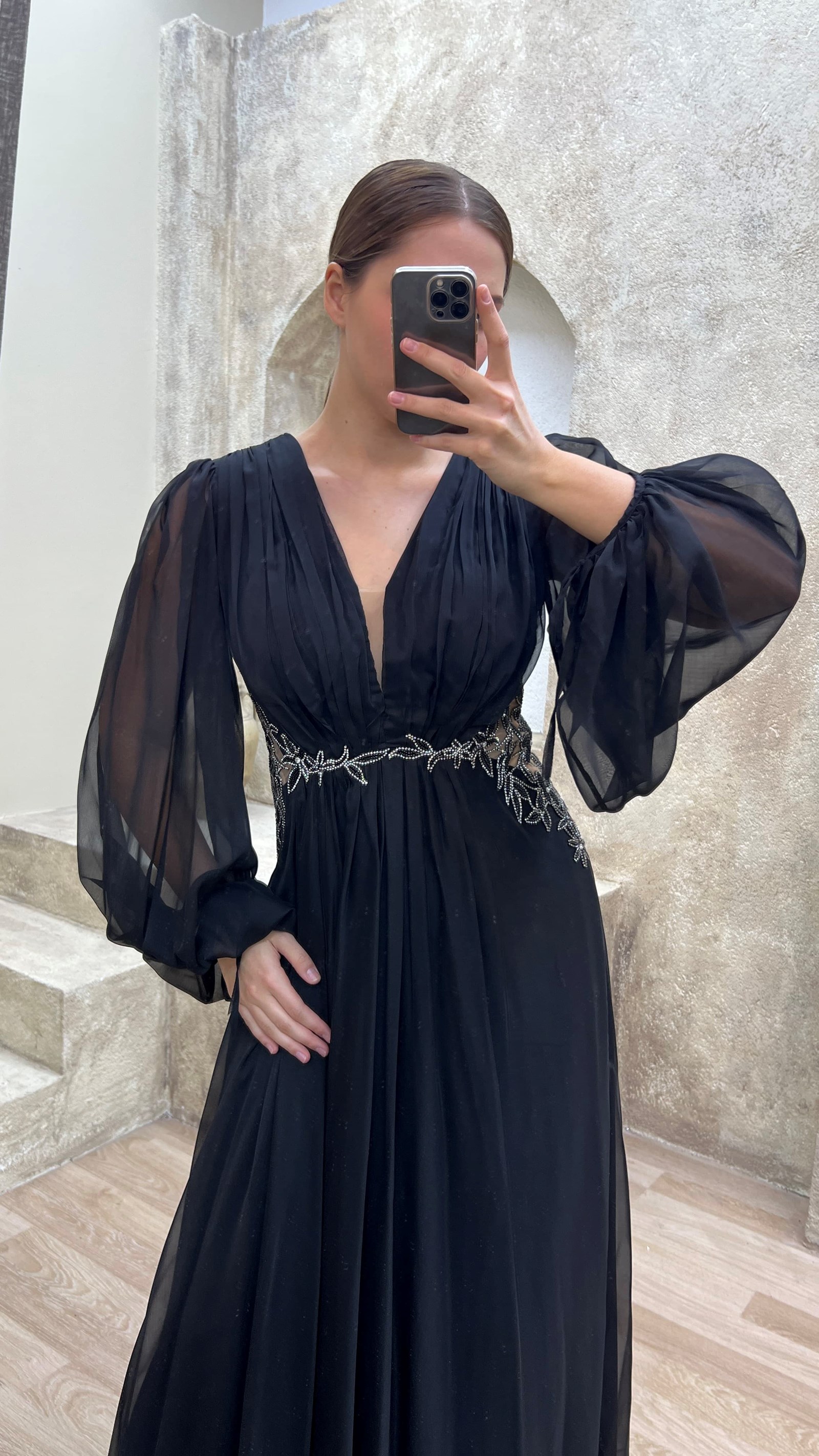 Siyah Balon Kol Bel Detay İşlemeli Tasarım Şifon Büyük Beden Abiye Elbise