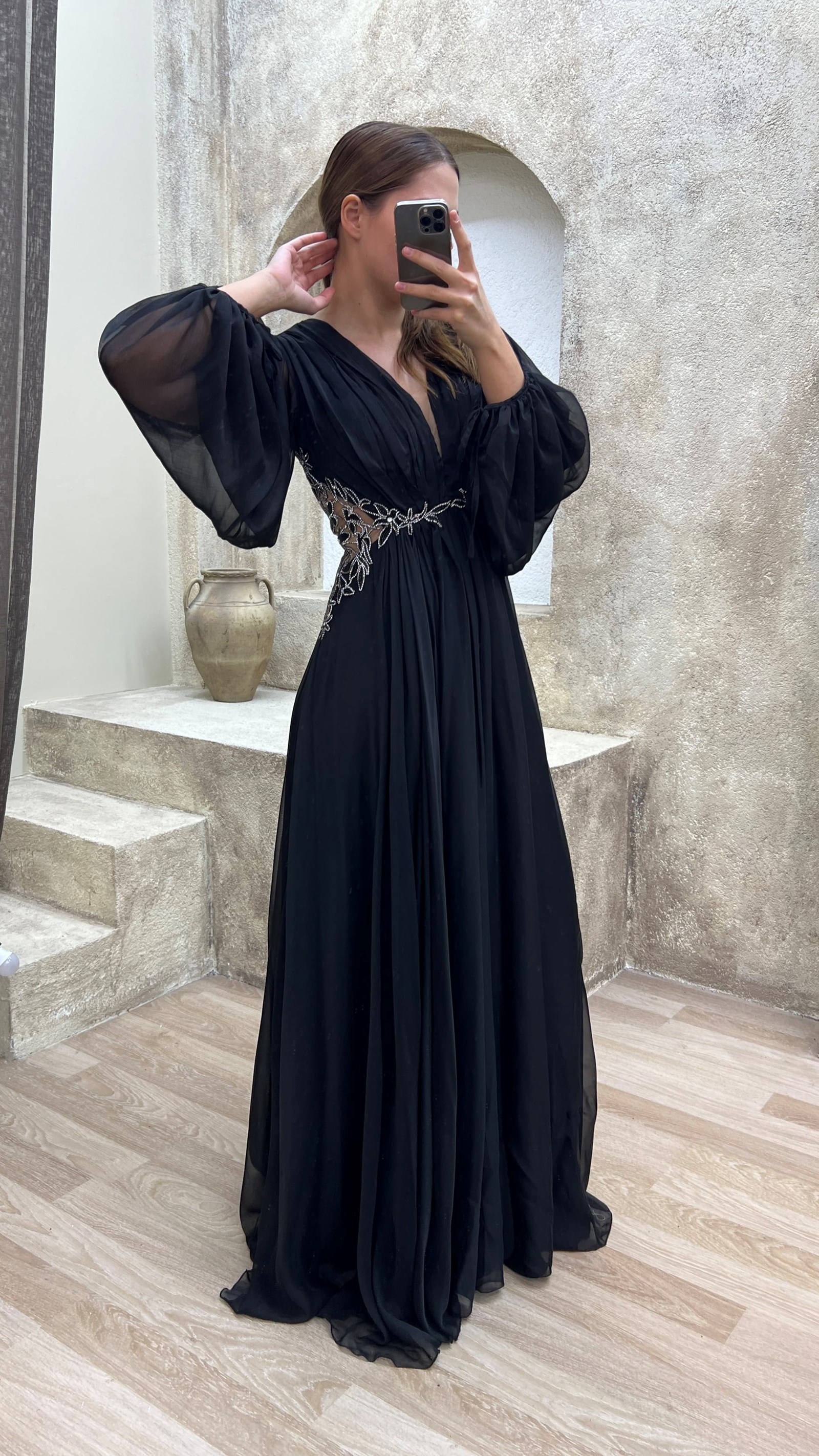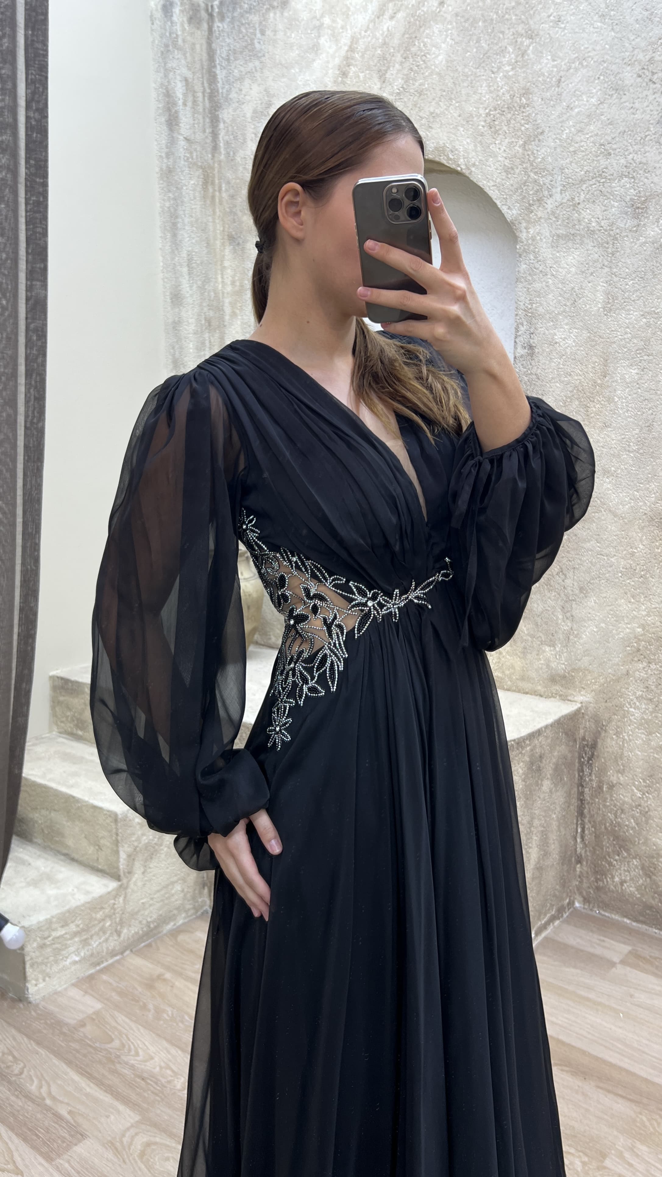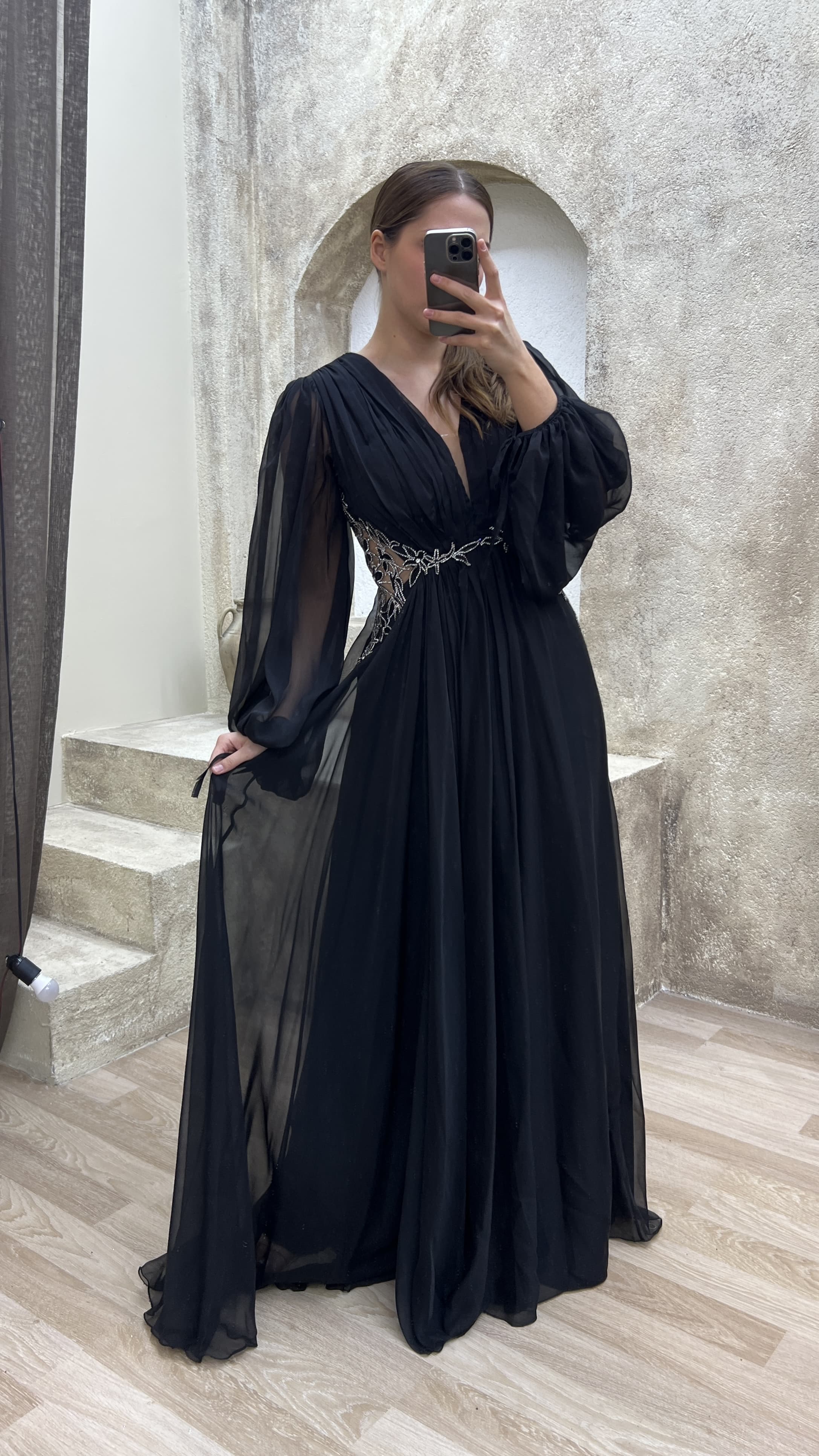 Siyah Balon Kol Bel Detay İşlemeli Tasarım Şifon Büyük Beden Abiye Elbise