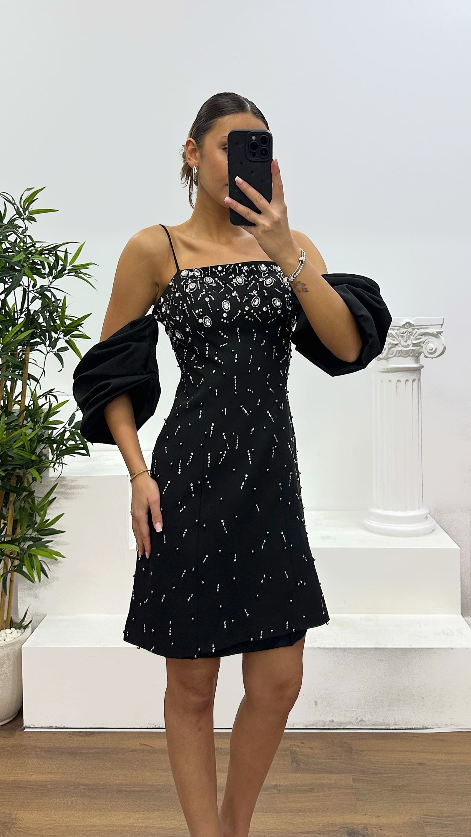 Ürün 36-42 bedene kadar uyumlu, göğüs pedli, astarlı, sırt capraz ip ve fermuar kapamalı, balon kol, işlemeli abiye olarak tasarlanmıştır.